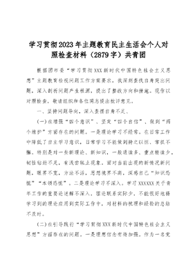 学习贯彻2023年主题教育民主生活会个人对照检查材料(2879字)共青团根据团市委学习贯彻XXX新时代中国特色社会主义思想主题教育检视问题工作方案要求,我深刻查找自身突出问题,深入剖析问题产生根源,提出了整改方向和措施。现作以对照检查,敬请组织和各位同志提出批评意见。一、坚持问题导向,深入查摆自身不足、(一)在增强四个意识、坚定四个自信、做到两个维护方面存在的问题。一是理论学习不经常。在日常工作中降低了自主学习意识,日常学习不能做到持之以恒、常抓不懈。特别是对一些新理论、新知识,一般通读多、重点精读少,韧性钻劲不足,有浅尝辄止现象。面对当前出现的新情况新问题,眼界不宽,方法不活,思想境界不高,深感自己知识恐慌本领恐慌。二是理论学习不深入。学习XXXXXX关于青年工作的重要论述解不深入,理论联系实际少,不能很好地将学习到的理论应用到实际工作中,对材料的梳理和经验的总结不及时。(二)在引导践行学习贯彻XXX新时代中国特色社会主义思想方面存在的问题。一是理想信念有待加强。作为一名党员,听党话、跟党走的信念从来没有动摇过。自认为平时对共产主义理想是坚定的,但是在现实生活中,又觉得共产主义社会离我们太遥远,所以坚守不够。对建设中国特色社会主义和实现中国梦是坚定的,但是看到改革开放中腐败猖獗、贫富悬殊、社会不公等又觉得问题多,有时战胜艰难险阻的强大动力和精神支柱就产生不牢固苗头;二是缺乏干事创业激情。工作活力不足、激情减退,标杆树立不高,从而出现进取意志衰退,缺乏开拓创新意识。对部分工作,只求过得去、不求过得硬,只求完成任务、不求争先创优。(三)在群众观点、群众立场、群众感情、服务群众方面存在的问题。一是宗旨意识需不断强化。没有与时俱进地强化宗旨意识,把主要精力都集中在办公室文字工作上,忽视了对群众路线的深入思考和贯彻,站在群众的立场上想问题、办事情不够。有时认为基层干部、人民群众反映的热点、难点问题是带有个性的问题.寻求解决问题的方法和手段还不多,缺少了急人之所急,想人之所想的情感;二是协调配合有待加强。没有站在全局高度对工作进行把握,想问题、办事情注重分内工作多,分外事情漠不关心,对办公室集体工作或其他部门工作协助不够积极主动,害怕工作多摊上事,应付一下能交差就行,缺乏任劳任怨,尽心竭力的品质。(四)在知敬畏、存戒惧、守底线方面存在的问题。一是自律意识不强。在工作中严格执行中央八项规定精神,保持健康的生活情趣和高尚的精神追求,但在工作和生活中还存在需要改进的地方。譬如,机关的一些规章制度执行不到位,如偶尔会漏报工作日志、忘记上下班打卡。二是风险意识还需提高。存在共青团是清水衙门,不会出事的思想,但近年来出现的中国青少年基金会原理事长王剑严重违纪违法案件、茅台酒集团袁仁国违法违纪案件,使我警醒,个人风险意识弱化。(五)在思想觉悟、能力素质、担当作为、道德修养、作风形象方面存在的问题。一是担当精神欠缺。在办公室工作管理上,存在要求不严,质量标准不高,觉得只要事情能过的去就行,怕麻烦、怕得罪人,搞无原则的一团和气,小问题、小失误不愿批评,给同事压担子少、给机会锻炼的少,传帮带作用没有发挥好。二是创新意识不够强。干事创业比较保守,争创一流的意识不强,对一些重要工作,抓细、抓实、抓具体的实干精神还不够,有时在艰巨繁重的工作面前有畏难情绪。三是作风不够硬朗。多年来始终在机关工作,养成按程序按制度办事的习惯,对待工作有时默守陈规,创新意识不强,争先创优意识不浓,在抓工作中部署和要求的多,个人率先垂范、身体力行的少,缺乏拓展思路和工作范围创造性开展工作的意识,以致工作特点不突出,成效不够明显。二、深刻剖析根源,把握本质直击要害第一,持之以恒抓学习的劲头不足。不能做到坚持经常的学、系统的学,没有深刻意识到业务水平的高低对工作和质量起决定性作用,致使对政治、经济和社会生活中一些问题缺乏深入的思考和科学的分析,思想认识水平受到局限,个人素质、修养和能力的提高也受到束缚。第二,缺乏敬业精神。未牢固树立全心全意为人民服务的宗旨观念。没有深刻体会一切为了群众,一切依靠群众,从群众中来到群众中去的实质。没有坚持任何时候都要以群众满意不满意作为自己得失的衡量标准。自已在业务方面存有依赖性,认为上级领导会有指示,我不用先急着干,害怕自已先做做不好。自己没有一整套学习业务知识的计划,在开展工作中比较盲目,有时缺乏一定自信。第三,党性锤炼不够经常。理论功底不扎实,缺乏批评和自我批评勇气,不能时常清理自己的思想,反思自己的行为,不能自觉接受同事的批评和建议。有时候推动工作依赖于惯性思维和经验主义,没有完全按照领导的指示和要求去办,对党章、党史、党的纪律等党内法规条纪的学习,满足于知道是什么,对为什么深层次理解不深不透。第四,自