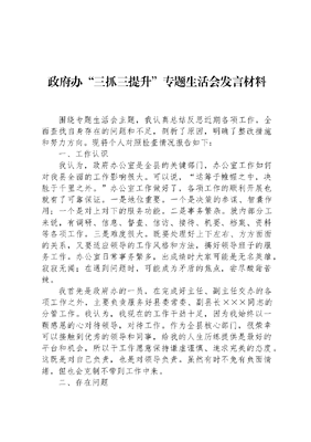 政府办三抓三提升专题生活会发言材料围绕专题生活会主题,我认真总结反思近期各项工作,全面查找自身存在的问题和不足,剖析了原因,明确了整改措施和努力方向。现将个人对照检查情况报告如下:一、工作认识我认为,政府办公室是全县的关键部门,办公室工作如何对我县全面的工作影响很大。可以说,运筹于帷幄之中,决胜于千里之外。办公室工作做好了,各项工作的顺利开展也就有了可靠保证。一是地位重要。一个是决策的参谋、智囊作用;一个是对上对下的服务功能。二是事务繁杂。就内部分工来说,有调研、信息、督查、信访、接待、机要、档案、资料等各项工作。三是难度很大。既要处理好上下左右、方方面面的关系,又要适应领导的工作风格和方法,搞好领导班子的服务工作。办公室日常事务繁多,出成绩时大家可能是无名英雄,寂寂无闻;在遇到问题时,可能成为矛盾的焦点,尝尽酸甜苦辣。我首先是政府办的一员,在完成好主任、副主任交办的各项工作之外,主要负责服务好县委常委、副县长×××同志的分管工作。我认为,我现在的工作干劲十足,因为我始终以一颗感恩的心对待领导,对待工作。作为全县核心部门,很荣幸可以接触到优秀的领导和同事,给我的人生历练提供是最好的平台和机会,所以干工作愿意保持谦虚谨慎、追求完美的态度。这既是对自己负责,也是对领导负责。虽然有时不免有负面情绪,但也会克制不带到工作中来。二、存在问题(一)文字功夫不硬。政府办不是精品不出手的精品意识树的还不牢固。对于会议报告、领导讲话等各类文稿的起草,在掌握各类文体写作基本要领的同时,还需要增强文稿的针对性,面对不同的主体、场合,要灵活转换表达内容和方式、语气。还需要多用心、多学习、多总结、多开悟,从而早日熟练掌握各种类型公文及其他文体写作基本要领,出手成章。(二)业务钻研不深。主要是参谋助手作用发挥还不够充分,不够到位。存在被动等待安排工作任务,慢慢发现有时不能跟上领导的节奏,参谋助手作用就打了折扣。(三)担当意识不够。存在懈怠,不够勤奋,有时带着情绪完成领导交办的工作,特别是熬夜写稿子的时候,连续几天不能早点回家,就会产生心烦意乱的情绪,也存在求不出事,求过得去的现象,没有用更高的标准、更严的要求开展工作。(四)保密意识不强。我对保密工作的重视不够,保密意识不强、保密纪律松懈。2023年×月,我县召开县×××会议,本人出于疏忽,违规使用微信图文识别小程序,将省市《会议精神》转化为文字信息,造成泄密。此次事情,充分反映出自己对外事保密工作缺乏足够的认识。我对自己的失职感到痛心。(四)沟通意识不足。很多时候县委、人大、政协、纪委直接送过来文件,主任们并不知晓,而自己没能做到及时汇报,导致工作被动的情况时有发生。今年东方甄选来我县调研,县委直接批给了××县长接待,由于自己没能第一时间汇报,导致此项工作陷入被动局面。三、下步计划今后,我将坚持经常性检查自己的思想、工作到位情况,务必做到领导交代的每一项工作都不落趟,做一个靠谱的人,使自己出口能讲、提笔能写、出手能干。(一)更好发挥参谋、协调作用。作为政府办的一名文秘人员,服务对象既有领导,又有部门、乡镇,还有广大群众。我将把参与政务作为重中之重,充分履行参谋助手、综合协调职责。在工作实践中,始终紧扣分管副县长分管部门、协调单位事关发展的重点问题,深入细致分析研究,尽力把问题思考在领导之前,检点在领导之前,并及时向领导反馈,为领导科学决策提供重要参考。(二)履行办文、办会、办事职能。在工作中,我将始终做到工作无论轻重、事情不论大小,都认真细致、扎扎实实、保质保量地去完成。1.办文精益求精。我将不断反思、模仿,尤其是将分管部门历年重要讲话和省级内部通报自行装订成册,反复研读,不断总结,使自己的公文处理逐步规范。对于会议报告、领导讲话、汇报材料等各类文稿,在起草、打印、校对、印发等各个环节都力求高质量,努力做到不是精品不出手。2.办会严密细致。我将熟练掌握会议布置的各项工作流程和注意事项,努力做到会前精心筹划、会中优质服务、会后督促落实。始终严把会议通知、组织报到、人员清点、领导讲话录音整理、会议纪要印发等各个环节,努力提高会议承办质量。3.办事周到有序。我将始终注重加强协作,根据工作需要和同事做到有分有合,确保各项工作有条不紊地开展;同时,严格执行值班制度,履职尽责,尤其在日常办公方面,对于办公室的传真电报,努力做到请示及时、告知部门,并向领导及时反馈办理情况。(三)提高端庄厚重、谦卑含容、事有归着、心存济物的修养。工作中要树牢责任心,要扛牢吃苦劲,更要有大格局。不断提升自己的沟通协调能力、解决问题能力、承受压力能力,切实把准工作方向,深研工作思路,拓展工作方式。做到事事有着落,件件有回应;待人友好,团结同事;做人低调,态度端正;情绪稳定,稳重求进。(四)牢固树立规矩意识、责任意识