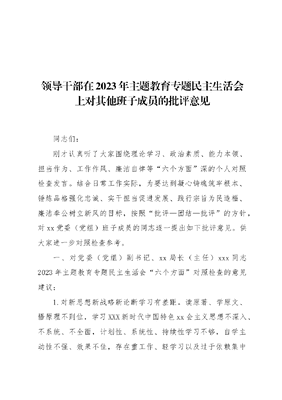 领导干部在2023年主题教育专题民主生活会上对其他班子成员的批评意见同志们:刚才认真听了大家围绕理论学习、政治素质、能力本领、担当作为、工作作风、廉洁自律等六个方面深的个人对照检查发言。结合日常工作实际,为要达到凝心铸魂筑牢根本、锤炼品格强化忠诚、实干担当促进发展、践行宗旨为民造福、廉洁奉公树立新风的目标,按照批评—团结—批评的方针,对xx党委(党组)班子成员的同志逐一提出如下批评意见。供大家进一步对照检查参考。一、对党委(党组)副书记、xx局长(主任)xxx同志2023年主题教育专题民主生活会六个方面对照检查的意见建议:1.对新思想新战略新论断学习有差距。读原著、学原文、悟原理不到位,学习XXX新时代中国特色xx会主义思想不深入、不系统、不全面,计划性、系统性、持续性学习不够,自学主动性不强、效果不佳,存在重工作、轻学习以及过于依赖集中学习的情况,导致运用党的创新理论指导实践、推动工作的能力xx平不高,分析、解决问题的能力不强,贯彻落实上级以及党工委决策部署按部就班、创新不足,活力不够,死气沉沉。比如,在xxx工作推进上理论联系实际不够,工作方法思考不多,工作亮点和特色谋划不足。又如,在xxx打造上,存在动作慢腾腾,统筹不给力,落实不细致,整体效果不佳的问题。2.深刻学习领会两个确立的政治站位不高。主要表现在政治领悟力不高、政治判断力不强、政治执行力不够。作为班子中比较年轻的同志,缺少政治历练,缺乏斗争精神,基层经验不足,是工作中不可忽视的短板,特别是在推动高质量发展上,战略高度不够,领悟深度不够,只看到表层含义,没有进行深层次的剥离和分析。比如,到xxx联系点上党课和宣讲有关精神时,往往照本宣科,没有深度,只追求走完程序、完成任务,不追求工作实效。二、对党委(党组)成员、xx副职xxx同志2023年主题教育专题民主生活会六个方面对照检查的意见建议:1.政治意识不强。在贯彻执行中央和xx、xx委的决策部署上,存在贯彻落实不扎实、不深入,大局观念薄弱,有只种自己一亩三分xx的狭隘思想,对自身困难强调多、对大局利益考虑少,过于强调客观问题和条件,过于安于现状,不求进步,存在实用主义和自xx主义倾向,导致工作结合实际研究不够、沟通交流不够,站得不高、看得不远,抓细、抓实不到位、不彻底。比如,有时候临时性、阶段性工作多,忽略了对其他班子工作的关心和帮助,加之由于岗位上没有直接分管,导致存在想过问又怕大家嫌xx管得宽的顾虑,不过问大家也基本没有义务跟xx沟通和交流,久而久之,与其他班子交流工作少了、工作推进落实上产生了误会和分歧,归根结底还是政治意识不强的主观原因造成的。2.宗旨意识淡化。问政于民有差距,没有完全结合xx道经济发展特点和民生期待落实对策,不能很好的服务经济xx会发展,基层工作调研少了,习惯于听汇报、看数据,下xxx联系点抓工作的针对性、主动性不强,特别是对乡xx振兴重点环节推进、xx具体事务处理、xxx民生问题兑现等学习、指导和处理不够。比如,对xx关注不够,往往只注重了解阶段性工作情况,很少过问其他方面问题,接触群众和听取意见少,对干部和群众的工作、生活情况了解关心和指导少。三、对党委(党组)成员、xx副职xxx同志2023年主题教育专题民主生活会六个方面对照检查的意见建议:1.为民服务的宗旨意识和政绩观不坚决。对群众反映的问题转办、交办多,直接参与调查处理少,多是安排其他同志去办,自己深入一线做得不好。比如,遇到群众来访,往往在了解情况后通知或安排分管中层干部具体去处理,没有亲自处置也很少过问处理结果。比如,群众工作标准低,主动走近群众、贴近群众少,对群众的真实心声倾听不足、了解不多、感悟不深,主动帮群众解决实际困难少,2.破解高质量发展难题的成效不明显。在深入群众、走访xx联系点、落实xx联系点用工等问题上,存在走马观花,被动服务,解决问题和服务群众流于形式浮于表面,工作不深入不扎实的情况,对辖区一些深层次问题,还没有做到解剖麻雀刨根究底。比如,由于缺乏深度的调查研究,没有奋力去挖掘和寻找破解办法,在创新开展xxx、抓实实体经济发展、寻求辖区发展新的增长极,至今未能为提出更可行的措施和办法。四、对党委(党组)成员、xx副职xxx同志2023年主题教育专题民主生活会六个方面对照检查的意见建议:1.群众工作能力有差距。主要是以人民为中心的发展思想树得不牢固,坚持从群众中来、到群众中去的工作方法上执行得不好,对做好新形势下的群众工作存在老办法不管用、新办法不会用的恐慌感。比如,在抓龙xxx工作中,过于强调工作进度,听取xxx意见不够,征求群众意见建议不够,上没有很好地沟通协调项目推进,下没有很好的推进项目落实,建设效果不理想、跟踪解决问题不及时。2.大局意识不强。想问