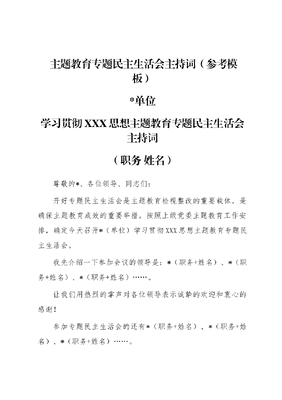 主题教育专题民主生活会主持词(参考模板)*单位学习贯彻XXX思想主题教育专题民主生活会主持词(职务 姓名)尊敬的*、各位领导、同志们:开好专题民主生活会是主题教育检视整改的重要载体,是确保主题教育成效的重要举措。按照上级党委主题教育工作安排,确定今天召开*(单位)学习贯彻XXX思想主题教育专题民主生活会。我先介绍一下参加会议的领导是:*(职务+姓名)、*(职务+姓名)、*(职务+姓名)……。让我们用热烈的掌声对各位领导表示诚挚的欢迎和衷心的感谢!参加专题民主生活会的还有*(职务+姓名)、*(职务+姓名)、*(职务+姓名)……。*(职务+姓名)、*(职务+姓名)、*(职务+姓名)等列席会议。今天的专题民主生活会,共有五项议程:一是由我通报*(单位)领导班子2022年度民主生活会整改措施落实情况以及本次专题民主生活会征求意见情况;二是由我代表领导班子作对照检查;三是领导班子成员逐一发言,开展批评和自我批评;四是请*同志点评讲话;五是我代表班子表态发言。*现在进行第一项,由我通报*(单位)领导班子2022年度民主生活会整改措施落实情况以及本次民主生活会征求意见情况。2022年度民主生活会,共查摆出*大方面、*个问题,*个问题已整改完成,其中*等*个方面需要结合本次专题民主生活会查摆的问题一并进行持续整改。根据上级党委关于本次专题民主生活会的工作要求和统一安排,*(单位)认真组织理论学习、深入开展谈心谈话、全面梳理问题、对典型案例进行深刻剖析,共收集意见建议*条。*会议进行第二项,由我代表领导班子作对照检查。(发言毕)*会议进行第三项,班子成员逐一发言,开展批评和自我批评。首先由我带头进行对照检查。(发言毕)*下面请各位同志提出批评意见。*(班子其他成员提出批评意见后)大家提的意见我全部接受,后期工作中加以改正。请*同志进行对照检查。(发言毕)*(对照检查后)我先提批评意见。1.*。2.*。下面请其他同志提出批评意见。*(*表态后)请*同志进行对照检查。(发言毕)*(对照检查后)我先提批评意见。1.*。2.*。下面请其他同志提出批评意见。(发言毕)*(*表态后)请*同志进行对照检查。(发言毕)*(对照检查后)我先提批评意见。1.*。2.*。下面请其他同志提出批评意见。(发言毕)*(*表态后)请*同志进行对照检查。(发言毕)*(对照检查后)我先提批评意见。1.*。2.*。下面请其他同志提出批评意见。(发言毕)*(*表态后)请*同志进行对照检查。(发言毕)*(对照检查后)我先提批评意见。1.*。2.*。下面请其他同志提出批评意见。(发言毕)*(*表态后)请*同志进行对照检查。(发言毕)*(对照检查后)我先提批评意见。1.*。2.*。下面请其他同志提出批评意见。(发言毕)*(*表态后)请*同志进行对照检查。*(对照检查后)我先提批评意见。1.*。2.*。下面请其他同志提出批评意见。(发言毕)*(*表态后)请*同志进行对照检查。(发言毕)*(对照检查后)我先提批评意见。1.*。2.*。下面请其他同志提出批评意见。(发言毕)*(*表态后)会议进行第四项,请*作点评、提要求。(发言毕)*(点评后)谢谢*的点评。会议进行第五项,由我代表班子作表态发言。尊敬*,各位领导、同志们:(发言毕)*最后,衷心感谢督导指导组的精心指导,感谢各位领导多年来对*单位发展给予的关心、支持和帮助,祝大家身体健康、工作顺利!谢谢大家。会议到此结束,散会。