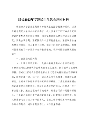 局长2023年专题民主生活会剖析材料根据XX关于召开主题教育专题民主生活会的通知要求,以及开好专题民主生活会的有关要求,我认真学习了XXXXXX关于党的建设的重要思想等规定内容,结合征求到意见建议和谈心谈话情况,聚焦会议主题,紧紧围绕六个方面检查重点,紧密联系自身思想工作实际,深入查找了问题、剖析了问题产生的原因,有针对性地提出下一步努力方向和整改措施,现将对照检查情况报告如下一、查摆出来的问题(一)理论学习方面。一是虽然坚持党委中心组学习制度,不断加深对XXX新时代中国特色社会主义思想,但自我学习主动性不强,但对XXX新时代中国特色社会主义思想的精髓领会还不够深刻,经常是读一读、记一记,缺乏真正坐下来精读、细读和认真研究,主动学习和终身学习的意识还不够强。二是虽然深深明白理论政策学习的重要性,但缺乏认真研究的恒心,经常是一忙于事务性工作,就挤占理论学习的时间,缺乏学习的计划性和系统性。三是虽然面对日益严峻的管控形势,时常感到本领恐慌,但又缺乏静心坐下深入学习的勇气,导致工作中理论思考和理论指导结合不到位,感到有劲使不上,工作质量不高。(二)政治素质方面。能够牢固树立四个意识,坚定四个自信,做到四个服从,坚定两个维护,自觉在思想上政治上行动上同以XXX同志为核心的党中央保持高度一致,思想上始终忠诚于党,站稳政治立场,服从组织决定,工作中能够坚决贯彻落实XXXXXX重要指示和中央决策部署。主动作为、敢于担当,但有时过多考虑单位实际,强调客观条件,存在着实用主义、跟不上、慢半拍的现象。应对新形势新挑战的冲劲不足,按部就班,方式方法不多,对新形势认识不够,对新挑战有怕出错的思想,闯劲、冲劲不足。对工作中发现的一些小的违纪违规苗头,有时还存在顾人情、讲关爱多,狠心动真格、铁腕抓整治少的不良倾向。(三)能力本领方面。一是工作作风还需进一步转变。在落实要求、汇报工作中,还存在与实际工作联系不够紧密的现象,研究制定的工作措施有一些还是上下一般粗,不能很好地结合单位和岗位实际情况。重安排、轻落实,重表象、轻实效的现象也在一定程度存在。二是干事创业的责任感还不够。在思想上有松懈的苗头,谋一事一域的多了,思考全局性问题的少了;维持现状的想法多了,进取创新的意识弱了。对如何适应新形势、新任务的现实需要和谋长远、顾全局的建设思考还较大空间。(四)担当作为方面。一是能够牢固树立群众观念,对照初心使命,不断增强服务意识,下大力气改善环境,积极回应人民群众新期待,但还存在一些不足。从我履职来说,一线队伍基础查验技能仍然薄弱、储备不足、仍存短板,业务水平仍低层次徘徊等的问题,反映出我在主持党委工作层面还存在着科学摆布勤务运行机制不够超前、抓一线队伍基础业务建设不够深入,仍需今后下大力解决。队伍业务水平、执法能力长期桎梏等问题一定程度上影响制约了严格规范公正文明水平,与坚持把以人民为中心作为根本立场,不断增强人民群众和中外出入境人员的获得感幸福感、安全感要求还有一定的差距。二是对关心了解不够。在实际工作中,容易将主要精力都投入到中心工作和具体事务当中容易忽视深入民警开展调研摸排的重要性,深入时间与自己期望还有差距,与xx接触、了解还不够,与个别人谈心交流面还不够广,没有完全俯下身子了解民警实情,对部分xx的所想所盼掌握还不够全面。(六)廉洁自律方面。作为党委书记,我能够严格落实一岗双责,认真履行管党治党政治责任,始终坚持对党风廉政建设的常抓不懈,牢牢抓住严守纪律规矩这一底线,带头遵守中央八项规定和《关于新形势下党内政治生活的若干准则》《中国共产党党内监督条例》,做到慎独、自警、自醒。按规定如实报告个人有关事项;不存在配偶、子女及其配偶违规经商办企业甚至利用职权或者职务影响为其经商办企业谋取非法利益、利用名贵特产特殊资源谋取私利等问题。工作中能够坚持党性原则,秉公办事,生活中,没有不良嗜好,不乱结交朋友,不与地方无关人员随意交往;但是廉洁自律意识还不够强,认为现在生活条件好了、工资收入提高了,过紧日子和艰苦奋斗、勤俭节约的意识有所弱化,有时对一些朋友、同学的饭局和聚会邀请还是有借口,难以推辞。三、原因剖析(一)理想信念还不够坚定。作为一把手,能够在大是大非面前保持头脑清醒,旗帜鲜明,立场坚定,把主要的精力放在队伍管理和业务工作上了,在政治理论学习上不够深入系统,理解不够全面深刻,特别是在个人自学方面抓得还不够紧,满足于已有的理论知识和工作水平,对XXX新时代中国特色社会主义思想新理论、新观点研究得不够深入透彻,不同程度影响了自己思想上的进步和工作的推进。(二)担当作为精神还不足。我作为xx委班子的领头雁在副书记缺位、班子成员未配齐的情况下,我直面问题和困难,勇挑担子,竭力确保党中央和上级决策部署在我站落地见效,但随着年龄和