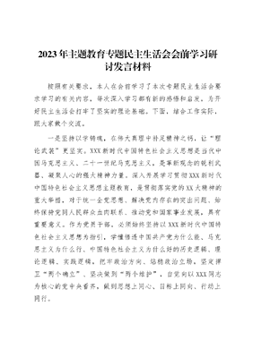 2023年主题教育专题民主生活会会前学习研讨发言材料按照有关要求,本人在会前学习了本次专题民主生活会要求学习的有关内容,每次深入学习都有新的感悟和启发,为开好民主生活会打牢了坚实的理论基础。下面,结合工作实际,跟大家做个交流。一是坚持以学铸魂,在伟大真理中补足精神之钙,让理论武装更坚实。XXX新时代中国特色社会主义思想是当代中国马克思主义、二十一世纪马克思主义,是革新观念的锐利武器、凝聚人心的强大精神力量。深入开展学习贯彻XXX新时代中国特色社会主义思想主题教育,是贯彻落实党的XX大精神的重大举措,对于统一全党思想、解决党内存在的突出问题、始终保持党同人民群众血肉联系、推动党和国家事业发展,具有重要意义。作为党员干部,必须始终坚持以XXX新时代中国特色社会主义思想为指引,学懂悟透中国共产党为什么能、马克思主义为什么行、中国特色社会主义为什么好的历史逻辑、理论逻辑、实践逻辑,把牢政治方向、站稳政治立场,坚定捍卫两个确立、坚决做到两个维护,自觉向以XXX同志为核心的党中央看齐,做到思想上同心、目标上同向、行动上同行。二是坚持以学增智,在学以致用中增强担当之能,让学践互动更深入。XXXXXX在陕西考察时指出,以学增智,就是要从党的科学理论中悟规律、明方向、学方法、增智慧,把看家本领、兴党本领、强国本领学到手,并从提升政治能力、提升思维能力、提升实践能力三个方面提出了明确要求。要善于从党和人民的立场出发想问题、作决策、办事情,善于思考涉及党和国家工作大局的根本性、全局性、长远性问题,加强战略性、系统性、前瞻性研究谋划。要善于运用党的科学理论解决经济社会发展中的各种矛盾和问题,防范化解重大风险,下好先手棋,打好主动仗,不断推动各项工作取得实效。三是坚持以学正风,在知行知止中绷紧作风之弦,让勤廉并重更自觉。坚持以学正风,就是要求党员干部力行求真务实的工作作风,站稳人民立场,牢记全心全意为人民服务的根本宗旨,以实际行动肩负起党和人民赋予的重任。人民群众看主题教育是否有成效,最直观的感受是看党风方面存在的问题是否得到解决、党员干部作风是否有明显进步。党的XX大报告指出,腐败是危害党的生命力和战斗力的最大毒瘤,反腐败是最彻底的自我革命。在实际工作中,我们必须不断加强自己的党性修养,把纪律规矩挺在前面,树立正确的政绩观、权力观、事业观,发扬老黄牛精神,甘于吃苦、乐于奉献,思想上划出红线、行为上不破底线。要做到同党中央的要求对标,拿党章党规扫描,用人民群众新期待透视,同先辈先烈、先进典型对照,力求在求真务实中践行初心使命。在私底下、无人时、细微处坚持不放纵、不越轨、不逾矩,老老实实做人,清清白白办事,以廉洁自律,勤政为民的高标准走好为党尽责、为民造福的每一步。四是坚持以学促干,在办就办好中展现落实之力,让成果转化更有效。开展学习贯彻XXX新时代中国特色社会主义思想主题教育,一个重要目的就是以学促干,一个重要目标就是实干担当促进发展。以学促干,就是要通过深入学习贯彻XXX新时代中国特色社会主义思想,增强担当作为、干事创业的能力和本领,以新气象新作为新成效打开事业发展新天地。我们泉州人历来是能吃苦、肯奋斗的,比如在抗击反复出现的疫情中,都是全市人民一道团结协作,战胜了一个又一个艰难险阻,取得了一个又一个重大胜利。在新的征程上,我们将遇到各种各样的困难和挫折,我们要系统梳理调研发现的问题、发展中遇到的问题、群众反映强烈的问题,把自己摆进去、把职责摆进去、把工作摆进去,一项一项抓好整改,让人民群众切实感受到解决问题的实际成效,奋力开创事业发展新局面。