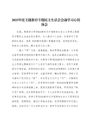 2023年度主题教育专题民主生活会会前学习心得体会近期,聚焦学习贯彻XXX新时代中国特色社会主义思想主题教育专题民主生活会有关要求,本人通过个人自学,反复学习了党的XX大报告、党章《XXX著作选读》等重要内容,受到很多启发。现结合工作实际,跟大家谈几点心得。一要以学为先、铸魂提能,筑牢思想政治根基。今年是全面贯彻落实党的XX大精神开局之年,也是全面建设社会主义现代化国家新征程起步之年,开展学习贯彻XXX新时代中国特色社会主义思想主题教育对于广大党员干部而言意义重大。党员干部要深知开卷有益,把党的XX大报告、《XXX谈治国理政》当作案头卷必读书,坚持原原本本学、全面系统学、融会贯通学,深刻认识中国共产党为什么能、马克思主义为什么行、中国特色社会主义为什么好,把思想和行动统一到XXXXXX重要讲话精神和党中央决策部署上来。要深化拓展学习渠道,用好用活碎片化时间,充分利用集体学习、个人自学等方式加油充电。要求真求实求效,把学习贯彻XXX新时代中国特色社会主义思想同总结经验、观照现实、推动工作结合起来,在学思践悟中牢记初心使命,在知行合一中主动担当作为,把学习成果转化为工作动力和成效。二要以民为本、不忘初心,擦亮为民造福底色。XXXXXX强调:要大兴调查研究之风,多到分管领域的基层一线去,多到困难多、群众意见集中、工作打不开局面的地方去,体察实情解剖麻雀,全面掌握情况,做到心中有数。在上个世纪八十世纪末,时任宁德地委书记的XXX同志冒着酷暑,在崎岖难行的山路上步行2个多小时到下党村,通过访贫问苦、现场办公等方式,将对群众的真挚情感化为听实话、察实情、办实事的务实行动,充分体现了XXX一心为民的情怀。作为党员干部,要秉持以民为本的理念,真正深入基层,与群众保持密切联系。在与群众交流时,要放下架子,以亲近和自然的态度与他们交谈,融入他们的生活圈子和聚集地,通过互联网、大数据等现代信息技术来补充调研。要全面收集那些难以获取的信息,汇总梳理、纵横比对找出群众关注的热点问题和基层矛盾的难点问题,找准问题的关键点,明确为民服务的方向,形成任务清单。要以时不我待的紧迫感,制定出切实可行的对策措施,通过务实重干,逐项解决这些问题。要勇做带领民众致富的领路人,为民排忧解难的勤务员,不断提升人民群众的获得感和幸福感。同时,我们需要发扬斗争精神,磨炼斗争品质,增强斗争本领,以克服前进道路上的种种困难与挑战。我们要围绕重点任务层层推进,聚焦难点和堵点,持之以恒,以更加紧密的团结、更加顽强的奋斗,向着更美好的明天勇往直前。三要以干为要、凝聚合力,营造火红干事氛围。XXXXXX指出,当前最重要的任务,就是撸起袖子加油干,一步一个脚印把党的XX大作出的重大决策部署付诸行动、见之于成效。当前,xxx正处在一个重要而关键的发展时期,既面临诸多困难挑战更蕴藏重要战略机遇。要实现宏伟的蓝图,必须紧紧抓住重点,精准发力,并始终盯住目标不遗余力。古人云:道虽迩,不行不至;事虽小,不为不成。再短的路程,也需要人一步一步去走过;再小的的事情,也需要动手从一点一滴做起。对于我们党员干部来说,必须经常思考如何落实职责,勤于思考如何落实工作。必须大力发扬落实精神,在推进发展中展现实际的成效。要通过作风大整顿,坚持不懈地推动作风的重大转变,打通贯彻落实的最后一公里。必须发扬只争朝夕的精神,增强狠抓落实的能力,始终坚持说实话、谋实事、出实招、求实效,把雷厉风行和久久为功有机地结合起来,以钉钉子精神落实落细各项工作只有这样,我们才能在强国建设、民族复兴的征程上创造更大的奇迹。