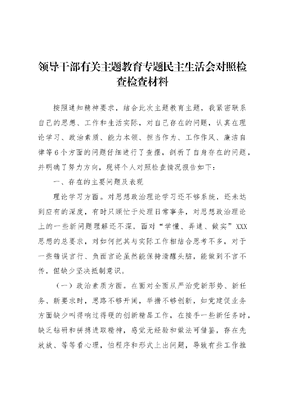 领导干部有关主题教育专题民主生活会对照检查检查材料按照通知精神要求,结合此次主题教育主题,我紧密联系自己的思想、工作和生活实际,对自己存在的问题,认真在理论学习、政治素质、能力本领、担当作为、工作作风、廉洁自律等6个方面的问题仔细进行了查摆,剖析了自身存在的问题,并明确了努力方向,现将个人对照检查情况报告如下:一、存在的主要问题及表现理论学习方面。对思想政治理论学习还不够系统,还未达到应有的深度,有时只顾忙于处理日常事务,对思想政治理论上的一些新问题理解还不深,面对学懂、弄通、做实XXX思想的总要求,对如何把其与实际工作相结合思考不多,对于一些错误言行、负面言论虽然能保持清醒头脑,能做到不言不传,但缺少坚决抵制意识。(一)政治素质方面。在面对全面从严治党新形势、新任务、新要求时,思路不够开阔,举措不够创新,如党建促业务方面缺少叫得响过得硬的创新精品工作,在接手一些新任务时,缺乏钻研和拼搏进取精神,感觉无经验和做法可借鉴,存在先放放、等等看心理,怕程序和形式上出问题,导致有些工作推进不力、效率不高。(三)能力本领方面。在面对一些时间紧、要求高的工作任务时,总想着尽快收齐材料、尽快写完文稿、尽快落实到位,没有留足创造性开展工作的空间,有时还存在形式主义思想,特别是在情况紧急、时间匆忙的情况下,更多侧重于应付性资料,而忽略了实质性事情。(四)担当作为方面。一是存在功利思想。面对严格的纪律约束,一些潜规则被打破,一些擦边球的好处被规范,个别领导干部和窗口单位干部办事节奏慢,消极怠工,存在门好进、脸好看、话好听、事难办现象。有的对上级部署要求,根据单位和个人利益进行取舍裁剪,合意的就执行,不合意的就推托或变通,一定程度上影响xx行业形象。二是存在守摊思想。部分领导干部不敢担当,不愿担当,不求无功,但求无过,缺乏进取心,奉行少干事、不出事。对待上级安排的工作做足表面文章,满足于保位子、守摊子、浑浑噩噩过日子,出现问题一推了之,不敢担责。(五)工作作风方面。一是工作作风欠扎实。一旦有了工作任务首先想到的是怎样尽快完成任务,到时别误事,在处理速度与质量的关系上是只求最快,不求最好。二是创新意识欠缺。没有充分发挥主观能动性,只按照之前的方式与做法,没有创新寻找更好方式的意识,工作时循规蹈矩,缺乏创新。三是工作质量不够高。对工作从思想上来说想干好,甚至更好,但是这需要扑下身、真抓实干,是需要很强的责任感、使命感、发展观念的,在这些方面自己做的还不够很好。(六)廉洁自律方面。一直以来,虽然能自觉遵守各项纪律规定,但有时认为只要自己守住底线、不越红线方向原则上不出错就行。认为只要在大事大非问题上能坚守原则立场就行,因而对自己放松了要求、降低了标准。二、问题产生的根源及原因分析(一)放松了政治理论学习。对政治理论学习重要性认识不足,缺乏学习新理论、新知识的强烈愿望,常把工作当成硬任务,把学习变成软任务,经验主义思想导致对理论学习的兴趣不浓,运用理论指导工作实践的能力不够强。(二)忽略了进取意识培养。日常工作存在不刻意追求的思想,从而导致进取心、上进心不强,满足现状、得过且过,在一些关键工作环节缺乏积极向上的精神状态,吃苦精神、攻坚精神有所弱化。(三)大意了实干精神状态。有时还存在做一天和尚撞一天钟的错误思想,缺少争第一、当先进的斗志。实干精神有所弱化,有时候面对复杂问题,勇于担当的底气不足,今日事今日毕的优良作风发挥不够,遇到困难问题会时而产生厌烦情绪。三、今后努力方向和整改措施(一)进一步强化政治学习,增强理论功底。通过持之以恒的理论学习提髙自己的政治敏锐性和政治鉴别力,树立科学的世界观、人生观和价值观。提高自己的政治素质、业务能力和道德水平。特别要在理论联系实际、指导实践上下真功夫,不断提高理论学习的效果,实现理论与实践相统一。(二)进一步严格约束自己,摆正心态。正确定位自己,立足岗位实际,以身作则、率先垂范以上率下。要以敬畏之心对待肩负的责任,以进取之心对待从事的工作,以真诚之心对待群众。(三)进一步改进工作作风,增强宗旨意识,传递正能量牢固树立群众观点,忠实地执行党的群众路线。以解决思想和工作中存在的实际问题为出发点,以改进自己的工作作风和工作方式、提髙工作成效为落脚点,深入到基层,要牢记群众利益无小事的道理,时刻把群众的需求和冷暖挂在心上,诚心诚意为群众群众办实事、解难事、做好事。