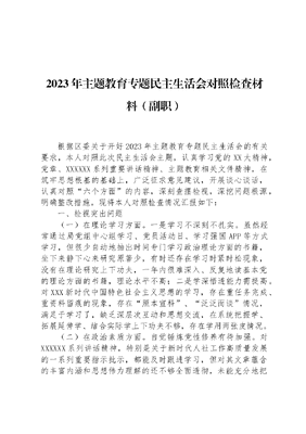 2023年主题教育专题民主生活会对照检查材料(副职)根据区委关于开好2023年主题教育专题民主生活会的有关要求,本人对照此次民主生活会主题,认真学习党的XX大精神,党章、XXXXXX系列重要讲话精神、主题教育相关文件精神,在筑牢思想根基的基础上,广泛征求意见建议,开展谈心谈话,认真对照六个方面的内容,深刻查摆检视,深挖问题根源,明确整改措施。现将本人对照检查情况汇报如下:一、检视突出问题(一)在理论学习方面。一是学习不深刻不扎实。虽然经常通过局党组中心组学习、党员活动日、学习强国APP等方式学习,但很少自动地抽出时间专门学习政治理论方面的书籍,坐下来静下心来研究原著少,有时还存在学习时紧时松现象,没有在理论研究上下功夫,一年内很难深入、反复地读基本党的理论方面的书籍,理论水平不高;二是学深悟透能力需提高。对XXX新时代中国特色社会主义思想的学习,存在重任务完成、重资料留痕的现象,存在照本宣科、泛泛而谈情况,满足于学习了,缺乏深层次互动和思想交流,在系统把握学、拓展延伸学、结合实际学上下功夫不够,存在学用两张皮情况。(二)在政治素质方面。自觉锤炼党性修养有待加强。对XXXXXX系列讲话精神,特别是关于新时代人社工作高质量发展的一系列重要指示批示,都能及时跟进学习,但对其文章蕴含的丰富内涵和思想伟力理解的还不够全面透彻,未能充分地把学习理论成果转化为推动人社工作发展动力。(三)在能力本领方面。人社部门为全区的重要民生部门,作为民生服务的一份子,在引领保障改善民生上缺乏奋勇争先的精神,仅满足于按照区委区政府和上级业务部门的要求做工作,存在坐等指挥、依令而行的现象,尤其有些涉及人民群众关心的利益问题,包括工资福利待遇、养老金待遇调整比较敏感,按部就班落实,只做不说或多做少说,如何站在全区发展大局的角度上去谋划全民参保的工作,思路不够清晰,行动不大胆。(四)在担当作为方面。一是防范化解风险能力不够强。近年来,自上而下高度重视社保基金安全工作,强调要以零容忍的态度打击欺诈骗保、套保或挪用贪占各类社保资金的违法行为,由于人手、技术手段、专业水平等制约因素,疲于应付上级下发的疑点数据,花费大量的人力物力去核实和追缴,防患于未然的预警手段有限。二是工作末端落实有差距。思想上存在着本位主义,认为自己能够做好本分就够了,有守摊子思想,同时还有怕担风险、怕干得多、出错误多、怕得罪人等思想,缺乏主动出击、持久为功的担当精神。(五)在工作作风方面。习惯根据上级的安排开展服务群众工作,处于一种被动而为的状态,没有很好地树牢群众观念,走好群众路线,平日里对各项业务考核指标应付得多,主动了解困难群众,并切实加以帮助解决方面做得不够。如全区的服务企业走访活动,有时会让干部先行了解企业经营情况和存在的问题,有选择性的上门;针对没有什么需求的企业,没有主动沟通联系,没有建立长效服务机制。(六)在廉洁自律方面。作为班子成员,能认真做好分管的业务工作,但在工作重视程度方面,对分管业务工作投入时间和精力比较多,对党建工作没有形成自觉行动。比如开展四必谈有欠缺,四必谈谈业务工作多,谈党风廉政少,对苗头性、倾向性问题重视不够,提醒不够、批评不多。同时,自我要求有所放松,主观上认为入党多年,能够时刻保持对党纪国法的敬畏,严格遵守、不越红线,就是一个合格的共产党员了,没有严格按照优秀党员标准要求自己,有时存在纪律松懈、观念淡化的情况。三、原因剖析(一)政治教育学得有些松。自认为受党的教育和熏陶时间比较长,政治比较坚定,思想比较纯洁,就有一种放松感。在学习政治理论上,没有主动去深刻理解它的科学体系,缺乏运用理论指导工作实际的能力。片面认为理想信念是空的东西,以抓业务工作繁重为由,没有真学、深学,只求面上能应付。(二)为民初心抓得不够牢。没有坚持任何时候都要以群众满不满意作为自己工作的衡量标准,为群众办实事、办好事的自觉性不强。自认为日常工作繁杂,精力有限,对群众观念的认识有时成了说起来重要,做起来次要,忙起来不要;对群众的工作方式方法不多,存在拖、躲现象,着力解决群众的操心事烦心事揪心事方面还有很大差距。(三)担当劲头落得不够强。不能以高标准、严要求来进行自律,对价值观、利益观念、组织纪律观念有时会产生理解上的片面。工作上表率作用发挥不够,把自己混同于一般群众,有拈轻怕重的倾向;面对新时期人力社保工作的繁重任务,也有力不从心的本领恐慌,对一些难题、复杂问题,缺乏钉钉子精神和反复抓、抓反复的劲头,不求有功、但求无过,缺少以党的事业为己任的精神。(四)廉政建设绷得不够紧。平常把主要精力放在了工资福利、人事招聘、社会保障等业务上,对于口项干部的业务要求多,对学习教育抓得不深刻不具体,对个别干部平常存在的苗头性问题批评教育不够,对党员干部中的老好人思想批