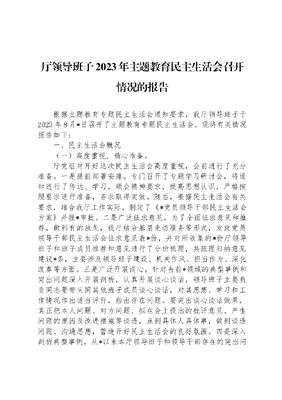 厅领导班子2023年主题教育民主生活会召开情况的报告根据主题教育专题民主生活会通知要求,我厅领导班子于2023年8月*日召开了主题教育专题民主生活会。现将有关情况报告如下:一、民主生活会概况(一)高度重视、精心准备。厅党组对开好这次民主生活会高度重视,会前进行了充分准备。一是提前部署安排。专门召开了专题学习研讨会,将通知进行了传达、学习,领会精神要求,提高思想认识,严格按照要求进行准备,务求取得实效。随后,根据民主生活会有关要求,结合我厅工作实际,制定了《*党员领导干部民主生活会方案》并报*审批。二是广泛征求意见。为了全面征求意见和推荐,做到有的放矢,我厅结合基层走访服务等形式,发放党员领导干部民主生活会征求意见表*份,并对所收集的*份厅领导班子和班子成员推荐和意见进行了分析梳理,共疏理归纳意见建议*条,主要涉及领导班子建设、机关作风、担当作为、深化改革等方面。三是广泛开展谈心。针对当前*领域的典型事例和突出问题深入开展剖析,认真开展谈心谈话,领导班子主要负责同志要带头同其他班子成员谈心谈话,对其思想、学习和工作情况作出适当评价,指出存在问题。要突出谈心谈话效果,真正把本人问题、对方问题、拟在会上提出的批评意见、产生问题的原因及改进措施等谈透,点到具体人具体事,做到谈透问题、沟通思想,营造开好民主生活会的良好氛围。四是深入剖析典型事例。从*以来本厅领导班子和领导干部存在的突出问题中,从群众反映强烈、社会影响较大的环境案件中,筛选若干典型事例进行深刻分析。领导班子和领导班子成员自觉把自己摆进去,紧扣民主生活会主题,深入剖析典型事例产生的根源,做到分清责任、认领任务、边查边改,为撰写发言提纲、开展批评和自我批评做好铺垫。五是认真撰写班子对照检查材料和个人发言提纲。领导班子和班子成员紧扣民主生活会主题,对照*的初心和使命,坚持问题导向,强化问题意识,把自己摆进去,把思想摆进去,把工作摆进去,认真反思近年来上级查处的典型环境案例,特别要将我市近年来严重违纪违法案例作为民主生活会的反面教材,深入具体地进行党性分析,做到落细落小、见人见事见思想。在此基础上,厅党组书记主持研究起草领导班子对照检查材料,班子成员自己动手撰写个人发言提纲。(二)严格纪律,确保实效。根据通知要求,报请*联系领导同意后,邀请*督导组副组长、*组织部部务委员*同志,督导组*同志参加,我厅在8月*日召开了党员领导干部民主生活会;按照团结——批评——团结的方式,采取先自我批评、再相互批评的办法,逐个进行。班子成员认真领会*下发的《通知》精神,充分认识开展批评与自我批评的重要意义,结合自身联系和分管的工作,深刻检查个人在学习贯彻A新时代中国特色社会主义思想等6方面存在的不足。会议听取了领导班子对照检查情况汇报,严肃认真地开展批评与自我批评。与会同志一致感到领导班子群众能够做到团结大局、民主集中、廉洁奉公,有战斗力,带领全体干部职工充分发挥职能作用。但大多数同志也感到自己还存在对学习还不够,忙于具体事务多,专门抓学习少,以会代学多,有针对性进行学习少,重经验,轻理论,理论与实际联系不紧密;工作有成绩但离上级要求和人民群众的期望还有差距等问题和不足。大家敞开思想,诚恳对待,自我检查开诚布公、襟怀坦白,相互批评开门见山、坦诚磊落,敢于正视自身问题,做到了见人见事见思想,并对班子和其他班子成员实事求是地提出了合理的意见和建议,达到了坦诚相见、加深了解、增进团结的目的。对待同志们的批评能够端正态度,虚心理解。到达了消除误解、交流感情、增进团结、构成合力的良好效果。会上,*同志对本次会议提出了具体要求,充分肯定我厅民主生活会准备充分,剖析透彻,达到了解决问题、增进团结的效果,并强调领导班子要追求卓越,领导干部要追求成功;要善于学习,增强道德修养;要踏实肯干,增强职责感;要勤于思考,增强开拓创新意识。(三)通报状况,强化落实。民主生活会后,根据*文件要求,我厅召开全体干部职工会议,对群众意见和民主生活会上发现的班子、个人存在的主要问题进行了通报,认真分析原因,寻找对策。领导班子成员针对自身存在问题和不足,制定了整改措施,明确了具体时限,确保征求意见件件有着落,存在问题事事有回音。二、会议的总体成效此次党员领导干部民主生活会开得较为成功,主要体现在四个方面:(一)思想认识深刻。厅党组、领导班子成员充分认识到开展批评和自我批评的重要性。能够端正态度对待批评与自我批评,自觉开展批评和自我批评。(二)会前准备充分。会前,班子成员在广泛征求意见和深入调查研究的基础上,认真进行了自我剖析和自我反思,对班子其他成员在党性党风、遵守《廉政准则》等方面存在的不足也进行了分析思考,并且在班子成员间开展了广泛的谈心活动,每位班子成员都认真撰写了发言材,这为开好民主生活会带给有力保证。(三)严于自我剖析。