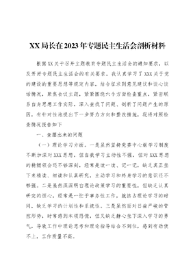 XX局长在2023年专题民主生活会剖析材料根据XX关于召开主题教育专题民主生活会的通知要求,以及开好专题民主生活会的有关要求,我认真学习了XXX关于党的建设的重要思想等规定内容,结合征求到意见建议和谈心谈话情况,聚焦会议主题,紧紧围绕六个方面检查重点,紧密联系自身思想工作实际,深入查找了问题、剖析了问题产生的原因,有针对性地提出下一步努力方向和整改措施,现将对照检查情况报告如下一、查摆出来的问题(一)理论学习方面。一是虽然坚持党委中心组学习制度不断加深对XXX思想,但自我学习主动性不强,但对XXX思想的精髓领会还不够深刻,经常是读一读、记一记,缺乏真正坐下来精读、细读和认真研究,主动学习和终身学习的意识还不够强。二是虽然深深明白理论政策学习的重要性,但缺乏认真研究的恒心,经常是一忙于事务性工作,就挤占理论学习的时间,缺乏学习的计划性和系统性。三是虽然面对日益严峻的管控形势,时常感到本领恐慌,但又缺乏静心坐下深入学习的勇气,导致工作中理论思考和理论指导结合不到位,感到有劲使不上,工作质量不高。(二)政治素质方面。能够牢固树立四个意识,坚定四个自信,做到四个服从,坚定两个维护,自觉在思想上政治上行动上同以A同志为核心的党中央保持高度一致,思想上始终忠诚于党,站稳政治立场,服从组织决定,工作中能够坚决贯彻落实XXX重要指示和中央决策部署。主动作为、敢于担当,但有时过多考虑单位实际,强调客观条件,存在着实用主义、跟不上、慢半拍的现象。应对新形势新挑战的冲劲不足,按部就班,方式方法不多,对新形势认识不够,对新挑战有怕出错的思想,闯劲、冲劲不足。对工作中发现的一些小的违纪违规苗头,有时还存在顾人情、讲关爱多,狠心动真格、铁腕抓整治少的不良倾向。(三)能力本领方面。一是工作作风还需进一步转变。在落实要求、汇报工作中,还存在与实际工作联系不够紧密的现象,研究制定的工作措施有一些还是上下一般粗,不能很好地结合单位和岗位实际情况。重安排、轻落实,重表象、轻实效的现象也在一定程度存在。二是干事创业的责任感还不够。在思想上有松懈的苗头,谋一事一域的多了,思考全局性问题的少了;维持现状的想法多了,进取创新的意识弱了。对如何适应新形势、新任务的现实需要和谋长远、顾全局的建设思考还较大空间。(四)担当作为方面。一是能够牢固树立群众观念,对照初心使命,不断增强服务意识,下大力气改善环境,积极回应人民群众新期待,但还存在一些不足。从我履职来说,一线队伍基础查验技能仍然薄弱、储备不足、仍存短板,业务水平仍低层次徘徊等的问题,反映出我在主持党委工作层面还存在着科学摆布勤务运行机制不够超前、抓一线队伍基础业务建设不够深入,仍需今后下大力解决。队伍业务水平、执法能力长期桎梏等问题一定程度上影响制约了严格规范公正文明水平,与坚持把以人民为中心作为根本立场,不断增强人民群众和中外出入境人员的获得感、幸福感、安全感要求还有一定的差距。二是对关心了解不够。在实际工作中,容易将主要精力都投入到中心工作和具体事务当中,容易忽视深入民警开展调研摸排的重要性,深入时间与自己期望还有差距,与xx接触、了解还不够,与个别人谈心交流面还不够广,没有完全俯下身子了解民警实情,对部分xx的所想所盼掌握还不够全面。(六)廉洁自律方面。作为党委书记,我能够严格落实一岗双责,认真履行管党治党政治责任,始终坚持对党风廉政建设的常抓不懈,牢牢抓住严守纪律规矩这一底线,带头遵守中央八项规定和《关于新形势下党内政治生活的若干准则》《中国共产党党内监督条例》,做到慎独、自警、自醒。按规定如实报告个人有关事项;不存在配偶、子女及其配偶违规经商办企业,甚至利用职权或者职务影响为其经商办企业谋取非法利益、利用名贵特产特殊资源谋取私利等问题。工作中能够坚持党性原则,秉公办事,生活中,没有不良嗜好,不乱结交朋友,不与地方无关人员随意交往;但是廉洁自律意识还不够强,认为现在生活条件好了、工资收入提高了,过紧日子和艰苦奋斗、勤俭节约的意识有所弱化,有时对一些朋友、同学的饭局和聚会邀请还是有借口,难以推辞。三、原因剖析(一)理想信念还不够坚定。作为一把手,能够在大是大非面前保持头脑清醒,旗帜鲜明,立场坚定,把主要的精力放在队伍管理和业务工作上了,在政治理论学习上不够深入系统,理解不够全面深刻,特别是在个人自学方面抓得还不够紧,满足于已有的理论知识和工作水平,对XXX思想新理论、新观点研究得不够深入透彻,不同程度影响了自己思想上的进步和工作的推进。(二)担当作为精神还不足。我作为xx委班子的领头雁,在副书记缺位、班子成员未配齐的情况下,我直面问题和困难,勇挑担子,竭力确保党中央和上级决策部署在我站落地见效,但随着年龄和党龄的增长,逐渐出现了干事创业的激情不高,工作积极主动性不强,自我要求