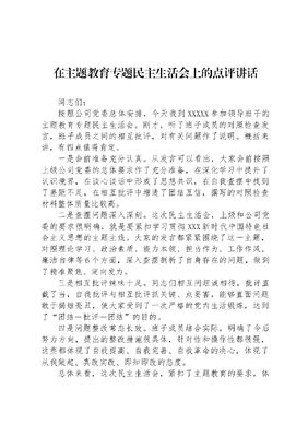 在主题教育专题民主生活会上的点评讲话同志们:按照公司党委总体安排,今天我到XXXXX参加领导班子的主题教育专题民主生活会。刚才,听了班子成员的对照检查发言,班子成员之间的相互批评,对有关问题作了说明。概括来讲,有四点值得肯定。一是会前准备充分认真。从发言可以看出,大家会前按照上级公司党委的总体要求作了充分准备,在深化学习中提升了认识境界,在谈心谈话中形成了思想共识,在自我查摆中找到了差距不足,在相互批评中增进了团结互信,撰写的对照检查材料整体质量比较高。二是查摆问题深入深刻。这次民主生活会,上级和公司党委的要求很明确,就是要紧扣学习贯彻XXX新时代中国特色社会主义思想的主题主线。大家的发言都紧紧围绕了这一主题,对照理论学习、政治素质、能力本领、担当作为、工作作风、廉洁自律等6个方面,深入查摆剖析了自身存在的问题,做到了精准聚焦、定向发力。三是相互批评辣味十足。同志们相互间坦诚相待,批评直截了当,自我批评与相互批评抓关键、点要害,能够直面问题敢于揭短亮丑,使大家受到了一次严格的党内生活锻炼,达到了团结-批评-团结的目的。四是问题整改常态长效。班子成员结合实际,明确了今后努力方向,提出的整改措施很具体,针对性和操作性都很强,这些都体现了自我提高、自我完善、自我革命的决心,体现了从我做起、真改实改、即知即改的态度。总体来看,这次民主生活会,紧扣了主题教育的要求,体现了全面从严治党的要求,收到了发扬民主、查找问题、形成共识、增进团结的预期效果。但与上级要求相比,还有一定差距和不足:主要是个别同志的发言还存在查找问题不够全、分析原因不够深、批评与自我批评不精准、没有完全把自己摆进去、整改措施不具体的问题,会后要进一步修改完善。下一步,公司党委要认真抓好主题教育学习成果的升华巩固落实工作,善始善终,善作善成,确保问题整改工作取得实实在在的成效,切实把主题教育成果转化为推动高质量发展的强大动力。下面,结合会议主题和实际工作,对做好本次主题教育专题民主生活会的后半篇文章提出几点要求。一、始终不渝与党中央和上级党委保持高度一致。在今后学习工作中,要深刻认识到增强四个意识、坚定四个自信、做到两个维护的重要性,持续加强党的创新理论武装,继续学习贯彻好XXX新时代中国特色社会主义思想,认真落实第一议题制度,充分发挥党委理论学习中心组学习示范引领作用,在思想上、政治上、行动上经常对表对标、及时校准偏差,确保党中央和上级党委各项决策部署逐级落地生根、开花结果。要坚持和完善党内民主生活制度,把主题教育的要求贯彻到今后的班子生活中去,用好批评和自我批评这个武器,增强班子团结,着力提高班子发现和解决自身问题的能力,不断提高科学决策和民主决策的水平,真正把公司领导班子建设成一个政治上信得过、作上过得硬、关键时候靠得住的战斗集体。同时,要履行好全面从严治党两个责任,进一步加强党风廉政建设,加强对权力运行的制约和监督,扎紧制度的笼子,严肃查处发生在干部职工身边的微腐败问题。二、始终不渝坚持不懈持续巩固提升主题教育成效。这次主题教育专题民主生活会开得很充实,虽然只有半天时间,但大家都找出了自己的问题,认识到了工作中的差距,问题认识到了并不等于解决了,真正解决这些问题还需要在会后整改中下一番硬功夫。大家要把抓好检视问题的整改整治作为巩固提升主题教育效果的重要内容,深刻领会XXXXXX关于以学铸魂、以学增智、以学正风、以学促干重要论述的丰富内涵和实践要求,以此次专题民主生活会为契机,将查摆出的问题和提出的批评建议融入主题教育整改整治,制定完善整改方案,统筹组织整改,做到持续用力、一改到底,确保主题教育成果的长效机制落地见效。领导班子、班子成员要主动带头,从自己做起,从点滴做起,从日常做起,从职工反映最多的地方改起,对职工反映集中、民主生活会上查摆出来的突出问题,要即知即改、立说立行、立破并举。要坚持思想问题和实际问题一起抓,大的问题和小的现象一起查,要拿出具体管用的整改方案,列出问题清单,实行台账式管理、项目化推进。同时,要注重当下改与长久立相结合,对反复出现的问题深挖根源、完善体制机制、补齐制度短板、堵塞工作漏洞,努力实现标本兼治、长效常治。三、始终不渝坚定不移全力推动公司高质量发展。无论主题教育,还是专题民主生活会,最终效果还要落脚在更好地推动重点工作的开展上,体现在生产经营指标的改善上。大家要自觉融入公司发展大局,把上级党委和地方政府的各项工作部署、具体要求体现到日常工作中去,持续深入抓好主题教育成果的巩固、深化和转化,把主题教育激发的昂扬斗志和热情干劲转化为推动改革发展的新动能。公司班子成员要带头树立强烈的使命意识、责任意识,紧扣高质量发展这个首要任务,聚焦生产经营指标这个重要标尺,对照自己分管范围的工作重点,恪尽职守、一心