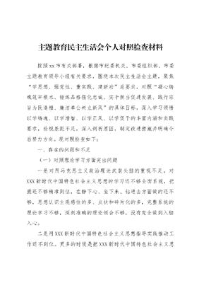 主题教育民主生活会个人对照检查材料按照xx市有关部署,根据市纪委机关、市委组织部、市委主题教育领导小组有关要求,围绕本次民主生活会主题,聚焦学思想、强党性、重实践、建新功总要求,对照凝心铸魂筑牢根本、锤炼品格强化忠诚、实干担当促进发展、践行宗旨为民造福、廉洁奉公树立新风的具体目标,深入学习领悟以学铸魂、以学增智、以学正风、以学促干的丰富内涵和实践要求,检视差距不足,深入剖析原因,制定改进措施并明确今后努力方向。现对照检查如下:一、存在的问题和不足(一)对照理论学习方面突出问题一是对用马克思主义政治理论武装头脑的重视不足。对XXX新时代中国特色社会主义思想的学习还不够全面系统,把握还不够精准到位,在静下心、坐下来、钻进去方面做的还不够,思想认识主观感性的多、点状和碎片化的多,完整系统的理论学习不够,深刻准确的理论领会不够,没有完全做到入脑入心。二是用XXX新时代中国特色社会主义思想指导实践推动工作还不到位。更多的时候是把XXX新时代中国特色社会主义思想作为理论来学习,而没有深刻认识到其对指导实践推动工作的强大伟力,更没有全面领悟到其中既包含世界观、历史观,又包含认识论、方法论:既讲是什么、为什么,又讲怎么看、怎么办;既部署过河的任务,又指导解决桥或船的问题,对其中蕴含的基本方法、思维方法、工作方法等没有做到举一反三、活学活用、融会贯通。(二)对照政治素质方面突出问题一是理论学习不到位。在日常学习中,存在重此轻彼的现象,对XXXXXX关于统一战线、民族宗教、民营经济等方面的重要论述、重要讲话学习多、思考多,对XXXXXX在其他领域的论述讲话关注少学习少,导致对党中央重大决策部署的深刻理解、精准把握上还不够到位。二是政治能力仍不足。面对工作中出现的新情况、新问题能够从政治的高度来看待,但一定程度上存在思想老化、方式老化、办法老化的能力危机,推动工作有效落实的方式方法不够多。(三)对照能力本领方面突出问题一是发挥基层党组织的战斗堡垒作用仍不足。对基层党组织的政治功能和组织功能认识不全面,对组织生活的重要性认识还不到位,落实组织生活制度有时形式大于内容,对业务工作、完成任务情况关心多,对党性修养、党员教育、廉政建设等方面强调得少,党支部的战斗力、凝聚力、向心力还没有完全体现出来。二是落实意识形态工作责任制方面不到位。没有真正从思想上认识到意识形态领域严峻复杂的形势和艰巨繁重的任务,往往是在研究党建工作或业务工作时顺带强调一下,几乎没有进行专题研究部署。在意识形态风险隐患排查整治中缺乏政治敏锐性和警惕性,工作没有落实到最基层最末梢,对个别领域、个别方面失管失察。(四)对照担当作为方面突出问题一是贯彻落实上级决策部署不到位。虽然能够坚定不移坚持以人民为中心的发展思想,结合工作实际完整、准确、全面贯彻新发展理念,但在具体贯彻落实党中央和省委、市委决策部署过程中,有时存在对上级精神领会不充分不透彻,联系自身资源禀赋不够紧密的情况,思路还不够开阔、措施还不够有力,导致一些工作缺乏特色和亮点。二是在满足干部职工群众新的期待和要求上有不足。努力做到继续以我为群众办实事实践活动为载体和抓手,认真了解、广泛听取干部职工和人民群众对分管工作的统筹协同、后勤管理、服务保障等方面工作的意见建议,并对相关问题认真研究、协调处理,实现分管各项工作再上新台阶。但还没有完全做到全面认清和系统把握不同群体的多样化、个性化、特殊化新需求,未能做到及时、科学、合理地回应各方关切、兼顾各类诉求。(五)对照工作作风方面突出问题一是斗争的效果仍不足。对工作和生活中出现的各种问题矛盾和不正之风,敢于带头发扬斗争精神能够做到旗帜鲜明地指出、批评、抨击。但有时面对不同的矛盾和问题,未能快速地选择出最合理的斗争方式,斗争的效果还不够好,方式和方法还需要进一步改进。二是防范风险的忧患意识和底线思维不到位。能够在关键时间节点对关键部位重要场所进行巡视检查、责令整改,但对照常态化抓安全的工作要求反思自身,人民至上、生命至上的理念树得还不够牢,万无一失、一失万无的底线思维、风险就在身边的忧患意识、时时放心不下的责任意识还没有完全形成,一定程度上还存在侥幸心理、麻痹思想。(六)对照廉洁自律方面突出问题一是落实全面从严治党政治责任上仍不足。能够扎实履行全面从严治党责任严格遵守中央八项规定及其实施细则精神和我省实施办法,自觉接受组织和群众的监督。但对自己所分管部门的党员干部职工教育管理、监督提醒还不够到位,没有真正做到拉下面子、硬起手腕,对一些苗头性、倾向性问题,未能及时地进行咬耳朵、扯袖子、敲警钟。二是加强新时代廉洁文化建设的招数仍不足。充分认识到加强新时代廉洁文化建设的重大意义,但在加强廉洁文化建设的具体工作中,仍习惯于运用悬挂标语、制作展板等传统的静态传播
