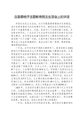 在县委班子主题教育民主生活会上的讲话开好这次民主生活会,对于加强县委常委班子自身建设,充分发挥常委班子的示范带头作用,确保各项工作顺利进行,具有十分重要的意义。会前,县委专门下发通知做了安排,并采取多种形式,广泛征求了社会各界对县委班子及班子成员的意见建议。各位常委也本着对组织和个人高度负责的态度,认真对照六个方面内容,认真开展了党性分析和对照检查,通过谈心交流和查摆剖析,真正达到了统一思想、理清思路、增进团结的目的。一年来,在中央和省市委的正确领导下,县委坚持以XXX新时代中国特色社会主义思想和党的XX大精神为指导,认真贯彻落实中央和省市委的各项决策部署,牢固树立以人为本、执政为民理念,与时俱进,开拓创新,真抓实干,较好地发挥了领导核心作用。各位班子成员都能立足自身岗位,恪尽职守,苦抓实干,做了大量卓有成效的工作,为推动全县经济高质量发展发挥了积极作用。今年上半年,全县地区生产总值达到81.7亿元,工业增加值达到40.8亿元,财政收入达到4.2亿元,社会消费品零售总额达到23.8亿元,城镇居民可支配收入达到8550元,农民人均现金收入达到7560元。预计年底,地去生产总值达到115.5亿元,工业增加值达到68.4亿元,财政收入达到8.6亿元,社会消费品零售总额达到48.5亿元,城镇居民可支配收入达到16550元,农民人均现金收入达到26330元。2023年,全县经济总量已经由全省县市区第十位上升至第五位,主要经济指标增速跃居全市乃至全省第一,对全市经济增量的贡献超过50%。这些成绩的取得,是省市委坚强领导和大力支持的结果,也是全县广大干部群众真抓实干、努力拼搏的结果,借此机会,我向大家表示衷心的感谢!一年来,县委班子在加快经济发展,做大经济总量的同时始终坚持把以改善民生为重点的社会建设摆上重要位置,全面落实各项惠民政策,每年为群众办10件实事,千方百计让群众更多地享受到了高质量发展的成果,赢得了群众的信赖,受到了基层的好评;坚持把每年11月定为年度调研月,由区级领导牵头深入基层、深入一线,集中开展调查研究,问计于民,问政于民,科学制定发展思路和奋斗目标,为全县经济高质量发展奠定了基础;班子成员能够从严要求自己,自觉践行宗旨意识,不断加强党性修养,看重事业,淡泊名利,不计得失,正确对待党和人民赋予的权力,廉洁奉公,勤政务实,树立了县委班子的良好形象。但是,我觉得班子成员在思想、工作、作风等方面还是存在着一些差距和不足。部分同志在抓具体工作方面投入精力多,静下心来钻研理论知识少,运用学习成果指导工作实践、解决发展问题方面还存在一定差距;个别同志在抓发展方面思路广、办法多,但是服务群众观念还不强,帮助群众排忧解难方面做的还不够;个别同志在抓工作落实上有所松懈。我们召开县委班子民主生活会,就是要进一步加强领导班子建设,在XXX新时代中国特色社会主义思想的指导下,充分发挥党委总揽全局、协调各方的领导核心作用,在实践中不断提高党委班子的凝聚力和战斗力;就是要让大家牢牢树立以人为本、执政为民的理念,密切联系群众,尊重群众首创精神,做到群众利益优先,着力解决民生问题,不断凝聚干群共识,切实维护人民群众的合法权益;就是要让大家始终坚持廉洁奉公、顺应民意,任何时刻不能放松廉政建设,特别是要保持清醒的政治头脑,做到一身正气、两袖清风。借此机会,我再强调三点:第一,要始终保持奋发有为、顽强拼搏的精神状态,以高质量发展业绩取信于民。县委班子是全县经济社会发展的导航标、领路人,越在经济社会高质量发展的关键时期,越要体现出我们的政治觉悟,体现出我们的大局意识,体现出我们的群众观念。要始终坚持发展是第一要务不动摇,突出高质量这个主旋律,坚定信心,振奋精神,以强烈的工作责任心和使命感,全身心投入到本职工作当中,全力以赴抓好重点项目建设、农产品流通销售、惠民政策落实、社会事业发展、文明城市创建等重点工作,高标准、高质量、高水平地完成全年各项任务。第二,要始终坚持以人为本、执政为民的理念,以富民安民的实际成效取信于民。以人为本、执政为民是我们党的生命根基和本质要求,也是我们党一贯的政治主张和执政理念。只有坚持以人为本、执政为民,我们党的执政地位才能牢不可破,我们的事业才能蓬勃发展。深刻认识和深入实践以人为本、执政为民思想,是每一个党员领导干部的重要任务和历史责任。县委班子成员更要扑下身子,深入一线开展工作,要在工作中密切联系群众,充分尊重群众的创造和探索,从群众中吸收营养,汲取智慧和力量;要牢固树立正确的政绩观,坚持以人为本,在高质量发展进程中紧紧依靠人民群众,充分尊重民意,把倾听群众呼声,关心人民疾苦,实现人民群众的最大利益作为一切工作的根本出发点和落脚点,让人民群众共建共享高质量发展的成果。第三,要始终坚持廉洁自律、率先垂范的优良作风,以勤政廉政的良好形
