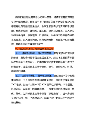 根据区委主题教育领导小组统一部署,经请示主题教育第三督导小组同意后,我单位于xx月xx日召开了学习贯彻XXX思想主题教育专题民主生活会。会议紧紧围绕学习贯彻新思想主题,聚焦学思想、强党性、重实践、建新功总要求,深入学习领悟以学铸魂、以学增智、以学正风、以学促干的丰富内涵和实践要求,深入查摆问题,进行思想剖析,开展批评和自我批评。现将会议召开情况报告如下:一、精心组织筹备,做好会前准备工作(一)提高思想认识,精心安排部署。领导班子以严肃认真的态度,及时安排部署民主生活会工作,拟定《主题教育专题民主生活会工作方案》,严格按规定和要求对各环节工作作了详细部署。方案对民主生活会会前、会中、会后任务、时限、要求进行明确。(二)注重学习研讨,筑牢思想根基。通过理论学习中心组集体学习、个人自学等方式加强理论学习,组织班子成员学习XXX思想、党的**大精神以及XXX关于以学铸魂、以学增智、以学正风、以学促干的具体要求,,持续抓好新思想深化、内化、转化,为开好民主生活会做好思想热身,进一步提高了政治站位、统一了思想认识,筑牢了开好此次民主生活会的理论基础。(三)加强意见征询,找准找全问题。间以书面形式广泛征求党员、干部和群众意见建议,经召开座谈会、个别访谈等方式广泛征求意见,真正把群众的意见充分收集起来、反映上来,原汁原味反馈先后征求40名党员、8名群众的意见,共征求意见建议17条,班子成员主动认领,为查摆问题、撰写班子对照检查材料和个人发言提纲提供了重要参考。(四)组织谈心谈话,凝聚思想共识。主要领导与分管领导、党组成员之间、党组成员与分管科室等交换了意见。谈心谈话做到与工作实际紧密结合,把存在的差距与不足谈清楚讲透彻,真正从思想上进行反思,深刻剖析产生问题的根源,诚心认领意见,并对谈心谈话内容进行梳理,在会上相互批评意见。(五)撰写对照检查,深刻反思总结。党组及班子成员坚持理论联系实际,坚持问题导向,强化问题意识,认真撰写领导班子对照检查材料和班子成员个人发言提纲。党书记亲自主持起草对照检查材料,做到直奔主题,逐个查摆梳理,深刻挖掘问题根源,坚持不避重就轻、直面问题,点准死穴、直指要害,揭深层次矛盾,真正触动思想、触及灵魂。班子成员个人发言提纲自己动手撰写,认真修改,剖析存在的问题,挖掘问题根源,有针对性制定整改措施。二、发扬民主作风,开好民主生活会(一)批评与自我批评严肃认真。党组书记通报了2022年度专题民主生活会整改落实情况,并带头作个人发言。党组成员结合自身工作依次作对照检查,深入开展批评和自我批评。大家敞开心扉、直奔主题,集中谈问题、谈差距、谈不足,真点问题、点真问题,开诚布公,坦诚相见,畅所欲言,展现了对党的忠诚、对事业的负责、对同志的关心。通过相互批评,使每位班子成员对存在的问题有了更加清醒深刻的认识,进一步坚定了理想信念,增进了班子团结,提升了班子整体合力,被批评的同志真诚面对、虚心接受他人批评,切实达到自我净化、自我完善、自我革新、自我提高的目的。(二)督导组点评精准客观。第三督导组组长xx做全面点评,对此次专题民主生活会给予了充分肯定,并对下一步工作提出了希望和要求,具有很强的指导性和针对性。(三)表态发言诚恳坚决。党组书记代表局党组做表态发言,要求班子成员根据会上查摆出的问题和批评提出的问题,进行认真修改,建立整改清单,明确整改措施和方向,切实将民主生活会成果转化为干事创业成果,为区域经济社会高质量发展做出新的更大贡献。三、下一步主要措施(一)强化整改落实。针对查摆出阿里的问题,全部建立岗位职责、检视问题和整改落实三类清单,梳理明确即知即改阶段性整改和长期整改三类问题,坚持以马不离鞍、缰不松手的定力持续推动问题整改,压实整改责任,强化工作落实,细化工作举措,确保在规定时间内完成整改,做到逐一销项。(二)强化理论武装。深入贯彻落实XXX思想,断强化理论学习和党性锻炼,始终把坚定理想信念作为终身课题,真正做到坚持先学一步、深学一层,带头学习宣传贯彻党的**大精神,原原本本、逐字逐句学习研读,切实做到知其言更知其义、知其然更知其所以然,认真领悟**新思想新论断、作出的新部署新要求,打牢思想根基。(三)切实改进作风。要坚持以上率下,积极主动作为,把民主生活会的成效体现在整改效果上,体现在工作落实上,切实将问题整改成果转化为干事创业、攻坚克难的奋进力量,为政协工作全面提升贡献力量。(四)解决突出问题。根据此次专题民主生活会上查摆出来的问题、相互批评的意见以及基层单位的建议,充分发挥党委机关的桥梁纽带作用,把民主生活会的效果贯通到全局干群,结合前期调查研究发现的突出问题,对准焦距、找准穴位,责任到人,整改到位,防止只出题、不答题推动全局各项工作向更高层次迈进。