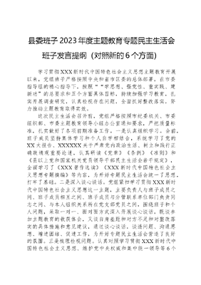 县委班子2023年度主题教育专题民主生活会班子发言提纲(对照新的6个方面)学习贯彻XXX新时代中国特色社会主义思想主题教育开展以来,党组班子严格按照中央和省市区委的总体部署,在市委指导组的精心指导下,按照学思想、强党性、重实践、建新功的总要求和五个方面具体目标,持续加强学习教育,扎实开展调查研究,认真检视存在问题,全面抓好整改落实,努力推动主题教育取得实效。这次民主生活会召开前,党组严格按照市纪委机关、市委组织部、市委主题教育领导小组办公室通知要求,严把质量标准,扎实做好了各项前期准备工作。一是认真组织学习。会前,班子成员坚持集体学习和个人自学相结合,系统学习了党的XX大报告、XXXXXX关于严肃党内政治生活、树立和践行正确政绩观重要论述,认真研读《党章》《条例》《准则》和《县以上党和国家机关党员领导干部民主生活会若干规定》,全面学习了《XXX著作选读》《XXX新时代中国特色社会主义思想专题摘编》等内容,为开好专题民主生活会统一了思想,打牢了基础。二是深入谈心谈话。党组紧扣学习贯彻XXX新时代中国特色社会主义思想这一主题,主要负责人与班子成员之间、班子成员相互之间、班子成员与分管联系单位部门负责同志之间、与本人组织关系所在党支部党员之间,围绕班子和个人问题,采取一对一、面对面方式深入开展谈心谈话,既谈参加主题教育的收获体会,又谈自身差距和对方不足和对整改落实的具体措施和意见建议,通过谈心谈话,谈透问题、沟通思想、增进团结、促进工作,为开好专题民主生活会营造了良好的氛围。三是梳理检视问题。认真对照学习贯彻XXX新时代中国特色社会主义思想、维护党中央权威和集中统一领导等6个方面,既梳理检视认领的问题,又梳理调查研究中发现的问题,全部建立了问题台账和整改清单。同时,组织班子成员采取座谈访谈、书面征求意见、深入基层一线等方式,广泛听取广大党员干部群众意见建议,并及时梳理归纳,涉及班子的吸收到班子检视剖析材料中,涉及班子成员个人的,原汁原味进行了反馈。四是深刻对照剖析。按照衡量尺子严、查摆问题准、原因分析深、整改措施实的要求,领导班子和班子成员坚持把自己摆进去、把职责摆进去、把工作摆进去,认真对照检查,深刻剖析反思,撰写发言提纲。我亲自主持起草了班子检视剖析材料,认真审核班子成员个人发言提纲。班子检视剖析材料分别征求了班子成员们的意见建议,确保了问题找准找实、原因剖析深刻、整改有力有效。一、存在的主要问题对照此次民主生活会重点把握的6个方面以及中央和省市有关要求,结合主题教育整改整治,对标对表、深刻检查,认识到自己还存在一些问题,归纳起来主要有以下7个方面:(一)学习贯彻XXX新时代中国特色社会主义思想方面。一是政治理论学习不够深入系统。县委常委会坚持把理论武装作为一项基础性工作来抓,但在勤学善思、深钻细研、学以致用上做得不够,还存在工作是硬指标、学习是软任务、干比学重要、学多学少差不多的思想和以干带学、学用脱节等问题。比如:对中央和省上确定的一些重大战略部署缺乏深入学习研究,没有完全将利好政策转化为推动发展的具体行动。这种学习的态度和方式,已难以适应当前知识更新的速度和形势发展的变化,与建设学习型班子的要求还有一定差距。二是在做实上还需要狠下功夫。运用XXX新时代中国特色社会主义思想破解难题的方法还不够多,韧劲还不足,比如:虽然认真学习了XXX生态环保理念,经常强调生态环境问题是不可逾越的底线,不能触碰的红线,多次安排部署对中央和省市环保督察反馈问题进行回头看。但在贯彻落实过程中没有充分运用党的创新理论指导实践,还是出现了*等问题。(二)维护党中央权威和集中统一领导方面。一是政治敏锐性不强。政治上站位不高,对一些敏感问题还缺乏警惕性和鉴别力,看不到潜在危险,对基层党组织的一些党员教育不及时,整顿不彻底。一些基层组织存在有令不行、有禁不止,执行政策打折扣的问题。对个别年轻党员干部政治纪律观念不强,把网络作为法外之地,随意发表言论诋毁党的政策、传播小道消息、泄私愤等问题管理教育不够。二是思想政治建设抓的不实。领导班子思想政治建设抓的不紧,思想政治工作针对性不强,理论武装不系统,思想解放不够,不能与时俱进,结合肃州实际,创造性地贯彻中央和省市委的决策部署方面需要进一步提高。对党员干部执行政治纪律的教育引导不到位,对一些党员干部存在的政治立场松动、理想信念滑坡、宗旨意识淡化、党性修养不高等消极倾向重视不够、纠正不力。(三)践行宗旨、服务人民方面。一是联系服务群众方面还有欠缺。个别领导干部抓经济得心应手,抓党建却不上心上手,布置安排虽然多,但具体落实不力。重农村和社区党建,轻非公企业和社会组织党建,重阵地建设,轻作用发挥。对软要求提的多,严约束办法少,考核干部联系服务群众的指标不硬,干部接地气不够。乡镇(社