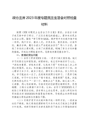 政协主席2023年度专题民主生活会对照检查材料按照《XX专题民主生活会工作方案》要求,会前在与班子成员集中学习研讨、广泛征求意见的基础上,紧扣本次民主生活会主题,围绕学习贯彻XXX,维护党中央权威和集中统一领导,践行宗旨、服务人民,求真务实、狠抓落实,以身作则、廉洁自律,履行全面从严治党政治责任等六个方面,查找了存在的主要问题,分析了问题根源,明确了努力方向和整改措施,形成此对照检查材料。现将有关情况报告如下。一、查摆的突出问题(一)在学习贯彻XXX方面。一是学习缺乏紧张感。缺乏学习的紧迫性和紧张感,时紧时松,有应付和被动学习心态,说起来重要、学起来次要、忙起来不要有时在自己身上体现比较强烈。比如:年初雄心勃勃制定了自己的学习计划,决心要学习多少书、做多少笔记、撰写多心得体会,但工作忙起来,学习就放在一边了,没有做到按照计划学习。二是学习缺乏深度。学习中往往存在看书看皮、看报看题现象,浏览文章内容也存在一目十行、蜻蜓点水现象,缺乏深入学、认真悟、用心笃的精神,导致对党的创新理论精神实质、思想精髓、立场方法掌握不深不透。比如:在学习XXXXXX关于政协工作重要论述时,没有带头主动去思考、去深入研究如何贯彻落实好XXXXXX的重要指示精神,导致提出来的贯彻落实措施全局性战略性实操性不强。(二)在维护党中央权威和集中统一领导方面。一是政治站位不够高。缺乏精准把握新时代中共中央关于政协工作重要方针政策,对新形势新任务新发展阶段下政协工作面临的新任务和新挑战缺乏深入了解和认识,导致服务全县主战略主定位思路、方法、举措还不够多。比如,XXXXXX提出推进全过程人民民主建设,把人民当家作主具体地、现实地体现到党治国理政的政策措施上来,具体地、现实地体现到党和国家机关各个方面各个层级工作上来的重要要求,自己在推动过程中不能站在全县这个大局去谋划,就民主谈民主、就民主抓民主,拿出更多更好有针对性的思路和办法不多。二是政治敏锐性不够强。对网络意识形态工作重视不够、抓得不紧,对政协机关网络意识形态阵地管理松驰。比如:政协机关制定了网站稿件三审三校制度,平时提了要求,但没有抓督促指导,致使单位户网站、微信公众号发布的信息还存在政治性错误、政治性差错的现象。(三)在践行宗旨、服务人民方面。一是联系群众不够好虽然建立了县乡村三级政协委员联络站(室)、领导干部联系帮扶群众制度,但执行不是很到位。坐在机关时间多,下到基层少,没有把大部分的工作时间用到基层一线、群众一线。有时下去了也没有抽出时间来与一线群众交流,推动解决群众需要解决的问题。比如:今年创新提出院坝协商,方案出台,自己参加活动偏少,了解人民群众的所想所盼不够。二是联系政协委员不到位。建立了领导班子联系政协委员、各专委会联系政协委员制度,但平时主动深入他们当中了解他们的思想工作比较少。比如:在开展请你来商量活动中,全年只开展了活动X次,并且是为了工作而工作,没有真正与他们交流。(四)在求真务实、狠抓落实方面。一是调查研究不深入调查研究是政协的基本功和开展工作的基本方法,但自己在调查研究过程中,经常有班子成员和部门同志参与,自己身入与心入上做得不够。比如:经常把调研工作与业务工作检查、宣传宣讲等工作同步进行,有时候一天跑几个乡镇、到几个单位,导致调研工作不够深入、不系统、不全面,对一些深层次问题解剖不够、研究不深,调研报告质量不高。二是民主监督不全面。面对经济社会方方面面的工作,问题短板比较多,人民群众反映也比较强烈,政协在开展民主监督不到位,跟上不经济社会发展步伐。比如:停车位不够带来的乱停车、电动车增多导致充电桩不够、易地搬迁带来的就业难等热点难点问题,紧贴问题短板开展民主监督不及时、不到位。(五)在以身作则、廉洁自律方面。一是我亲自的精神不足。凡是总是想着安排班子成员或专委会同志去落实,遇到重大的、复杂的问题请业务部门参加,自己主动想问题、解决问题的积极性主动性不足。比如:在开展界别三个一活动中,主动谋划少、主动参与少,活动中存在的问题责成分管副主席去研究解决,导致营造合作共事的氛围不够浓。二是形式主义问题仍然存在。在对表对表落实党委及上级政协机关安排的工作,有时存在应付式作风。比如:年初按照相关要求,要加大政协对外交流合作力度,广泛凝聚共识,在招才引智、招商引资等方面发挥政协优势,但到了年末,还没有完成相关目标任务,临时动议组团到XX省X市开展交流协作,导致协作效果不好。(六)在履行全面从严治党政治责任方面。一是落实全面从严治党两个责任有差距。作为政协党组书记,全面从严治党压力传导还不够到位,个别班子成员履行一岗双责不到位,对分管专委会和科室全面从严治党抓得还不够紧,缺少抓业务工作与抓全面从严治党工作两手都要抓、两手都要硬的精神,