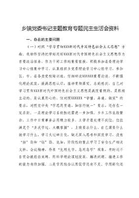 乡镇党委书记主题教育专题民主生活会资料一、存在的主要问题(一)对照学习贯彻XXX新时代中国特色社会主义思想方面。我始终坚持把学好用好XXX新时代中国特色社会主义思想作为首要政治任务、作为干好工作的重要前提,积极参加县委理论学习中心组集中学习,认真组织乡党委理论学习中心组学习,参加区、市、县各类党校培训班,仔细研读XXXXXX重要论述,不断强化理论武装,提高思想认识,推动贯彻落实。总的感到,自己对学习贯彻XXX新时代中国特色社会主义思想是高度重视的、是积极主动的、是认真用心的,但对照XXXXXX学懂、弄通、做实的要求,对照党中央学思用贯通、知信行统一要求,还存在一定差距。一是理论学习系统性还需进一步加强。乡乡工作比较繁杂,工作中日常事务占用精力较多,工学矛盾处理不到位,往往满足于多次学过、大概掌握,上级要求什么、自己需要什么就学习什么,学习太过碎片化,缺乏深入思考和深度学习,没有挤劲和钻劲。比如,阶段性的重点学习了安全生产相关文件、会议精神,存在先用先学、急用急学现象,有时还不自觉会被经验束缚,用科学理论谋划发展、解决问题、推进工作的能力有待加强。二是学用结合以用促学还有不足。学用转化还不够紧密。真正将学习成果转化为增强工作本领、破解产业振兴难题的良方妙药上还有差距,熟练运用贯穿其中的马克思主义立场、观点、方法解决实际问题的能力还不够强。对我乡乡村振兴、环境整治、产业发展等面临的新形势新任务新问题思考和研究不够深入,没有创造性地运用新思想指导相关工作实践,解决制约XX发展的问题瓶颈。比如,对标县委产业发展,我乡目前只有种养殖业成规模,但是在文化、旅游、康养等方面仍缺科学谋划,没有将学习成果转化为产业融合发展的思路。(二)对照维护党中央权威和集中统一领导方面。我始终把两个维护作为最高政治原则和根本政治规矩,坚决同以XXX同志为核心的党中央保持高度一致,坚决维护党中央权威和集中统一领导。能够在坚决执行中加深理解,在深化理解中自觉执行,在想问题、作决策、抓工作时自觉同XXXXXX重要讲话和重要指示批示精神对标,同党中央及区、市、县各项重大决策部署对表,忠实履行党章赋予的职责,不断提升从政治上观察分析形势谋划推进工作的能力水平。但深入反思,还有不足之处。一是政治敏锐性不强。作为乡党委一把手,从政治上观察、分析、处理问题的敏锐性不强,见微知著的能力素质还有差距,对意识形态领域斗争得严峻性、复杂性、隐蔽性认识浅薄,缺乏必要的警惕性和鉴别力,管控意识形态领域的能力和水平存在短板和盲区。二是政治执行力不足。在从全乡发展的全局高度思考和谋划问题时,缺乏全面思考的深度、工作站位的高度、大刀阔斧的力度。对短期利益考虑多、对自身困难强调多,把握发展大势、考虑全局利益少,没有真正从心怀国之大者的战略高度看待工作。比如,工作中偶尔会有就事论事的倾向,在处理一些急事、小事时,总习惯于找参照、找惯例,缺少全面深入的思考。(三)对照践行宗旨、服务人民方面。我始终坚持以人民为中心的发展思想,牢记为民宗旨,把维护好、发展好最广大人民根本利益作为各项工作的出发点和落脚点,着力解决群众的操心事、烦心事、揪心事。但对标先进,还存在一些不足。一是为民服务的宗旨意识有所弱化。随着工作年限的增长,为民服务意识有所减弱,工作中大多数时间忙于日常行政事务、会议以及应对上级调研、检查等,对群众日益增长的需求、最关心最直接最现实的利益问题把握不够精准、服务水平有待提高,未能恰当平衡尽力尽责与量力行事之间的关系,关切民生的行动尚显不足比如,工作中仍存在电话了解情况、办公室听取汇报多,亲自带队入村串户调研了解少,真正坐下来与村干部和群众面对面、心贴心交流少的现象,导致日常工作中了解面上情况多,发现深层次问题少,所以在开展工作、做决策过程中针对性、有效性还有差距。二是为民服务的能力本领还有欠缺。作为一个长期在基层工作的同志,时间久了就错误的认为,政府和群众之间的关系,是管理与被管理的关系。统筹推进工作时,只想高质量完成各项工作任务,未能时刻把政治立场摆在干事创业的首位,把群众的口碑作为谋划工作的出发点,导致有的工作政治性不够强,存在重硬性要求轻群众需求的思维方式。比如,对群众关心的普惠性政策补贴、就业等热点难点问题,大多是研究布置后安排各分管领导抓好落实,自己带头全程跟踪、一抓到底的少说到底还是服务群众的积极性和主动性有差距。(四)对照求真务实、狠抓落实方面。能够始终牢记国之大者,带头贯彻执行党中央及区、市、县党委和政府决策部署,求真务实真抓实干。但深入查摆,还存在以下问题。一是不折不扣抓落实的韧劲还不足。抓工作缺乏一竿子插到底的韧劲和狠劲,对费时费力、关系长远的工作缺乏持之以恒、久久为功的劲头,在完整、准确、全面贯