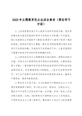 2023年主题教育民主生活会素材(理论学习方面)1.上级党委理论学习中心组学习成果开放度不够,没有形成确定的与基层党组织共享学习成果的工作机制。作为基层,我们仅能够在公开报道中了解到XX党委中心组学习取得了很好的成效,但具体内容无从掌握,建议XX党委能够建立常态化共享学习成果的机制,及时把学习成果输送下来,让基层党组织开展集中性学习研讨时有更加明确的方向。2.上级党委在举办主题教育相关培训班时,课程体系较为丰富,但结合生产经营实际进行指导还比较薄弱。主要体现在两个方面:一是体制内写作助手原创在诸多课件中即存在讲政治理论较多、讲实践案例较少的情况;二是在交流研讨的环节,对于生产经营任务如何与所学知识贯通结合起来,指导还不够具体,要求还略显宏观。3.理论学习不深不透。对XXX新时代中国特色社会主义思想实质掌握得不够牢,学习的主动性、规划性、系统性不足,理论学习与实际工作结合的不够,在学懂、弄通、做实上还存在较大差距。比如,XXX新时代中国特色社会主义思想指出,中国特色社会主义进入新时代,要坚持以人民为中心的发展思想,更好地满足人民群众日益增长的美好生活需要,但是在园区发展过程中,失地农民就业养老和拆迁群众安置还建等方面保障,与人民群众的需求仍有一定的距离。4.一是理论学习不够系统。习惯于通过理论学习中心组、支部主题党日等方式开展理论学习,或者通过手机、网络等方式进行零散地学习,在全面、系统、深入学习上做得不够。比如,平时对XXXXXX关于党的建设和组织工作的重要论述学习研究多一些,但对高质量发展、供给侧结构性改革等重要论述的学习还不够。二是学以致用还有差距。XXX新时代中国特色社会主义思想博大精深、内涵丰富,平时对如何运用XXX新时代中国特色社会主义思想来指导实践、推动工作,如何将新思想转化为高质量发展的生动实践,思考得不深,研究得不透。比如,在打造共建共治共享的基层治理格局方面,我们虽然做了一些工作,但对标治理体系和治理能力现代化的要求,工作成效上仍有差距。5.对XXX新时代中国特色社会主义思想的学习、理解还比较零散、微观,对其鲜明的时代性、严密的系统性、深邃的科学性、强大的实践性等方面思考还不是很深入、细致,在深刻领会、系统把握、融会贯通上还有欠缺。在学习形式上,比较注重集体传达学习和个人自学,在组织政府班子成员集中研讨、相互交流、共同提升上做得还不是很到位,对新思想的理解有时局限于自己的点滴之悟。在学习内容上,根据政府工作实际,对习XXX关于加强党的政治建设、扶贫开发战略思想、八个坚持生态文明思想,以及防止和克服形式主义、官僚主义、民营经济座谈会等精神学习、运用得相对多一些、深一些,在系统学习、整体把握、全面应用新思想上做得还不够。6.在学习上存有两个不够:一方面,学习深度不够,特别是XXXXXX系列重要讲话精神,自己虽然一直在认真学、用心悟,但在理解把握上深入不够,对其蕴含的马克思主义世界观方法论掌握不深透,导致思想观念、思维层次等方面还有一定差距,在运用学习成果指导单位建设上效果不明显。另一方面,学习定力不够。面对新形势新要求,虽有加强学习的紧迫感,但因受大项工作多、事务繁杂的影响,还存在理论学习时紧时松、急用现学、入心不够、结合不紧的现象。在自身学习上存在任务心理,学的东西够用就行的思想,没有深钻细研的劲头;在履行第一责任人上还存在过关心理,抓班子和中心组的学习狠劲不足,特别是在大项活动、工作头绪多的时候,学习计划与落实上存有脱节现象,影响了集中学习的质量和效果。7.学用结合方面还有欠缺。工作中始终坚持以XXX新时代中国特色社会主义思想为统领,但是运用党的历史经验和创新理论分析问题、研究问题、解决问题还有差距。比如,党的XX大报告中提出,要促进区域协调发展,推进京津冀协同发展,我们在这方面研究的还不够细,对京津企业外迁动态掌握不够及时,京津企业在我县落户的还不够多。8.一是学深悟透、弄通做实有差距。领导班子能够自觉学习党的XX大报告相关内容,但总体来看,深刻思考得还不够全面透彻,还缺少磨的工夫和钻的尽头,特别是面对出现的新情况、新问题、新矛盾,存在按部就班、思路不宽、办法不多等问题。二是学以致用、指导实践有差距。在坚决贯彻党中央各项决策部署和省市及市委相关要求时,能够立足主责主业,高效落实。但有时思考问题、处理问题没能更好的从全局的角度出发,思想认识较为片面,工作成效不够明显,解决问题的出发点和落脚点还不十分准确。9.一是理论学习抓的不紧。对理论学习不重视,为完成学习任务被动应付,缺乏一寸一寸凿,一尺一尺敲的韧劲,对马克思主义及其中国化理论,尤其是对两个确立的时代意义、理论意义、实践意义、世界意义和科学内涵、实践要求等理解的不深学透,参加集体学习和日常学时,满足于听听课,写写笔记,对所学内容没有