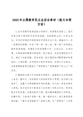 2023年主题教育民主生活会素材(能力本领方面)1.应对化解风险挑战能力待提升。发展理念创新上,面对发展过程中遇到的矛盾风险挑战,未能积极主动,打好主动仗,针对项目推进中的困难和矛盾也办法不多,措施过少,对一时遇到的难题,存在等一等、放一放、缓一缓的观望态度和畏难情绪,协调各方抓好清理工作,主动出击、主动沟通、反复协调的精神不够自觉,敢于担当、攻坚克难的劲头不足,满足于当前局面、现有成绩,缺乏强烈的问题思维和忧患意识,正视问题、应对风险方面还有短板,在建立长远规划、完善管理制度等方面缺乏啃硬骨头的精神和攻山头的作风。2.履职担当善于作为的能力待提升。坚持党内生活原则性上存在一团和气、你好我好大家好的老好人思想,批评别人怕说多了、说重了会影响团结和谐的氛围,还欠缺一些党味辣味火药味。班子成员对于新常态下如何进一步担当尽责,更好地服务学校发展,自我加压还不够,面对越来越高的工作标准、纪律约束,不由地产生歇一歇、缓一缓的念头,缺乏越是艰难越向前、敢叫日月换新天的精气神,在担使命上还存在因循守旧、求稳怕乱的思想,缺少拉得出、冲得上、打得贏的大无畏勇气和决战决胜的斗争精神,有的工作标准不高、要求不严,缺乏竞争意识,只求过得去、不求过得硬,创不出亮点特色,工作的锐气和劲头有所减弱,契而不舍狠抓落实的主动性不强,缺少了抓铁有痕的韧劲。3.应对新形势新问题的能力待提升。在舆情应对处置中,风险提示工作还未做到常态化,舆情风险意识、风险研判尚显不足,贯彻新发展理念意识有时还不够积极主动,在创新举措方面不够大胆、站位不高、思路不宽,对全局的长远的关注不够、思考不深、把握不准,对接改革、迎接改革做的还不够主动,对一些新情况新问题,没有时时刻刻扑下身子去抓落实,破解建设的难题。面对当前学校工作面临的许多难题和矛盾,缺乏中流击水、闯关夺隘的拼劲,知难而进、迎难而上的勇气和锐意进取、攻坚克难的锐气,在敢抓敢干、主动作为上还有待进一步加强,缺少一抓到底、层层加压的力度。4.在解决急难险重上还有差距。面对急难险重的繁重任务时,动真碰硬的勇气不足,攻坚克难的力度不够。比如,在开展农村环境综合整治时,用力不均衡,长效机制还不健全,出现有时紧时松的现象,持续抓促的力度还不够,体现在工作成效上,农村环境面貌呈现季节性、阶段性的时好时坏,还有村与村之间存在不平衡。5.开拓创新的能力水平还有差距。干工作时仍存在按部就班、四平八稳的思想,以新发展理念创新推动工作的意识和能力不足,没能充分适应新时代稳重求变的工作要求,惯用一些常规性工作举措,存在路径依赖和惯性思维,有时虽然有些新想法,想大胆地创造性地开展工作,但又求稳怕乱,怕用新思路会影响工作大局,未付之实践。6.谋全局抓统筹还不够全面。虽注重站位全局,积极主动承担市委中心工作,但有时因担心越位,在主动发挥市委的全面领导作用上做得还不够多,对不直接分管的工作往往参与和过问较少,对自己分管工作也是中心工作、重点工作抓的多,常规性、基础性工作研究的少。比如对信访稳定等工作抓得紧、盯得牢,对营商环境、农业结构调整等领域研究推动不够,统筹兼顾做的还不够全面。7.破解难题还有待坚强有力。立足新发展阶段,带头履职尽责、攻坚克难,破解突出矛盾问题的措施办法不足,一些工作满足过得去,不求真正过得硬,干事创业的责任担当有所减弱,缺乏钉钉子精神狠抓落实,尤其是面对缠点堵点,被动应付的多,带头迎难而上的少。比如对解决信访老户的办法不多,消化的不快,虽然多次研究部署,一直想下大力气解决,但对个别问题还是一直久拖未决,没有找到切实有效的解决途径。8.运用新发展理念不够科学。在将新发展理念转化为引领发展的思维方式上,缺少主动的思考和积极的实践,导致未能及时有效地运用新发展理念去思考审视、研究分析工作,还是用传统理念和惯性思维推动经济社会发展,与新时代的高标准要求渐行渐远。在把新发展理念转化为谋划工作的科学方法上还有不足,缺少将新发展理念全面融入工作中的有效方法,对不适应不符合新发展理念的认识、行为和做法,调整、纠正和摒弃得不够及时和彻底,导致个别时候缺乏应有的历史主动的政治担当和锐意创新的行动自觉。9.化解风险挑战能力待提升。在工作中能够认真落实六稳六保任务要求,但系统思维、危机意识还不够强,补短板、堵漏洞、防范化解风险挑战的本领有待加强。比如,面对常态化疫情防控还存在重眼前、轻长远思维,面对突发公共卫生事件研判、领导决策上能力有待提升,巩固脱贫攻坚成果和乡村振兴衔接的有效举措以及助力中小企业的思路办法都有待加强。10.斗争本领不够强。主要是对巡察队伍专业化建设用力不够,对巡察干部全方位教育培训不足,现有巡察干部能力水平不够高,对开展巡察工作所需的政策理论和法律法规知识储备不足,发现深层次问题的能力不强,不会巡