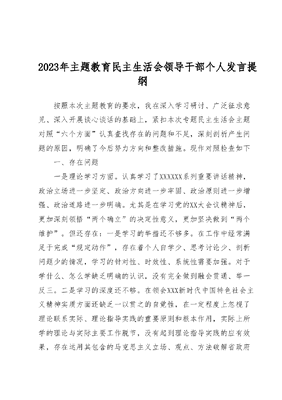 2023年主题教育民主生活会领导干部个人发言提纲按照本次主题教育的要求,我在深入学习研讨、广泛征求意见、深入开展谈心谈话的基础上,紧扣本次专题民主生活会主题对照六个方面认真查找存在的问题和不足,深刻剖析产生问题的原因,明确了今后努力方向和整改措施。现作对照检查如下一、存在问题一是理论学习方面。认真学习了XXXXXX系列重要讲话精神,政治立场进一步坚定、政治方向进一步牢固、政治原则进一步增强、政治道路进一步明确。尤其是在学习党的XX大会议精神后,更加深刻领悟两个确立的决定性意义,更加坚决做到两个维护。但还存在:一是学习的举措还不够多。在工作中经常满足于完成规定动作,存在着个人自学少、思考讨论少、剖析问题少的情况,学习的针对性、时效性、系统性需要加强。对于学什么、怎么学缺乏明确的认识,没有完全做到融会贯通、举一反三。二是学习的深度还不够。在领会XXX新时代中国特色社会主义精神实质方面还缺乏一以贯之的自觉性,在一定程度上忽视了理论联系实际、理论指导实践的重要原则和根本作用,实际上所学的理论与实际主要工作脱节,没有起到理论指导实践的应有效果,存在运用其包含的马克思主义立场、观点、方法破解省政府办公厅综合运转协调的难题不到位的问题。三是融会贯通的力度还不大。把XXX新时代中国特色社会主义思想中的世界观和方法论与分管工作深度融合还不够到位,用政治眼光观察和分析问题的水平还有待提高,主动服务和融入全省工作大局,围绕省政府中心工作履职尽责的政治自觉还不够。二是政治素质方面。始终坚持以人民为中心的发展思想,在发展中保障和改善民生,聚焦解决干部群众的急难愁盼问题,但还存在:一是对两个确立的认识不足。虽然已经入党多年,但是政治素养方面还不够高,政治判断力、政治领悟力、政治执行力不够强,对两个确立中的理论逻辑、历史逻辑和实践逻辑,未能完全做到知行合一。从综合统筹协调以及为省领导参谋辅政工作中体现政治导向、政治要求做得还不到位。二是对国之大者把握不够到位。尽管努力做到时刻关注党中央和省委、省政府在关心什么、强调什么,但是对于抓好XX、XX等工作的重大意义等理解领悟不够深入深刻,对于其所肩负的责任感使命感认识不到位,站在国之大者的政治高度和工作力度去抓工作做得不到位。三是对党建引领落实还不够细致。政治机关意识树得还不够牢,还存在思想认识误区,对于分管处室的党建工作责任链条拧得不紧、业务和党建融合不够,对于支部组织生活会质效提升没有明确严的标准,存在两层皮的情况。三是能力本领方面。能够用XXX新时代中国特色社会主义思想统一思想、统一意志、统一行动,自觉把分管党员干部凝聚起来推进各项工作,但还存在:一是思维能力不够全面。在工作当中新发展理念树立不够牢靠,工作中系统思维运用不够充分,没有以更加开阔的眼界、思路和胸襟,从推动全省发展大局的高度看待工作,对国家宏观经济形势、党中央和省委、省政府的决策部署没有做到心中有数,脑中有方,对于工作的重心找得不准,对于一些职能交叉、信息交融、问题交织的牵头协调组织领域没有统筹考虑,没有彻底打破信息壁垒,导致工作成效体现不充分。二是业务水平不够高。在落实上级对高质量开展XX工作的重要部署要求的方法还不够务实管用,把握上级会议精神不够准确,推动落实上级议定事项不够及时、不够有力,业务能力没有做到与时俱进,把上级要求部署融入实践工作当中还有欠缺。三是斗争本领不够硬。面对新形势新任务,缺乏政治敏锐性和政治洞察力斗争本领不够强,做好群众工作、应对风险挑战的本领还有待进一步提升,缺乏及时发现和解决自身存在问题的意识和能力。四是担当作为方面。能够认真贯彻落实XXXXXX关于XX工作工作的重要指示批示精神贯彻落实到位方面,但还存在:一是引领作用发挥不力。作为班子成员,统筹作用发挥不够充分,系统性体系化抓大事谋大事还不够,对如何牢牢把握XXXXXX点的问题、教的方法、指出的路径,更好地融入中心服务大局,切实发挥保障作用思考得还不够深,将XXXXXX重要讲话重要指示精神转化为干事不竭动力的具体措施、具体实践做得还不够到位。二是改革创新的魄力不够。有时仅停留在确保完成各项重点工作任务和推进日常工作上。存在工作按部就班,想问题、做决策顾虑较多,开拓创新少,就工作干工作多,主动落实少,研究情况多,解决问题少,工作上缺乏新意,缺少亮点,习惯于用老方法解决新问题,对如何创新工作思路、如何做好服务大局工作等方面缺乏系统深入地研究,缺乏探索创新的及时性、主动性。三是动真碰硬的劲头不足。随着年龄的增长,干事创业的劲头不足,有着瞻前顾后,求稳怕乱、思前想后的顾虑,认为工作永远也干不完,有了歇一歇、等一等的想法,有了少干事、不出事的倾向导致领导交办事项的督办落实未完全形成多跨协同、闭环落实的工作机制。四是勇于担责的意识不
