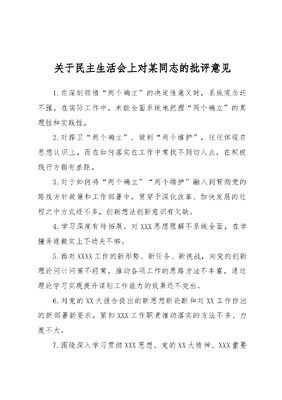 关于民主生活会上对某同志的批评意见1.在深刻领悟两个确立的决定性意义时,系统观念还不强,在实际工作中,未能全面系统地把握两个确立的真理性和实践性。2.对捍卫两个确立、做到两个维护,往往体现在思想认识上,而在如何落实在工作中常找不到切入点,在积极践行方面有差距。3.对于如何将两个确立两个维护融入到贯彻党的路线方针政策和工作部署中,贯穿于深化改革、加快发展的过程之中方式还不多,创新想法创新意识有欠缺。4.学习深度有待拓展,对XXX思想理解不系统全面,在学懂弄通做实上下功夫不够。5.面对XXXX工作的新形势、新任务、新挑战,向党的创新理论问计问策不经常,推动各项工作的思路方法不丰富,通过理论学习实现提升谋划工作能力的效果还不突出。6.对党的XX大报告提出的新思想新论断和对XX工作作出的新部署新要求,紧扣XXX工作职责推动落实的方法不多、力度不大。7.围绕深入学习贯彻XXX思想、党的XX大精神、XXX重要讲话和重要指示批示精神等情况,开展监督检查频次不多、力度不强。8.政治监督方式方法单一,缺乏主动性创新性,有时只局限于完成省纪委统一部署的规定动作,在深化政治监督具体化、精准化、常态化上存在差距。9.对党委三重一大事项的议事决策、执行落实情况监督不到位,同级监督的作用和成效不明显。对各权属单位党组织的第一议题三重一大决策事项的监督抓得不严实。10.驻点式监督、下沉式调研还没充分运用起来,采取四不两直的方式深入基层开展调查研究较少,未能全面、及时地掌握权属单位政治生态情况和党员干部的思想工作状况。11.统筹推进XXXX工作高质量发展的步调不紧密,对如何围绕中心服务大局开展监督思考不深,监督保障执行、促进完善发展的作用发挥得不充分。12.监督执纪第一种形态运用还不充分,对党员干部身上的一些苗头性、倾向性的问题重视程度不够,抓早抓小、防微杜渐的效果还不明显。13.主动发现问题的能力还有欠缺,一抓到底的韧劲有所不足。面对个别部门单位和党员职工工作推诿扯皮、不担当不作为等作风不严不实的问题有时不能严肃批评纠正。14.监督全面从严治党主体责任落实,往往以参加会议、民意测评、个别谈话或是听汇报、看材料、提要求为主,工作方法比较单一、措施不多。15.贯通党委主体责任、党委书记第一责任、班子成员一岗双责、纪检监察监督责任的四责协同还不紧密,对党风廉政建设责任制落实情况的督导检查不到位。16.党风廉政教育协同联动不足,开展警示教育针对性不强,震慑作用发挥不够,有时存在一刀切大水漫灌一个方子抓药的现象。