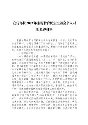 宣传部长2023年主题教育民主生活会个人对照检查材料根据主题教育专题民主生活会有关要求,会前,我认真参加学习研讨,与同志们进行了谈心谈话,广泛征求了意见建议,在此基础上紧密联系工作生活实际,围绕六个方面深入检视反思。现将个人对照检查情况报告如下:一、检视的问题(一)理论学习方面。一是理论学习的系统性不够。有时还存在不能很好地处理工与学的问题,学习的全面性、系统性有待加强,存在零敲碎打急学急用的现象,对XXX新时代中国特色社会主义思想学习感悟还不够全面,对其中蕴含的思想内涵理解不够深入,用以谋划指导宣传思想文化工作不够到位。二是实践运用的有效性不够。围绕增强四个意识、坚定四个自信、做到两个维护武装头脑、指导实践、推动工作还不到位,用党的XX大精神指导实践还需要进一步深化,满足于学原文、读原著,原原本本学、逐章逐节学,但结合工作实际深学细悟、学懂弄通、融会贯通不够,用党的最新创新理论推动宣传工作还需加力。(二)政治素质方面。一是践行两个确立还有差距。能深刻领悟两个确立的决定性意义,自觉做到两个维护,从政治高度坚决贯彻落实党中央、国务院和省市委重大决策部署,但立足新发展阶段,工作创新意识有所减退,研究部署宣传思想、精神文明、文物保护、意识形态等工作时习惯于用老经验、老办法应对新形势、解决新问题。二是心怀国之大者还存不足。对国之大者的理解和把握不够,没有做到心中有数、时刻对标对表、始终紧跟看齐,在关注党中央在关心什么、强调什么,深刻领会什么是党和国家最重要的利益、什么是最需要坚定维护的立场,在思想上政治上行动上全方位向XXXXXX看齐、向党中央看齐,表里如一、知行合一上还需再下功夫,在制度建设、阵地管理、品牌打造、载体创新等方面仍有提升空间,在更好地内聚力量、外树形象上还有很多工作要做,未找准找实把国之大者的政治要求体现在严管理、优教育、提质量、抓落实的各个环节。(三)能力本领方面。一是用系统观念推进工作需持续加强。系统观念是具有基础性的思想和工作方法,XXXXXX就坚持系统观念作出一系列重要论述和指示要求,自己也注重用系统念思考工作、推进工作,但仔细想来,面对理论学习、宣传思想、文明建设、队伍管理等工作艰巨任务,还是没有做到十个手指弹钢琴,工作中存在顾此失彼、畸轻畸重的问题。比如,在统筹当前和长远方面,如何适度超前谋划宣传思想工作,投入的精力还不多,推动的力度还不够大。二是用实践锤炼提升本领需常抓不懈。在找准工作的切入点和突破口,全面提升宣传工作的质量和水平上还需加强,教育引导党员干部提高能力本领的招法还不够丰富,面对新时期宣传工作的新形势新任务,一些宣传系统干部存在着老办法不管用、新办法不会用、硬办法不敢用的问题,不同程度存在本领恐慌能力危机。(四)担当作为方面。一是引领推动基层宣传工作力度不够。在聚合力量、创新思路,着力解决好力量分散、整合不够、各自为战的问题,提高正面宣传的供给能力和舆论引导能力,推动基层宣传工作提质增效上,还需采取有力举措,目前看,宣传教育的方式方法、载体平台还不够鲜活和接地气,吸引力、渗透力、感染力不强。二是推动落实意识形态责任制不够。个别党委(党组)工作不到位,报告意识形态工作不及时、不规范,比如,有的领导干部履行一岗双责主动性不强、工作不到位,重业务轻意识形态工作问题较为突出;用新思维、新举措推进意识形态工作不够,随着网络和自媒体的普及,意识形态工作受到巨大冲击,尤为需要方式方法的创新,但有的部门和单位缺乏新思路、新举措,仍在沿用老思维、老办法。(五)工作作风方面。一是狠抓落实的力度和方法还有欠缺。在谋划宣传工作中,一直力求把工作抓实、抓紧、抓出成效,但狠抓落实、监督问效还不够深入到位,推动工作的力度也需进一步加大。比如,今年以来,省委宣传部、市委宣传部都对全年的宣传工作进行了详细的安排部署,提出了主要任务、工作抓手、具体要求和完成时限,但目前看,有的工作进展还不理想,工作效果还不明显。二是压力传导的强度和狠劲不够到位。面对宣传宣讲、中心组学习、精神文明建设、新时代文明实践等实际工作任务,还存在上紧下松、压力传导不到位的情况,存在工作落实上面热、下面冷,落实力度逐渐递减的现象,特别是一些干部还有玩数字游戏的冲动。(六)廉洁自律方面。一是主动接受监督还需加强。接受监督的自觉性还有待加强,对没有监督的权力必然导致腐败的道理是认同的,但有时片面地认为自我约束重于外部监督,接受外部监督、社会监督可有可无,自觉接受监督的习惯没有养成。二是监督管理干部还需加严。能够牢记手中的权力是党和人民赋予的,并坚持严以用权、依法用权、秉公用权,但严格对照,对基层党组织、宣传干部的日常管理监督还不深不细,对八小时以外行为情况还缺乏全面了解,在严明纪律
