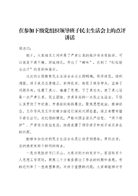 在参加下级党组织领导班子民主生活会上的点评讲话同志们:刚才,大家相互之间开展了严肃认真的批评与自我批评,可以说是不遮不掩、坦诚相见,开出了辣味,达到了红红脸出出汗的目的和要求。这次的主题教育民主生活会会议主题明确,程序规范,组织周密,班子成员态度端正,材料扎实,体现了领导带头,坚持了问题导向,吐露了真心、碰撞了思想,下了真功夫,说了真心话是一次严肃认真、民主团结、求真务实的一次民主生活会。不但认真贯彻了市纪委、市委组织部的要求,聚焦思想政治、精神状态、工作作风及工作实绩方面进行深刻对照检查,而且有理有据不存在应付,走过场的情况,严格对照全面从严治党、两个维护、严肃党内政治生活,细致查摆了领导班子和班子成员存在的问题。能够参加此次的民主生活会也是让我受到感染,得到启发,总的感觉有四个鲜明的特点。一是自我批评开门见山。大家在刚才的发言中,紧密联系个人思想工作实际,聚焦三个方面查摆出了存在的问题和表现,有的还列举了一些典型事例。对班子查摆的问题,大家都能够对号入座、主动认领。应当说,每个班子成员都坚持把自己摆进去,自我批评做到了讲问题实事求是,开门见山,不回避矛盾,触及思想深处,触及问题实质。自我批评的态度是诚恳诚实的,认真揭短、大胆亮丑的勇气是可嘉的,达到了自我检查、自我教育、自我提高的目的。二是问题查摆很全面。班子成员在查摆问题表现后,能够严查危害、深剖根源,紧密结合各自思想和工作实际,从思想、作风、实绩等方面剖析产生问题的思想根源。有的分析原因时,还结合个人的成长经历、工作中的表现和典型事例,从不同的角度进行了深刻剖析,挖掘了自己灵魂深处的病根所在。三是相互批评有辣味。在相互批评的过程中,能够看出大家本着出自公心、对同志负责的态度,坦诚相见,大家推心置腹、开诚布公、有缺点谈缺点,有意见讲意见,有什么问题就提什么问题,当面锣、对面鼓,民主生活会有交流、有交锋,有共识、有共勉,达到了团结-批评-团结的目的。四是整改措施可操作。每位同志都谈了整改方向,前期取得了一定的成效,通过今天的民主生活会,会班子和班子成员又针对存在的突出问题,结合各方面的意见建议,从思想认识、工作作风、廉洁自律等各个方面,制定出了比较具体的整改措施、体现了即知即改的态度和真抓真改的决心。这次专题民主生活会是新形势下严肃党内政治生活的新开始不管征求意见,还是对照检查,主要还是要抓好整改,只有整改到位了,我们这次民主生活会的效果才能体现出来,才能算是一次高质量的党内政治生活。在这里我谈几点个人的建议:一是要持续加强学习。民主生活会虽然开完了,但我们还要坚持把学习放在首位,特别是要深化主题教育活动成果,学好XXX新时代中国特色社会主义思想和党的XX大精神,要防止懈怠思想,班子成员要带头深入基层、深入实际,到一线照镜子、找差距,及时发现和解决问题。进一步坚定理想信念,不断提高政治判断力、政治领悟力和政治执行力,以实际行动坚定捍卫两个确立、坚决做到两个维护。发挥关键少数示范引领作用,切实解决好党员干部世界观、人生观、价值观总开关问题。坚持在各项工作中把党总揽全局、协调各方落到实处,凝聚起改革发展的强大合力。二是要加大整改力度。各位同志要在前期边整边改的基础上对这次民主生活会中提出的问题,要拿出切实可行的整改方案,细化具体的整改落实时间表,建立台账,规定完成整改的时间节点。切实把整改作为常态,会后把相关的整改情况及时上报,特别是要围绕此次民主生活会的主题,做好6个方面问题的整改,做到真改、实改、彻底改,真正改出成效。三是要巩固整改成果。建章立制是巩固整改成果的关键。要把制度建设作为解决查摆出来的问题的治本之策,本着务实管用的原则,认真梳理现有制度,完善制度体系,运用常态、长效的方法堵塞漏洞,治理源头,切实解决好制度缺位的问题。要加强调查研究,广泛征求意见,在制度出台前进行广泛、科学和充分的论证,保证每项制度规范、理性、管用、有效,实现党的建设制度化、规范化和常态化。我就讲这些,谢谢大家。