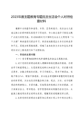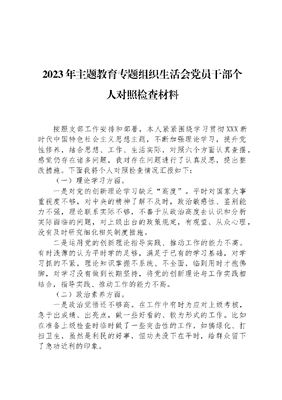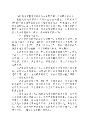 2023年专题教育组织生活会党员干部个人对照检查材料根据支部关于召开本次组织生活会的要求,在认真学习XXX新时代中国特色社会主义思想的基础上,联系思想、工作和生活实际,深入查找自身存在的不足和问题,并对存在的问题进行深刻剖析思想根源,提出并落实整改措施,也希望同志们对我多开展批评、帮助。现将情况汇报如下:(一)理论学习方面。一是对党的创新理论缺乏钻研精神。虽然能够主动学习党的XX大报告、新党章、XXX新时代中国特色社会主义思想,牢固树立四个意识,坚定四个自信,做的两个维护,但是思想上还不够重视,学习不够深入细致,缺乏钻劲。二是学习主动性不足。学习主义依靠支部集体学习,缺乏主动性、自主性和学习热情,在系统学习、联系实际上下功夫还不够。对上级个别规定及重大决策理解不深不透,贯彻执行不全面、不深入,只求过得去,不愿下苦工,通过学习来指导实践不够。三是理论联系实际不够。在实际工作中停留在凭经验办事多,紧密结合工作实际、运用XXX新时代中国特色社会主义思想的立场、观点、方法研究新情况、解决新问题的能力不强。(二)政治素养方面。一是政治敏锐性不够。有时对一些错误言论、负面议论的政治敏感性还不够强,虽然只是听过一笑了之,没有听信或发表不负责的言论,但也没有以一个党员干部的身份主动亮剑或弘扬正能量。二是政治站位不高。能够鉴定贯彻党的基本路线,在大是大非面前也能站稳政治立场,但用更高标准来衡量,政治站位仍需进一步提高,政治意识有待进一步增强。比如,总认为自己只是一个普普通通的党员干部,且身处基层一线,讲政治太远、太空,简单地认为只要把自己的本职工作做好就行,只顾埋头拉车、不懂抬头看路的问题突出。(三)能力本领方面。一是开拓创新精神不够。客观上存在对工作情况不够了然于心,有时容易满足于完成基本动作、不出问题,较多的关注一些程序性、规范性的东西,没有很好地因地制宜、灵活多样性的开展工作。二是缺乏斗争精神。在思想上对社会上、网络上出现的谣言和错误言论不抵制、不斗争,认为自己身边没有两面派、两面人缺乏与之斗争的意识,存在老好人思想,批评与自我批评深度不够。(四)担当作为方面。一是责任意识不高。有时放松了对自己的要求,放松了对分管部门的要求,在工作中有时只求过得去、不求过得硬,只求把工作做好,不求严防死守,认为工作差不多就行,责任意识不够强。二是履职尽责不够到位。工作中习惯于听从上面的部署,机械式执行,总认为单位重大事项都有领导把关,上级安排什么就干什么,不主动出击,导致有一些决策部署落实效果不好。(五)工作作风方面。一是宗旨意识树得不牢。以人民为中心的思想树立得还不够牢固,为人民服务的宗旨意识较以前相比有所淡化,坚持从群众中来,、到群众中去的工作方法执行得还不够好,对做好新形势下的群众工作存在老办法不管用、新办法不会用的本领恐慌和能力危机。二是深入基层不够。在工作中过于强调速度和效率,习惯两步并作一步走,出台一些办法征求群众的意见和建议不够,未能很好地做到问政于民、问需于民、问计于民、问效于民。三是自我要求不严。在工作中的重大问题、临机处置突发情况、个人有关事项上,能够按程序请示报告,但对一些日常工作或自认为不是很重要的工作没有严格落实请示报告制度,自我要求不严。(六)廉洁自律方面一是纪律要求有所放松。虽然能在大是大非面前保持立场坚定、态度坚决,但在一些细枝末节上,纪律约束不够严格,没有充分理解纪律是规范党员干部行为修养的根本准则,只把工作标准放在不碰红线上,没有做到高标准、严要求。二是艰苦奋斗精神有所松懈。随着生活水平的提高,勤俭节约、艰苦奋斗的精神有很大的弱化,思想上存在干累了,歇口气的想法。有时碍于情面会参加一些礼节性应酬,在杜绝吃请上不够坚决,艰苦奋斗精神有所松懈。二、问题根源。一是理想信念扎根不够。出现上述问题的根本原因,还是理论学习不系统、不彻底,进而导致理想信念的底子没有打牢,没有学深悟透XXX新时代中国特色社会主义思想,没有认真解决好政绩观、权力观、人生观和价值观的总开关问题,久而久之,在自我反思、自我除垢上做得不够彻底,不自觉地降低了标准、放松了要求。二是党性修养锻炼不够。在长期坚持党性锻炼上下的功夫不够,随着长期参加党的集中教育,形成了一定的依赖心理,对自我学习、自我反思、自我锤炼、自我提高时紧时松,没有做到时刻警醒、时时反思。三是宗旨观念有所淡化。对党的群众路线认识不深,深入群众调研不够深入,只注重自己想要了解的问题,没有真正在思想上、行动上树立起全心全意为人民服务的公仆意识,未能做到从群众中来,到群众中去。在工作上群众观念淡薄,指导工作主观意志成份多,站在群众立场想的少、做得少,对群众关心不够,服务群众缺少真功夫。三、整改措施一是加强理论学习,提高政治素质。加强政治理论学习,是提高个人觉悟,完善个人思想境