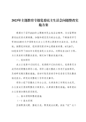 2023年主题教育专题党委民主生活会问题整改实施方案根据关于召开2023年主题教育民主生活会精神,为全面贯彻落实XX党委决策部署,加强和规范党内政治生活,不断推进学习贯彻XXX新时代中国特色社会主义思想主题教育走深走实、取得成效,按照组织制度、组织原则要求和主题教育部署,8月20日,XX党委召开了2023年专题党委民主生活会,对照检查出6个方面。为认真抓好问题整改落实,制定如下整改实施方案。一、组织领导成立以党委书记XX同志、党委副书记XX为组长,党委委员为成员的问题整改领导小组。领导小组对整改工作进行直接领导,及时研究制定整改措施,适时听取党委班子和党委委员同志整改情况报告,研究决定整改工作等有关事项。领导小组下设整改工作办公室,负责具体工作同志为成员。办公室成员要按照整改方案要求,认真落实整改措施,每季度向办公室报告整改落实情况。二、基本原则和整改措施(一)基本原则坚持聚焦问题、整改见底。聚焦突出问题,抓住改这个关键,对照问题、精准发力、持续用力,切实做到责任不落实坚决不放过,问题不解决坚决不放过,整改不到位坚决不放过。坚持标本兼治、综合施策。既要确保问题全面整改,又要深刻反思问题产生的根源,着力解决体制机制层面的问题;既要切实解决好工作中存在的突出问题,又要注重解决好在工作作风方面存在的问题。坚持立足当前、着眼长远。既要强力开展突出问题的专项整治,精准发力,确保取得实效,又要坚持抓常、抓细、抓长锲而不舍地抓好落实整改。坚持以上率下、共同发力。党员领导干部以身作则、率先垂范,带头落实责任,带头强化指导,带头严格监督,带头整改落实,推动各项整改落实取得实实在在的成效。(二)整改目标通过整改落实,增强党委班子和班子成员理论学习的思想自觉和行动自觉,提高运用新理论新战略新思维指导实践、推动工作的能力;坚定理想信念,提高政治站位,自觉在思想上政治上行动上同以XXX同志为核心的党中央保持高度一致;增强宗旨意识自觉贯彻依靠基层、促发展方针,深入调查研究,着力解决关心的热点难点问题;增强干事创业的精气神,以钉钉子的精神抓工作落实,努力创造经得起实践、民警、历史检验的实绩;坚持廉洁从业,坚决预防和反对腐败,营造风清气正的政治生态。三、整改时限从即日起至下次民主生活会召开前。四、针对存在问题制定的整改措施(一)理论学习方面。〔整改问题〕:一是学习不系统;二是认识有偏差;三是结合实际少。〔整改措施〕:坚持理论武装。坚持用XXX新时代中国特色社会主义思想武装头脑、指导实践、推动工作,带头真学、真信、真懂、真用,树牢四个意识,增强四个自信,坚决做到两个维护,更加自觉地在思想上政治上行动上与党中央保持高度一致。进一步提高政治站位,自觉向党的理论和路线方针政策看齐,向党中央决策部署看齐,做到党中央提倡的坚决响应、党中央决定的坚决执行、党中央禁止的坚决不做,确保中央政令畅通。抓好理论学习。按照2020年党委中心组学习计划安排,认真抓好党章党规、XXX新时代中国特色社会主义思想、主题教育工作会议精神等专题学习,落实集中学习研讨、重点发言人制度,充分发挥学习强国学习平台功能作用,不断提高政治站位,增强四个意识,坚定四个自信,践行两个维护。(二)政治素质方面。〔整改问题〕:一是工作制度不完善,懒化松散;二是争先意识不强烈,干劲减弱;三是大局意识不牢固,观念松懈。〔整改措施〕:严肃组织纪律。坚持民主集中制原则,坚决反对在贯彻落实党中央决策部署时议而不决、决而不行、行而不实。加强纪律建设,坚决纠正执行纪律宽松软的问题,以纪律为利器坚决杜绝执行党中央决策部署时等待观望、敷衍塞责、阳奉阴违、推诿扯皮等恶习。加强奖惩制度建设,形成能者上、庸者下、劣者汰的导向,鼓励党员干部敢于担当,用踏石留印、抓铁有痕的劲头提高执行的能力和效率。严肃党内政治生活。严格执行《新形势下党内政治生活若干准则》,进一步建立健全各级党组织,严格落实入党宣誓、党内互称同志、亲手缴纳党费等基本动作,严格落实双重组织生活、书记带头讲党课等制度,加强对各级党内政治生活情况的监督检查,坚决防止质量不高、流于形式等问题。加强思想政治工作。深入推进第二批主题教育,推进党史学习教育常态化制度化,引导各级党组织和全体党员悟初心、守初心、践初心,更加自觉地为实现新时代党的历史使命不懈奋斗。广泛开展全员大谈心活动,落实逐级负责的思想工作机制,跟进做好一人一事思想工作。(三)能力本领方面。〔整改问题〕:一是在工作方式方法简单直接,创新性不足存在思路封闭、方式粗暴、站位不高的情况;二是结合实际思考研究不多,工作上还有前松后紧、细致不够等现象;三是推动工作的力度不足,有些工作停留在会议、文件层面,针对性和操作性不强,督促落实不严,缺乏钉钉子精神和一抓到底的劲头。〔整改措施〕:加强队伍建设