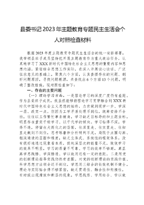 县委书记2023年主题教育专题民主生活会个人对照检查材料根据2023年度主题教育专题民生生活会的统一安排部署,我带领县班子成员坚持把开展主题教育作为重大政治任务,认真地学习了XXX新时代中国特色社会主义思想的重要内容和思想内涵。紧密结合思想工作实际,在深入开展谈心谈话、广泛征求意见的基础上,聚焦六个方面,认真查摆存在的问题、剖析问题原因,寻找问题根源,共查找出6个方面13个问题,明确了整改措施。现对照检查如下:一、存在的主要问题(一)理论学习方面。一是理论学习的深度广度仍有差距。作为县委班子成员,我虽然能够将理论学习贯穿融合到XXX新时代中国特色社会主义思想的始终,力求做到现学一步、学深一层、改实一点。但因为工学矛盾处理不到位,统筹安排不合拍,往往以工作繁忙事务缠身,学习缺乏目标导向和主题坐标,明显存在重实干轻学习、以干代学的倾向。学习钻得不深,学得不透,停留在大而化之的层面,往深里走、往实里走、往细里走做到不到位,思考琢磨和分析研判不足,局限于点圈勾画、粗浅通读的层面和维度,缺乏立体式、系统性的框架体系,没有很好地透过现象看本质,提纯深层次的能量不足,致使学习的效果不明显,学习的质量不可靠、学习的效率不够高,真正离学思践悟、学深悟透、学以致用还有一定的差距。二是用党的创新理论指导实践仍然有差距。对党的创新理论的实践价值、科学思想方法领会还不到位,学思用三结合的长效机制不健全,理论与实际贴合得不够紧密,缺乏贯通性、融合性和衔接性,有时候出现滑坡和断层的现象,学思践悟、学用结合、学以致用的功力发挥得不够好。运用科学理论指导实践工作存在一定的短板和盲区,形式主义和经验主义的行为在一定程度上逐渐抬头。比如:县委班子聚焦全县发展的优势和瓶颈,着力在亮牌考核、争先创优上抓落实,但理论学习的贯通融合不够,缺乏全盘统筹和总体布局,思考谋划推动工作力度不大、幅度不宽、强度不够,缺乏宏观全局的战略定位和责任担当,致使全县工作的发展的动力和后劲明显不足,潜力和优势没有充分发挥出来,无缝对接、融合贯通、转化运用、破圈突围的能力有待于进一步加强。(二)政治素质方面。一是政治上的成熟度不够。对县的发展政治站位不高、政治视野不宽、政治眼光狭窄,对全县发展的潜力和优势,统筹规划和分析研判不足,站在政治的全局和高度,观察大局、深谋大事、把牢方向的意识较为淡薄,面对多元思潮、多样环境、多重考验的叠加影响,对县发展中存在的问题和矛盾,理解不够透彻、分析不够全面、定向不够精准,有时存在雾里看花水中捞月的现象,需要始终保持居安思危的警醒意识和忧患意识,不断提高政治的领悟力、政治的判断力和政治的执行力。二是视野上的开阔度不够。虽然能够站在县发展的全局高度思考和谋划问题,但在吃透上级精神、把握重心节奏、扩宽工作思路方面,缺乏全面思考的深度、宏观全局的高度、大刀阔斧的力度。比如:紧扣县发展的大局,审时度势不够,往往受闭门造车、坐井观天狭隘思维的影响,工作的新方法和新路径探索不强,运用不够。紧盯重点工作持续加压奋进的动力和拼劲不足,发挥政策集成效应,加快重大项目建设、持续增长市场活力方面,缺乏全盘统筹的格局、整体摆布的效度、捕捉机遇的能力。创新思路、抢抓机遇、挖掘潜力、破解瓶颈的能力有待于进一步强化。三是政治的敏锐度不够。政治上的历练和打磨缺乏火候,对意识形态领域斗争得严峻性、复杂性、隐蔽性认识浅薄,缺乏必要的警惕性和鉴别力,管控意识形态领域的能力和水平存在短板和盲区,习惯于就事论事、经验办事的套路,从政治的角度观察和分析问题,明显不足。以党员领导干部的身份,旗帜鲜明抵制负面言论、负面影响的力度和强度不够。(三)能力本领方面。一是工作的统筹能力不强。虽然能够紧盯全县发展的主要经济指标和重点工作任务,持续加压奋进、一以贯之抓好落实,但全盘统筹和重点拿捏得功力不够,对分管的各项工作,没有做到均衡用力,遇到急难险重的重要任务时,有时候会降低标准,驾轻就熟的能力明显不足。比如:对自己分管领域的重点工作,对关键时期的考核重点,关注的时间和精力多一点,其他工作抓的松一点,存在疲于应付的状态,满足于不出错、过得去,在精益求精、求精出彩方面下的功夫不够,跟踪问效和持久落实的韧劲不足。二是工作的履职能力不强。围绕县高质量发展,我带领班子成员凝心聚力、乘势而上,积极探索发展的新路径、摸索发展的新思路、采取发展的新举措,取得了一定的新成效,但与全县人民的新期待还有一定的差距,聚焦群众的急难愁盼,缺乏足够的底气和信心,工作上实打实、硬碰硬的力度不够,强化履职能力,提升工作效率的冲劲和拼劲不足,破解瓶颈、破圈突围的能力有待于进一步加强。(四)担当作为方面。一是敢于斗争的精神不强。聚焦全县发展的瓶颈,主动担当不够,缺乏积极进取、奋发有为的精气神。特别是面对一些关乎群众的痛点、难点和堵点问题