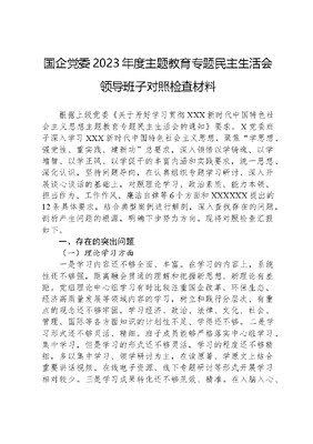 国企党委2023年度主题教育专题民主生活会领导班子对照检查材料根据上级党委《关于开好学习贯彻XXX新时代中国特色社会主义思想主题教育专题民主生活会的通知》要求,X党委班子深入学习XXX新时代中国特色社会主义思想,聚焦学思想、强党性、重实践、建新功总要求,深入领悟以学铸魂、以学增智、以学正风、以学促干的丰富内涵和实践要求,统一思想、深化认识,坚持问题导向,在认真组织专题学习研讨、深入开展谈心谈话的基础上,对照理论学习、政治素质、能力本领、担当作为、工作作风、廉洁自律等6个方面和XXXXXX提出的12条具体要求,结合典型案例进行解剖,深入查找存在的问题,剖析产生问题的根源,明确下步努力方向。现将对照检查汇报如下。一、存在的突出问题(一)理论学习方面一是学习内容还不够全面、丰富。在学习的内容上,系统性还不够强,距离融会贯通的理解和把握新思想、新理论有差距。党组理论中心组学习有时比较注重国企改革、环保生态、经济高质量发展等领域内容的学习,树立和践行分层次、有重点的观念还不够牢固,学习经济、政治、法律、文化、社会、管理、国际等各方面知识的计划性不足、学得还不够。二是学习形式还不够灵活、精细。班子成员能够严格落实中心组学习、集中学习,但是学习的形式还不够灵活,学习的程度还不够精细,多以集中学习、领学研讨为主,在读原著、学原文上结合重要讲话视频、在线电子资源、线下专题研讨等形式开展学习相对较少。三是学习成果转化还不够见效、精准。在入脑入心、成果转化、指导实践方面还有一定的差距,理论学习与实际工作对接还不够紧密,融入具体业务缺乏新角度、新办法,有时存在理论学习时用心学、工作时间老办法干的现象。运用党的创新理论解决公司X等现实问题的能力还需要进一步加强。(二)政治素质方面一是深入践行两个维护要求上有差距。将两个维护重要要求贯穿于班子政治建设、国企深化改革、科技创新发展、职工保障改善、公司转型发展的过程之中,还存在思路不够广、措施不够多、结合不够紧等问题,有时存在上热下冷、上紧下松、上实下虚的现象。面对新定位新使命新形势,如何主动识变、主动应变,更好推动公司改革发展上创新举措不够多,对如何服务上级战略发展大局、贯彻新发展理念,充分发挥自身品牌积累和科研技术优势,发挥科技支撑作用,以现有技术优势聚焦主业开拓市场等缺乏研究,发挥小切口实现大效应优势未能充分体现。二是谋划基层党建工作成效不够突出。在谋划部署党建工作过程中,前瞻性需要继续加强,虽然也召开了多次会议研究部署党建工作,但不够深入系统,把党的新理论、新举措运用到工作中来效果不明显,对于如何丰富党建工作的载体、创新党建工作的举措还有待深度思考,不仅要完成常规动作的开展,更要结合工作实际及时推陈出新,以党建为引领,上下一心,抓好主业,引导广大党员创先争优、攻坚克难,深化党员责任区、党员示范岗、党员突击队等活动,营造创先争优、比学赶超、勇争一流的浓厚氛围。(三)能力本领方面一是推动高质量发展的能力还要增强。在完整、准确、全面理解新发展理念,综合运用创新、协调、绿色、开放、共享的思想理论破解发展难题、增强发展动力、厚植发展优势,推动公司高质量发展还有差距。当前公司聚焦十四五发展目标,正通过技术创新实现X差异化竞争,结合资源整合贯通产业链,不断全面推进公司在X领域的快速成长,以技术创新谋划未来,做好业务转型,在如何保证各项工作齐头并进、相互促进方面,党委统筹谋划、前瞻思考还要进一步加强。二是推动问题解决的能力还要提升。党委班子成员联系党支部开展项目调研,以青年人座谈会、业务骨干调研谈话、人才调研座谈、实地走访等方式深入基层找问题、听诉求、想对策。在调查研究中发现的X等重点问题和工作需求方面需要进一步下功夫、出对策、解难题,推动问题的落实解决,为公司的高质量发展打好地基。三是防范化解风险挑战的能力还要强化。公司党委在强化防范系统性风险双监管体系建设,开展合规风控内控三合一体系建设方面取得了阶段性的胜利,实现了X。但精细化管理能力提升、人才队伍梯度建设、干部职工队伍建设、党风廉政建设等是持久战,要继续坚持、久久为功,为公司发展营造良好的政治生态和工作生态。(四)担当作为方面一是善于斗争能力不够强。敢于涉险滩、啃骨头的闯劲、拼劲、冲劲有所缺乏,没能把较真碰硬的精神体现到每个领域,每项工作当中。比如,在应收账款清缴工作中,公司党委下达了具体任务指标和提出明确要求,多次会议调度推进工作,但在增量遏制和存量消化上效果并不理想,有的党员领导干部多从时间长、难度大、推进难等客观上找原因,不从自身思想重视不够,表率作用不强等主观上找差距,实际上是斗争精神弱化的表现。二是改革创新意识不够劳。部分党员领导干部革故鼎新意识不够强,习惯于按传统思维、经验办事,对公司发展面临的新形势新任务,出现的新