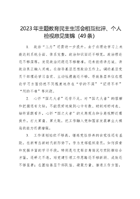 2023年主题教育民主生活会相互批评、个人检视意见集锦(49条)1.政治三力还需进一步提升。由于在理论学习上未能达到系统全面、体系完整,政治知识面还不够宽,政治理论还不够深厚,发现政治问题还不够精准,还未能将讲忠诚、讲政治真正融入灵魂。在指导基层思想政治工作上,调动基层党员干部理论学习自觉、主动性措施还不够,导致基层单位在理论学习方面仍然不同程度地存在学的不深记得不牢用的不准等问题。2.心怀国之大者还存不足。对国之大者的理解和把握还有欠缺,不能很好地做到心中有数、时刻对标对表、始终紧跟看齐,心怀国之大者的大局观念和全局视野还需提升,打大算盘、算大账,把工作融入党和国家发展事业大棋局的能力还需增强。3.工作谋划站位不够高。锤炼党性修养的自觉性还有差距。在新常态新时代新形势下,作为支部组织委员,如何探索和发掘丰富的学习手段,特别是与支部自身情况与实际相结合方面,还研之不透,对党建引领工作思路还不够新颖、成效还不够显著;在团结基层干部队伍、凝聚力量、推进工作方面,认识启发不够深刻、舆论引导不够深入、宣传教育不够广泛、理论和武装水平还有待进一步提升;在善于向群众学习,把群众意见、经验集中起来,形成群众智慧,融入群众中还不够经常。4.民主集中制落实不够广泛。民主决策不够科学和广泛,有时党员干部全程参与征求意见建议各个环节的积极性不高,导致一些涉及干部切身利益的政策措施没有发挥应有的作用,反而造成班子关心关爱干部做样子的不良反响。比如,在研究工作室,只关心自己分管工作,对于其他班子成员分管工作的问题,不主动、不充分,大多时候是无意见或者同意,没有认真思考提出切实可行的意见建议。5.学习知识钻研业务精神还不够。没有主动挤出时间来开展自学,系统地学习创先争优理论。未能够做到把课余的时间多用于提高投资管理能力方法方式的学习上。对新知识,新技术的学习不足,表现没有沉下心认真地学习理论知识,对东西一知半解。有时放松对自己的要求和标准,满足于能应付过得去、差不多。具体工作不够扎实,存在急于求成的情况,接到工作首先想到的是尽快完成,而不是做到做好。6.深入基层调查研究不够。调研安排时间比较紧,还存在不细致的问题。到基层调研期间,虽然能够召开座谈会广泛听取职工群众的意见,但是对基层反映的问题更多的是部署安排,具体落实中没有亲自研究、跟踪督办职工的合理诉求,影响了问题解决率和职工满意度。比如,今年的主题教育共到基层开展*次专项高质量发展调研,召开座谈会收集到**条意见建议,但部分问题也没有及时采取针对性措施加以解决,工作落实还不同程度存在上面热、下面冷现象。7.开拓创新意识不够强。思想解放力度不够大,应对百年之大变局准确识变、科学应变、主动求变的意识、能力和应对不够足,不同程度存在本领恐慌能力危机。在创新发展上,主动谋划新方法、新举措、新思路不够多,部分工作仍按部就班,效果不够突出、特色不够亮、招数不够多、力度不够大。8.工作能力有待加强。没有充分发挥主观能动性,思想观念因循守旧、工作墨守成规,不能跳出圈子看问题,面对新情况、新问题,不能以开拓的精神面对、分析和寻找解决问题的方法。工作中惯用老办法解决问题,怕出问题、不敢创新,在面对复杂问题时,思维不开阔,视野不开拓,不求有功、但求无过。9.干事创业的斗争精神不够。工作以来,始终能按照上级要求,切实抓好各项工作落实。但对一些涉及面广,一时又难以解决的问题,更多时候还是考虑稳字当头,斗争精神不足。对意识形态领域斗争的严峻性、紧迫性认识不足,对看不见的风险是最大的风险理念树得不牢固,风险防控仅仅停留在如何控制负面舆情、如何管控擅自发布敏感信息上,没有将对党员的教育紧密结合,带头研判、主动研判、盯办化解的积极性不高。10.对复杂领域的形式斗争存在畏难情绪。主动啃硬骨头、跳起来摸高的劲头有所松懈。有时仅仅满足于过得去、差不多,存在守摊子思想,没有把精益求精的工作习惯坚持下来,没能把认真较真精神贯穿到每项工作中,年年都是老样子。事业心不如从前开拓进取精神不足,缺乏迎难而上开创新局面的干劲和勇气,工作作风上有时紧时松,工作标准上有时不够严格。11.工作标准不高。接到工作任务时,走一步看一步,没有做到走一步想三步,没有很强的计划性和每项工作任务落实到位的负责精神。一般事务性工作也没做到一步三回头,做完后没有过细检查,时而出现这里没填对那里没填来的问题,特别是工作任务扎堆时,首先想到的是如何快速完成任务,而不是如何更好更快地完成任务,没有时刻以高标准严格要求自己。对有关政策法规研究得不深不透,12.面对克难攻坚的能力不足。对分管工作满足于现有成绩,缺乏创先争优、敢闯敢拼的勇气,一定程度上存在不想闯、不愿闯、不敢拼的思想。面对一些急事难事、烦事愁事,思想上还有畏难情绪,斗争