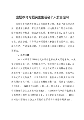主题教育专题民主生活会个人发言提纲依据市委主题教育领导小组的统筹安排,本着增强理论武装、提升党性修养、深化实践锻炼、创造新业绩的总体目标,结合确立信仰根基、锻造忠诚品质、推动事业发展、服务人民福祉、廉洁自律的具体目标,深化对理论学习对于凝聚人心、提升智慧、激励奋进、引导风正的深层含义和执行要求的认识。通过深入反思,严肃查摆问题,力求从根本上找准问题症结,进而全面解决。一、存在问题(一)对照学习XXX新时代中国特色社会主义思想方面。一是坚定信仰尚显不足。在实际工作中,简单功利主义倾向显露,误将共产主义理想视为遥不可及,认为马克思主义纯属抽象理论,未能坚守信仰至上的原则,巩固信念,聚集力量,实践中应用马克思主义的观点、方法亦显不足,致使在站位群众立场方面尚未做到坚定不移。二是对思想精髓理解不深。阅读了《党的XX大报告》、《XXX著作选读》(第一卷、第二卷)、《XXX新时代中国特色社会主义思想专题摘编》、《XXX新时代中国特色社会主义思想学习纲要(2023年版)》、《论党的自我革命》、《XXX新时代中国特色社会主义思想的世界观和方法论专题摘编》、《XXX关于调查研究论述摘编》、《中国共产党章程》、《中国共产党纪律处分条例》等重要著作,但在领会XXX新时代中国特色社会主义思想的科学架构、深刻内涵上仍需加强。三是学以致用未见充分。在运用新发展理念、构建新发展格局、推动高质量发展等理论指导实际工作上展现不足。(二)对照维护党中央权威和集中统一领导方面。一是政治敏锐性和鉴别力有待提升。尽管始终将党的政治建设置于核心位置,将维护党中央权威和集中统一领导奉为根本政治原则,但在坚决预防和整治七个有之现象方面的认识尚显不足,对于两面人、两面派进行斗争的勇气和能力还需加强。二是执行工作不够深入。执行党中央的决策部署以及XXXXXX的重要指示批示精神的机制不健全,未能定期对XXXXXX关于本行业、本系统工作的重要指示批示精神进行系统梳理,导致工作安排和推进不够有力,部分任务未能完成既定年度目标。(三)对照践行宗旨、服务人民方面。一是深化群众路线有待加强。在日常工作中,实施以民为本的发展理念未能充分到位对落实深入基层、倾听民声的要求执行不彻底,对民意的真诚吸纳、民愿的准确体现、民困的深度关怀未能做到尽善尽美。二是创新服务大众的方式亟需提升。运用法治手段深化改革、推动进步、解决冲突的情况尚不理想,在组织引导、预防管理、畅通反馈、问题处置、渠道多元、监督保障等方面还未执行到位。三是融合信息技术满足民众需求仍显不足。完善网络群众工作的体系尚处在起步阶段,将信息化、数字化、智能化手段广泛应用于信访工作中还显得力不从心。(四)对照求真务实、狠抓落实方面。一是平衡稳健与进取发展尚显欠缺。在能力与方法上尚存不足,对稳的关键点把控并未充分,稳定预期、保持经济增长、维护市场主体和保障就业方面有所欠缺;在转变发展方式、调整经济结构、提升质量效益以及积极培育新动能等方面还有进步空间。二是以流域治理支撑乡村振兴的措施仍待加强。在协调生态保护与经济发展方面尚未做到最优,推动生活生产方式的快速转变,实现生态宜居、产业兴旺、民生富裕的目标尚需进一步努力。(五)对照以身作则、廉洁自律方面。一是对于一岗双责的落实不够到位。责任压力没有完全传递到人,监管监督不足够严格,对于职责范围内出现的一些问题和异常现象没有及时发现和处理,对于利用第一种形态处理问题的方式应用不够广泛。二是在纠正四风和反对特权方面做得不够彻底。面对一些干部的纪律松懈和作风浮躁问题,有时候表现得过于宽容,未能坚定不移地执行反腐倡廉措施,未能深入推进自我革命的攻坚战和持久战。(六)对照履行全面从严治党政治责任方面。一是干部队伍建设尚需加强。在执行新时期党的组织路线和优秀干部标准方面还有欠缺,没有充分树立起明确的实干导向,干部选拔任用、容错纠错、干部能上能下的机制尚未健全,需要进一步完善以激发干部的积极性和创造性。二是加强党内政治生活的规范性。虽然已经认识到严肃党内政治生活的重要性,也在一定程度上实行三会一课、民主生活会、双重组织生活等制度,但在执行上仍有不足,有时候达不到应有的高标准,特别是在进行谈心谈话环节,出于对激发干部工作热情的考虑,有时候对问题的提出和讨论过于保守,导致不能深入地指出问题和缺陷。(七)上年度民主生活会问题整改落实情况。对于2022年度民主生活会对照检查出的问题,您所在单位能够制定具体措施,并严格按照这些措施执行整改,最终实现全部问题的整改到位,这体现了较强的问题导向和执行力。同时,针对群众反馈、巡视审计结果、组织交流和个人重大事项报告等方面能做到无问题,说明在意识形态工作责任、经济责任审计、自然资源资产离任审计等关键领域已经形成了较为完善的监督和管理机制,这
