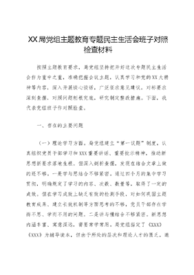 XX局党组主题教育专题民主生活会班子对照检查材料按照主题教育要求,局党组坚持把开好这次专题民主生活会作为重中之重,准确把握会议主题,认真学习和党的XX大精神等内容,深入开展谈心谈话,广泛征求意见建议,对标要求深刻查摆,对照问题刨根究底,研究制定整改措施。下面,我代表党组班子作对照检查。一、存在的主要问题(一)理论学习方面。局党组建立第一议题制度,认真组织党员干部学习和XXX重要讲话、重要批示精神,推动新思想新要求落地生根。但深入剖析查摆,发现在结合文章上做的还不够。一是学与思结合不够紧密。通过四个月的集中学习贯彻,明确规定了学习的内容、次数、数量等,取得了一定的成效。但在学习成效上缺乏有效的检测手段,对如何巩固主题教育成果、建立长效机制等方面思考的不够,党员干部存在学而不思、学而不用的问题。二是讲与懂结合不够紧密。新思想内涵丰富、寓意深远,需要常学常用。局党组指定了《XXX》《XXX》为辅导读本,但由于所处的层次和理论人才的匮乏,邀请高层次专家教授辅导讲解的次数少,讲解内容与业务工作结合不够,党员干部普遍存在理解领悟不到位的问题。尤其是关于业务工作等方面的内容,未能邀请到相关方面的专家教授,只能内部自行摸索,理解和掌握还有差距。三是知与行结合不够紧密。党的XX大报告指出,坚持人民至上、坚持自信自立、坚持守正创新、坚持问题导向、坚持系统观念、坚持胸怀天下这六个坚持是贯穿的世界观和方法论,如何将这六个坚持运用到业务工作实际中,局党组还没有研究提出具体的措施和办法,运用新思想推动业务工作的成效还不够明显。(二)政治素养方面。局党组坚持把践行两个维护作为最大政治任务,坚决贯彻落实党中央和上级党组的各项决策部署,提升班子政治素质,但与新时代新要求相比还有一定差距。一是政治站位不够高。习惯于站在本党组、本机关的角度来考虑问题、谋划工作,在自觉向党中央、向上级党组看齐上做的不够好,班子成员国之大者的意识还有待加强。*,XXX。二是政治领悟不够深。对党的XX大等最新理论武装精神学习停留在集体领读、理论测试、撰写体会等层面,没有对标业务工作深入开展分析研究,领悟的不够深不够透。*,虽然组织党员干部撰写主题教育心得体会XX篇,但认真查阅发现多数心得体会浮在表面,没有把本职工作结合起来,没有提出建设性的意见建议。三是政治执行不够严。对照党章和党的纪律规矩要求,在落实上存在失之于宽失之于软的问题,尤其是在一些小事上容易忽略,执行不够有力,抵制不够坚决。*,在党内组织生活中,个别党员习惯以职务称呼,违反了政治规矩,局党组只是私下进行了提醒,没有严肃进行批评教育。(三)能力本领方面。局党组坚持把提升班子整体能力作为主题教育的重要方面,通过理论学习、完善制度等措施,各项能力本领有了大的提升,但仍然存在一些短板。一是统筹全局能力有待加强。作为行业部门党组,对本部门在全局工作的定位和作用掌握不够精准,主要注重了本领域本行业本部门的工作任务落实,注重了重点工作的任务落实,对长期性、基层性工作有所弱化,统筹推进各项工作的能力有待提升,距离推动各项工作全面进步、全面过硬还有差距。*,对基层党建工作抓深抓实不够,党员干部思想上认为党建工作是虚事,落实工作任务动力不强,质量有待提升。二是科学决策能力有待加强。科学决策是对班子的基本要求,也是做好各项工作的首要前提。加强民主建设是提高班子决策能力的有效抓手,局党组研究制定出台了一系列规章制度,从程序上、方法上提高议事决策的科学性,但深刻剖析发现仍然存在局党组与行政班子议事决策界限不清、基层对规章制度掌握不够准确、落实上时有偏差、民主集中制落实不到位等问题。*,在研究部分议题时,个别班子成员发表意见不充分、随大流,没有真正起到建言献策、汇集众智的作用。三是攻坚克难能力有待加强。班子是否有较强战斗力,主要看在危机时候、艰巨任务面前能否勇挑重担、攻坚克难。当前全局各项工作任务千头万绪,工作任务量大面广,班子成员在落实重点任务、难点工作上不同程度存在畏难情绪,不敢下判断,不敢定调子,一味期望上级领导给够给予指导,存在宁愿不干也不愿出错的心理,贻误了工作时间和机遇。*,在机关基础建设上强调困难多,现在与兄弟局相关,基础建设差距较大。(四)担当作为方面。担当才能有为,有为才能有位。党的XX大强调敢于斗争、善于斗争是对党员干部的基本要求,只有每名干部都具有担当作为的精神,我们的事业才能够蒸蒸日上。但对照当前工作中表现出的实际情况,党员干部与担当作为的要求还有很大的差距。一是斗争意识树得不牢。针对当前社会存在的拜金主义、享乐主义、极端个人主义等错误思想,敢于斗争、善于斗争的勇气不足,习惯于当好好先生,机械死板执行各项规定任务,主观能动性不强。*,年轻党员干部知识水平高,头脑灵活,工作中想法新颖、很有见地,最大的问题