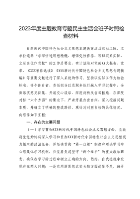 2023年度主题教育专题民主生活会班子对照检查材料自新时代中国特色社会主义思想主题教育活动启动之际,本单位遵循学深悟透思想精髓、增强党性修养、密切联系实际、立足岗位作贡献的工作总要求,有计划地对党的XX大报告、党章、《XXX著作选读》《XXX新时代中国特色社会主义思想专题摘编》等重要文献进行了深入系统的学习。坚持以实际工作为检验标准,将个体自省、责任担当以及职务执行融入学习过程中,全面落实意见征集、开展交心谈话、深度剖析反省等措施,在深度对标六个方面的要求下,严肃开展自查自纠,深入挖掘问题本质,并确立了明确的整改路径。现针对对照自检的具体情况,向您作如下汇报:一、存在的主要问题(一)学习贯彻XXX新时代中国特色社会主义思想方面。县政府党组始终将深入学习和贯彻XXX新时代中国特色社会主义思想视为根本的政治任务,并坚决贯彻第一议题制度和理论学习中心组集体学习机制,自觉肩负起坚守两个维护的重大政治职责,确保在学习的过程中树立正确的方向。然而,自我检视中发现存在两大问题:一是在用新思想武装头脑方面尚显不足。班子成员在学习上欠缺创新精神,往往仅限于执行规定性任务,对于学习内容的理解,满足于基础理论,将学习视为一项任务而非内化于心的过程;对于两个确立的时代意义、重要价值及其深远含义缺乏深刻洞察,从理论、历史、实践三个维度的理解存在片面性和局限性,使得在分享心得体会时未能触及问题核心明辨事理。二是在用新思想指导实践工作方面存在不小差距。班子成员对XXX新时代中国特色社会主义思想的深刻实践意义和科学思维方法的把握不够准确,导致在思考问题、决策、设定目标时缺乏深度,未能从党的创新理论中汲取立场、观点、方法,开展工作的理念与学习贯彻XXX新时代中国特色社会主义思想的要求有所距离,表现为有心无力、愿做而未能实现的能力困境和技能缺失。例如,有的同志在运用党的最新理论洞察和解决问题上能力不足,决策服务、产业发展等方面存在明显短板,尚未建立起有效的问题解决机制,构思不够长远、可行措施不甚充分。(二)维护党中央权威和集中统一领导方面。县政府党组始终将政治建设摆于核心位置,坚决维护同XXX同志为中心的党中央在政治立场、方向、原则、道路上的高度一致性。经检视分析,发现存在以下三个方面的问题:一是在贯彻上级决策方面仍有差距。部分班子成员在执行中央与省市区委策略时表现出观望态度对文件往往仅做传阅转发布置处理,缺乏深入研究和督促落实的行动,导致决策执行成效不佳,有擅自变通、减弱力度、绕开规定的现象。二是对意识形态工作重要性的认识尚显不足。班子成员虽严格分工执行意识形态责任制,但对网络意识形态领域的复杂性及应急网络舆情的处理能力认识不足,未能在创新实践中牢牢把握意识形态工作的主导权。三是主动化解矛盾的能力不强。班子成员虽落实领导包案制度,但在处理非法集资受害群众等棘手信访问题上力度不足,少数领导干部在信访问题处理中了解情况不够准确、应对措施不够细致,缺少坚决解决重大信访问题的决心。同时,这也反映出我们对金融市场监管松懈预警机制不完善,致使信访问题小事化大、大事化炸,触发群体性上访,产生了不良社会影响。(三)践行宗旨、服务人民方面。县政府党组始终将保障和改善民生作为工作的核心,把握住我为群众办实事活动的重要契机,全力以赴补齐民生短板、堵塞服务漏洞、增强发展弱项有效应对民生领域的热点和难点问题,显著提升了人民群众的获得感、幸福感和安全感。但自我检视显示,仍有三方面问题亟待改善:一是增强服务群众的自觉性。少数班子成员对人民即江山、江山即人民的深刻论断认识不足,在思考、决策、办理事务时,未能充分站在群众角度考虑,面对群众反映的问题,更多是被动应对而非主动作为,解决民众困难、纾解民众之忧的努力尚需加强。二是公共服务方面尚存欠缺。尽管近年来在民生领域的财政投入占比超过80%,但与我们立志成为模范区和省级副中心城市的目标相比,仍存差距。群众在教育、医疗、停车、出行等方面仍面临一定困难。尤其是去年省定的七项民生实事和区内承诺的十项惠民政策,初期进度缓慢,尽管后期加速推进,但截至年底也仅能勉为其难地完成。三是在为民办实事的实效性上还有空间。随着经验的积累和环境的变化,部分班子成员在思想深处对我们为了谁、依靠谁、自己是谁的认知出现了混淆,潜在的倾向在平衡上级责任与群众责任中出现偏差,导致对基层的联系和对群众的服务不够深入,解决民众困难、办好实事的能力需进一步加强。(四)求真务实、狠抓落实方面。始终坚持把抓落实作为一种政治自觉、政治要求,全面贯彻落实中央和省市县各项决策部署,圆满完成年度各项工作任务。但通过检视,还存在2个方面的问题:一是攻坚克难的勇气还需提高。个别班子成员面对高质量发展的时代重任,缺乏攻坚克难的志气、敢闯敢试的锐气、大胆负责
