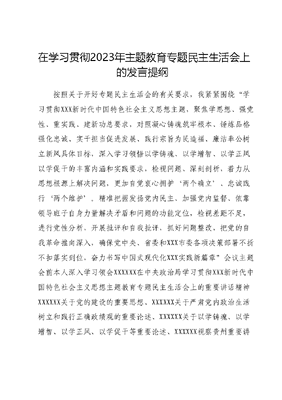 在学习贯彻2023年主题教育专题民主生活会上的发言提纲按照关于开好专题民主生活会的有关要求,我紧紧围绕学习贯彻XXX新时代中国特色社会主义思想主题,聚焦学思想、强党性、重实践、建新功总要求,对照凝心铸魂筑牢根本、锤炼品格强化忠诚、实干担当促进发展、践行宗旨为民造福、廉洁奉公树立新风具体目标,深入学习领悟以学铸魂、以学增智、以学正风以学促干的丰富内涵和实践要求,检视问题、深刻剖析,着力从思想根源上解决问题,更加自觉衷心拥护两个确立、忠诚践行两个维护。精准把握发扬党内民主、加强党内监督、依靠领导班子自身力量解决矛盾和问题的功能定位,检视差距不足,进行党性分析,开展批评和自我批评,抓好问题整改,把党的自我革命推向深入,确保党中央、省委和XXX市委各项决策部署不折不扣落实到位,奋力书写中国式现代化XXX实践新篇章会议主题会前本人深入学习领会XXXXXX在中央政治局学习贯彻XXX新时代中国特色社会主义思想主题教育专题民主生活会上的重要讲话精神XXXXXX关于党的建设的重要思想、XXXXXX关于严肃党内政治生活树立和践行正确政绩观的重要论述、XXXXXX关于以学铸魂、以学增智、以学正风、以学促干等重要论述、XXXXXX视察贵州重要讲话和对贵州工作重要指示批示精神,研学了《党章》《关于新形势下党内政治生活的若干准则》《中国共产党纪律处分条例》《县以上党和国家机关党员领导干部民主生活会若干规定》等内容,与班子成员、联系分管单位有关负责同志及所在支部党员代表开展了谈心谈话,结合会前征求反馈意见情况,联系个人思想和工作实际,对照学习贯彻XXX新时代中国特色社会主义思想,维护党中央权威和集中统一领导,践行宗旨、服务人民,求真务实狠抓落实,以身作则、廉洁自律,履行全面从严治党政治责任等6个方面,深入查找了自身存在的问题,深刻剖析思想根源,明确下步努力方向和整改措施。现将相关情况报告如下:一、2022年度民主生活会及有关个人整改落实情况在中共XXX市农业农村局党组2022年度民主生活会上,本人自身对照查找了X个方面XX个问题,逐条制定措施,进行了认真整改目前已全部整改到位。2023年,参加党组理论中心组学习研讨会X次,组织开展主题党日活动X次;召开专题会安排部署改进作风、狠抓落实工作X次;组织开展保密工作线下培训会X次;解决基层群众急难愁盼问题X个、所需生产生活所需物资XX万元二、存在的主要问题本人认真对照学习贯彻XXX新时代中国特色社会主义思想,维护党中央权威和集中统一领导,践行宗旨、服务人民,求真务实、狠抓落实,以身作则、廉洁自律,履行全面从严治党政治责任等六个方面内容,以及谈心谈话、征求反馈意见指出的问题重点从以下几个方面进行检视。(一)学习贯彻XXX新时代中国特色社会主义思想方面一是对加强党的创新理论武装的重要性、紧迫性认识不够完整准确。站位还不够高,未能充分认清错综复杂的矛盾和问题,全面深入开展理论学习的自觉性和主动性不足,用新时代党的创新理论观察新形势、研究新情况、解决新问题的历史自觉与历史主动有所欠缺。如,工作中存在过关思想,面对工作任务,只求过得去,不求干得好。二是把党的创新理论转化为思想武器和实践力量不够有效。将党的创新理论的学习过程,仅仅作为增强理论知识和理论素养的过程,未能将其作为训练思维方式、提升思维层次、增长工作本领的过程,灵活运用XXX新时代中国特色社会主义思想、发挥主观能动性的思维能力还有所欠缺。如,平时能够按要求参加支部集中学习,但在工作之余,没有坚持不间断地开展自学,没有完全学习领会内涵和精神,并及时转化为实践。(二)维护党中央权威和集中统一领导方面一是站在政治高度上看问题的意识还不够强烈。在谋划工作和处理问题上,国之大者的政治意识不足,有时未能完全从党的立场思考问题,没有将自己的责任意识提升到捍卫党的理想信念、维护党的团结统一、密切党群关系、巩固党的执政基础的政治高度,也没有把所分管的领域、所从事的全部工作,都放到党和国家工作大局中来谋划。如,对上级安排的丰收节、农展会等阶段性重大工作任务,总是希望局党组不要安排任务给我。因工作任务繁重,对上行文没有严格、仔细校稿,导致报XXX市政府请示出现错别字,被XXX市政府办通报批评。二是锤炼自身政治担当持续用力不足。在工作中,政治使命感还不够正、不够强,一些工作只想干得快、干出彩,未能从增强人民群众的获得感、幸福感的角度进行政治定位,特别是对干部群众急难愁盼问题关注度还不够高,对急难险重的工作存在畏难情绪,缺乏大无畏的政治品格,没有真正扛起与岗位相匹配的政治责任。如,对支部党建工作,只满足于按要求完成三会一课和机关党委安排的工作,不能主动思考,积极组织开展多种形式的组织活动。三是抓好意识形态工作的细致性还不够。面对错综复杂的意识形态斗争形势,就
