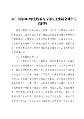部门领导2023年主题教育专题民主生活会对照检查材料根据主题教育领导小组统一部署,以及开好专题民主生活会的有关要求,我本人在认真学习XXXXXX系列重要讲话精神和相关内容的基础上,紧密结合自身思想和工作实际、会前谈心谈话、征求到的意见建议,深入开展自我检视,找准了问题,剖析了原因,明确了努力方向。现将对照检查情况报告如下,请领导和同志们审议批评。一、存在的问题和不足(一)理论学习方面。长期以来,我始终毫不动摇地坚持用理论武装加强党性锤炼,特别是主题教育以来,认真研读xxx等内容,做到了学有所思、学有所获,把学习成效转化为做好本职工作的内生动力。但是,还存在以下问题:一是虽然思想上高度重视学习,但是由于个人理论功底还不够扎实、学习方法不够科学学得不够系统、全面、深入,特别是在学习党内法规时,自认为每次都能第一时间学习新出台、新修订的党内法规,也能及时掌握一些新思想、新论断、新提法、新要求,但在原由、意义、内涵等方面,思考不深、理解不透,影响了学习效果。二是由于理论学习不够深、不够透,导致大局意识、创新意识不够强,没有站在XX建设的大背景下,谋划新时代XX的后勤发展方向。特别是在具体工作中,习惯于沿用老经验、老思路思考,在用新思维、新理念研究新情况、破解新问题方面虽然有一些尝试,但成效不够明显。(二)政治素养方面一直以来,我不断增强政治敏锐性和政治鉴别力,毫不动摇地坚持党对边检工作的绝对领导、全面领导在任何时候都树牢四个意识,坚定四个自信,做到两个维护。但是在传承红色基因、弘扬优良传统方面,还存在以下两个方面的问题:一是没有用好批评与自我批评这一有利武装对于班子成员的批评多半集中在民主生活会上,开展经常性的批评较少。有时即使开展批评,多半是以建议代替批评,婉转间接式批评较多,直指其过式批评较少,距离红红脸、出出汗的要求还有一定的差距,党内思想交锋还不够激烈、不够深入。二是对党员教育管理还不到位,监督提醒不够经常,要求也不够严格,特别是在XXX实有在位人数多于编制数的情况下,个别同志思想包袱较重,担心被分流,放松了对自己的要求,存在等待观望工作拖拉、精力不集中、出工不出力等问题。(三)能力本领方面。我能够时刻把对党忠诚、为党分忧、为单位谋发展、为XX谋幸福作为最根本的政治担当,始终不忘初心、牢记使命,勇于担当、忠诚履职,认真贯彻落实上级各项决策部署要求。但是仍存在以下问题:一是虽然能够坚持把党委议抓后勤、统揽全局作为后勤工作和后勤队伍建设一贯的坚定立场和自觉遵循,凡属重大事项都按程序提交党委集体研究,但在日常工作中,有时对于上级部署的事、党委议定的事,抓住了面忽视了点,统筹兼顾不够,有些工作的标准、成效与上级和XX党委的部署要求还有差距。二是转改以后,由于办公室控制面积标准与以前不同,XX班子成员,包括我本人的办公室全部超标。对此我虽然带领XXX的同志制定了整改方案和工作推进计划,也提交了XX党委研究审议,但是受工作周期长等因素影响,目前还没有完成整改。三是截止目前,XXX年预算项目执行率总体偏低。客观上由于年度预算下达较晚,主观上我督促提醒各处室加快推进项目建设和结算报销不到位,也没有结合XX实际认真研究提高预算执行率的针对性措施,存在一定的等靠思想和依赖心理。(四)担当作为方面。我始终着眼于XX长远发展,立足于队伍建设实际,坚持以基层单位和XXX的需求为出发点,全力做好各项后勤保障工作。但是还存在以下问题:一是虽然尽可能利用一切时机到各基层单位调研督导,但由于机关业务繁重、时间安排紧凑等原因,主要是依靠文件来了解基层情况,实地蹲点、亲自帮扶不够多,对基层单位特别XXX在基础建设方面存在的困难和问题了解不深,对XXX的诉求掌握不全,在帮助基层破解发展难题、解决实际困难方面做得还不够好。影响了谋划长远的前瞻性、服务基层的针对性、建言献策的科学性。二是平时工作中部署任务多,跟踪问效少,工作推进主要依靠具体负责的同志,在亲自推动落实方面有待加强。具体体现在XX机关本级3个项目建设推进不够不力,特别是机关XX关心关注的完善培训中心地下车库,受工程准备周期长等因素影响,目前才刚完成施工招标,正在进行进厂施工准备。三是在日常工作中,我基本上都能从大局出发考虑问题,能够认真落实上级交办的各项任务,但在一些具体工作中一定程度存在实用主义思想,对投入周期短、见效快、容易出成绩的工作投入精力较多;对后勤规范化管理等基础性、长期性问题投入精力较少,导致现行的后勤规章还不够完善,造成工作被动。(五)廉洁自律方面。对此,多年来,我时刻保持清醒头脑工作中始终慎之又慎、严之又严,做到洁身自好、廉洁奉公,不断强化规矩意识、敬畏意识,守住为官做人的底线。存在的不足主要是:一是在平日工作里难免要和形形色色的人打交道,虽然我能够把握分寸、时刻注意,不会