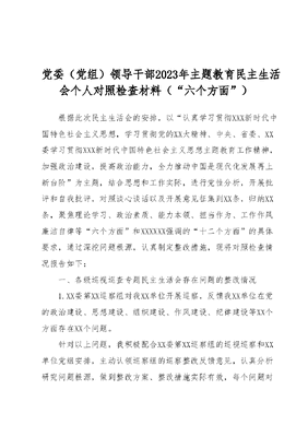 党委(党组)领导干部2023年主题教育民主生活会个人对照检查材料(六个方面)根据此次民主生活会的安排,以认真学习贯彻XXX新时代中国特色社会主义思想,学习贯彻党的XX大精神、中央、省委、XX委学习贯彻XXX新时代中国特色社会主义思想主题教育工作精神,加强政治建设,提高政治能力,全力推动中国是现代化发展再上新台阶为主题,结合思想和工作实际,进行党性分析,开展批评和自我批评,对照谈心谈话以及开展意见征集到XX条,归纳XX条,聚焦理论学习、政治素质、能力本领、担当作为、工作作风廉洁自律等六个方面和XXXXXX强调的十二个方面的具体要求,通过深挖问题根源,认真制定整改措施,现将对照检查情况报告如下:一、各级巡视巡查专题民主生活会存在问题的整改情况1.XX委第XX巡察组对我XX单位开展巡察,反馈我XX单位在党的政治建设、思想建设、组织建设、作风建设、纪律建设等XX个方面存在XX个问题。针对以上问题,我积极配合XX委第XX巡察组的巡视巡察和XX单位党组安排,主动认领巡察组的巡察整改反馈意见,认真分析研究问题根源,做到整改方案、整改措施实际有效,每个问题对号入座。高标准严要求制定出路线图时间表,建立整改清单,明确任务分工、整改时限,责任到科室、落实到人。目前全部整改完成,并长期坚持。二、对照检查存在的突出问题(一)在理论学习方面的问题。主要是:理论学习不深入。坚决把握正确政治方向,牢固树立四个意识,坚定四个自信,做到两个维护,也能够意识到加强思想建设和理论学习的重要性,但实际中做得却不到位,学习内容上仅对上级文件规定的篇目进行学习,对党的理论知识没有深入扩展,对XXX新时代中国特色社会主义思想没有做到全面、系统、深入的学习;学习时间上仅依靠党组中心组、会议等进行学习,平时工作中没有做到常学常新、随学随用。(二)在政治素质方面的问题。主要是:在落实上级工作要求上有偏差。在工作学习中能够在思想上、行动上与党中央保持高度一致,但在具体的贯彻落实上,存在对精神领会慢,精神从学习领会到付诸行动存在一个过程,导致没有在第一时间执行,认为抓好业务工作就是抓好党建工作了,忽视了对党支部的建设和管理,没有充分发挥党组织的战斗堡垒作用和党员的先锋模范作用,没有做到以业务抓党建、以党建促业务,党建业务存在两张皮的现象。(三)在能力本领方面的问题。主要是:聚焦主责主业抓经济运行的本领还有欠缺。缺乏大XX单位意识,XXX业务工作较广,专业性较强,平时仅关注自己分管的业务领域,对其他科室如XX科、XX经济运行情况、项目审批等业务一知半解,未深入学习研究,认为守好自己分管的领域就行了,缺乏全XX单位意识。参与全XX单位制定高质量发展规划不够积极,不主动思考,受限于业务水平不精,没有站在前头部门的角度为规划编制提出建设性意见建议,没有将分管的工作与规划编制结合起来。(四)在担当作为方面的问题。主要是:对推动高质量发展项目争资争项争示范的担当作为不主动。我XX获得XXX项目较多,XXX项目投资额度大、实施内容多、建设周期长,但是推进过程中存在问题也较多,由于思想麻痹,推动工作高质量发展的思想发条没有拧紧,担当作为、主动出击的机遇意识不强,导致该项目推进滞后,在坚决担负起解决问题、推进项目建设上存在迟疑观望,同时,没有按时每月对XXXXXX保供情况开展调度,缺少对XXX安全的检查督促。(五)在工作作风方面的问题。主要是:管理工作动真来实没有落到细处。全面从严治党的监督责任有待加强。时刻以党员标准要求自身、规范言行,做到党中央决定的坚决执行党中央禁止的坚决不做,严守政治纪律和政治规矩。但是在安排调度工作时,有时怕影响干部感情,面对存在的问题,常认为把该说的话都说到就可以了,而不好板起脸来提出严格要求,对分管领域和分管科室的监督上存在革命靠自觉的思想,监督有所松懈,没有处理好严管和厚爱的关系。(六)在廉洁自律方面的问题。主要是:清正廉洁带头示范的效应有所减弱。我能坚持做到落实中央八项规定精神,坚决反对四风,认为自己没有条件和能力去做超标准和违约的事,这样就不自觉地产生了安于现状的思想,在廉洁自律方面没有百尺竿头更进一步,在廉政建设上没有逆水行舟不进则退,没有更高标准地严格要求自己。三、存在问题的原因分析通过认真对照和剖析自己,存在以上问题,究其原因为以下几个方面:(一)学懂弄通做实不到位。能够认识政治理论学习的重要性,按要求参加好集中学习,但没有做到学深悟透、学用结合,往往是零碎片段式学习多、原原本本读原著少,领会中央精神多联系个人实际少,结合分管工作多、开展党性剖析少。缺乏自我审视,对世界观、价值观、人生观改造不够,导致共产主义精神追求领悟不够,对理想信念的坚守不够。(二)党性锤炼不够,以落