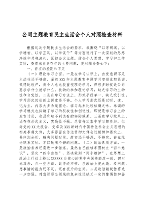 公司主题教育民主生活会个人对照检查材料根据这次专题民主生活会的要求,我围绕以学铸魂、以学增智、以学正风、以学促干等方面进行了一次深刻的思想淬炼和灵魂洗礼。紧扣会议主题,结合个人思想、学习和工作实际,查摆出自身存在的主要问题,现对照检查如下:一、存在的差距和不足(一)理论学习方面。一是在学习认识上,自觉意识不足主动性还不够高。虽然XXX和主题教育专题学习安排比较紧密、抓得比较严,我个人也比较重视理论学习,但很多时候是公司要求学什么就学什么,被动的参加理论学习,缺乏学习的主动性和自觉性。二是在学习方法上,形式手段单一,缺乏吸引性。学习形式的创新上探索得不够,个人学习形式还是以听、读、记为主,内容大多为纯理论,学习起来比较枯燥乏味,单调的学习模式也抑制了学习的积极性和创造性。即便是学习会上的发言讨论,也没有起不到该有的实际效果。三是在学习效果上,还存在形式主义,实践性不强。尽管每次集中学习都参加,但对党的XX大报告、党章及XXX新时代中国特色社会主义思想的相关书籍文件,大多停留在传达贯彻文件会议精神和要求上,具体到分析、解决问题时候,落实还不够深、不够实,存在理论联系实际、学以致用不够的问题。(二)政治素质方面。一是政治素养还需进一步锤炼。虽然自己能够牢固树立四个意识,坚定四个自信,坚决做到两个维护,在思想上政治上行动上能以XXXXXX为核心的党中央保持高度一致。但对标对表,在一些方面,做得还不够,从政治上把大局、看问题、想事情的能力还不足,还有提升的空间。二是政治敏锐性需进一步加强。对意识形态领域的复杂性还缺乏一定的警惕性和鉴别力,对社会上个别消极议论或负面言论抵制还不力,有时认为只要自己不附和、不转发就行了,没有以一个党员的身份去力所能及的进行抵制或弘扬正能量。三是政治引领作用还不够到位。虽能够在重大是非问题上做到信仰不动摇、立场不含糊、方向不偏移。但有时候在一些具体工作中还不善于从政治的高度、全局的角度、战略的维度出发去看待问题、分析问题、解决问题,对政治意义、政治要求、政治影响等想得还不多,不够深入,党建引领作用还不明显。(三)能力本领方面。一是理论武装还不扎实。虽然经常参加联组和支部组织的集体学习研讨、主题党日活动等,对党的XX大精神、XXXXXX著作论述进行了全面、系统的学习,但仍存在学习不及时、开展研讨交流不扎实、不深刻的问题,在学懂弄通上还有差距。二是工作标准还不够高。大局意识还不够强,对自己分管的工作考虑多,对公司整体和全局发展工作考虑得相对少,有时候存在小进则满的心态,例如人才配置机制缺乏科学的、系统的、有效的入职测评或考试机制,离更高标准、更严要求,打造优秀的公司服务队伍要求还有一定差距。三是创新探索程度还不足。在公司交办的工作中,虽能主动以改革的思路、创新的办法推动工作,但创新的系统集成还不够完善,人力资源管理有时还停留在传统人事管理阶段,工作中还有求稳、怕犯错误的心态以及不敢突破惯例的想法。(四)担当作为方面。一是担当意识不够强烈。面对一些艰巨繁重的工作,未能及时想尽一切办法去解决,没有去全力发动大家,集合众人的智慧和力量去解决问题,迎难而上的工作精神还不足。二是思想解放还不够彻底。自分管公司人力资源部以来,大部分延用以前的运行模式,虽然在管理制度、用工形式、薪酬绩效、员工福利等具体工作方面,突破性的做出了一些亮点工作,但对如何创新工作思路、如何提升服务等方面还缺乏全面系统深入的研究,缺乏探索创新的及时性、主动性。三是攻坚克难的精神还不够足。在景区酒店行业竞争激烈的背景下,对于公司人才队伍服务能力参差不齐、人员流动性大、旺季用工紧缺等一些复杂棘手的难题,虽然提出了一些有效的解决措施,但不能从根本上解决问题,攻坚克难的拼劲和闯劲还不足。(五)工作作风方面。一是调研的实效性仍需加强。调研的形式相对单一,对一线的工作情况和问题缺少深入的了解和思考。走访调研中,与下属直接交流不够多,在倾听职工呼声、了解需求上仍有不足,调研成果推动问题解决的效果还不明显。二是宗旨意识还不够强。自己日常虽然注重工作的方式方法,认真了解职工述求,结合分管工作实际也研究制定了一些措施,但在办公室里听汇报、下指示较多,沉身问计方面做得还不够好,形式主义、官僚主义的作风在自己身上不同程度地存在,宗旨意识还需进一步增强。三是工作落实的细致性仍需加强。有些工作推进过程中还存在抓而不紧、抓而不细的现象,跟踪问效还不足。对人力资源部提要求、下任务、压担子较多,对其在公司高质量发展中如何更好发挥作用指导不足,指导解决实际困难不够多。(六)廉洁自律方面。一是思想认识还不到位。有时认为自己做到抗腐防变、洁身自好就够了,满足于自己不违法、不违规、不违纪、不触线,存在把自己当成一名普通职工群众的现象,没有以一名班子成员、一名优秀党员的标准严