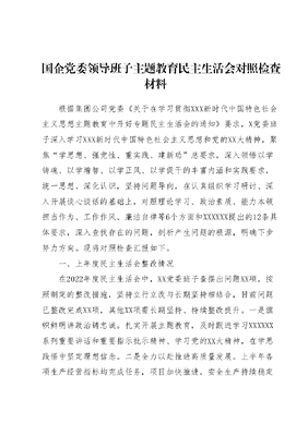 国企党委领导班子主题教育民主生活会对照检查材料根据集团公司党委《关于在学习贯彻XXX新时代中国特色社会主义思想主题教育中开好专题民主生活会的通知》要求,X党委班子深入学习XXX新时代中国特色社会主义思想和党的XX大精神,聚焦学思想、强党性、重实践、建新功总要求,深入领悟以学铸魂、以学增智、以学正风、以学促干的丰富内涵和实践要求,统一思想、深化认识,坚持问题导向,在认真组织学习研讨、深入开展谈心谈话的基础上,对照理论学习、政治素质、能力本领担当作为、工作作风、廉洁自律等6个方面和XXXXXX提出的12条具体要求,深入查找存在的问题,剖析产生问题的根源,明确下步努力方向。现将对照检查汇报如下。一、上年度民主生活会整改情况在2022年度民主生活会中,XX党委班子查摆出问题XX项,按照制定的整改措施,坚持立行立改与长期坚持相结合,目前问题已整改完成XX项,其他XX项需长期坚持、持续整改提升。一是旗帜鲜明讲政治铸忠诚。扎实开展主题教育,及时跟进学习XXXXXX系列重要讲话和重要指示批示精神、学习党的XX大精神,在学思践悟中坚定理想信念。二是全力以赴推进高质量发展。上半年各项生产经营指标均完成任务,项目加快推进,安全生产持续稳定三是用心用情惠民意增福祉。员工薪酬体系进一步优化,XX实践活动有序推进,XX等系列文体活动扎实开展,员工精神风貌蓬勃向上。二、查摆的主要问题(一)理论学习方面。一是在常学常新、真学真懂上有差距对XXX新时代中国特色社会主义思想,特别是党的XX大提出的一系列新理论、新观念、新战略理解得不够透彻,系统把握、学思践悟方面还存在短板和不足,对国之大者XX等重要论述还没有完全做到真知深知、融会贯通。二是学习的实践性上有差距。有时满足于就学习而学习,将学习成果转化为实践应用不够,不能把学习成果很好地融入工作实践中。比如在学习运用XX解决XX高质量发展所面临的短板方面,采取的行动措施仍较少。三是学习的重要性认识上有差距。没有把学习贯彻XXX新时代中国特色社会主义思想上升到解决自身理想信念宗旨的高度来认识,思想建设站位还不够不高,重视程度还不够。(二)政治素质方面。一是锤炼提高政治三力不够有力党委班子政治判断力、政治领悟力、政治执行力还有待进一步锤炼,对国家政策、市场变化XX业新要求从政治上考量、研究的不够,结合自身职责定位进行思考、贯彻的能力还不强。二是没有站位全局考虑问题。有时习惯于站位自身角度思考问题,难以跳出思维圈层,还没把XX工作完全上升到XX中去思考、去谋划。三是决策执行上不够有力。在落实中央方针政策和重大决策部署上基层的执行力和落实力不足,有时存在上热下冷、上紧下松、上实下虚的现象。在具体工作中,有时考虑的客观因素过多,导致虽对上级提出的各项重大决策能够落实,但在完成时间、质量和效果上有差距。四是党的领导融入公司治理还不够有效。党建指导业务工作的导航作用发挥不够,基层党组织围绕生产经营发挥作用缺乏创新举措和有效载体。(三)能力本领方面。一是全面、完整、准确贯彻新发展理念,提升整体发展质效上仍需发力。XX业务上拓展力度不够,整体盈利能力仍不足,需进一步发力。二是激活发展内生动力上有差距。XX成效不显著,XX项目等还未落地见效,..需进一步完善丰富多式联运。三是应对风险挑战的本领欠缺。发展不平衡不充分,核心竞争力不强,抗风险和抵御市场变化能力弱,在危机中发现和抢抓发展机遇的本领需进一步提升。(四)担当作为方面。一是改革创新的精气神不强劲。与XX发展新要求相比,在改革创新发展方面精气神还不够强劲,有时仅停留在确保完成各项重点工作任务和推进日常工作上,存在工作按部就班,开拓创新少,就工作干工作多,思路还不够活,格局还不够大。二是奋发进取攻坚精神有待激发。在工作中有时习惯于照抄照搬上级的做法,攻坚克难的勇气和开拓进取的精神不足。在面临严峻的市场形势下,局部还存在畏难、懈怠的情况,面对改革发展中存在的突出问题、明显短板,研究谋划得还不够深,敢啃硬骨头的勇气还不够。三是强化管理打造一流上仍需发力。与XX相比,存在日常管理中标准不高、执行不快、流程不畅、落地不实的问题。(五)工作作风方面。一是工作落实没有形成闭环。在抓工作落实上还存在着重布置、轻落实的问题,有些工作部署在落实过程中跟得不紧、督得不严,导致部分上级安排及党委议定事项落实不够到位。二是服务群众质量不高。在为基层职工群众服务上还缺少积极性和主动性,对职工群众反映的难点热点问题,拓思路、出点子还不够。关心关爱基层职工的有效举措不多,有时只停留在慰问谈心上,整体服务基层的程度不高、措施不实,需在X上狠下功夫。三是开展调研还不实。领导班子精力用于事务性工作较多,用于深入基层、联系群众相对较少。在具体工作指导上,听汇报多一些,深入生产一线较少,通过调研深入发现群众