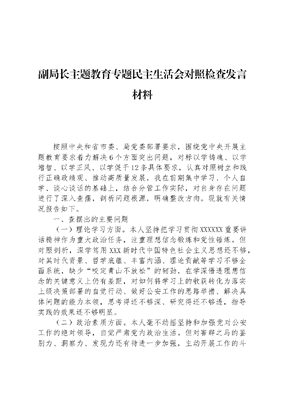 副局长主题教育专题民主生活会对照检查发言材料按照中央和省市委、局党委部署要求,围绕党中央开展主题教育要求着力解决6个方面突出问题,对标以学铸魂、以学增智、以学正风、以学促干12条具体要求,认真对照树立和践行正确政绩观、推动高质量发展,我在前期集中学习、个人自学、谈心谈话的基础上,结合分管工作实际,对自身存在问题进行了深入查摆,剖析问题根源,明确整改方向。现就有关情况报告如下。一、查摆出的主要问题(一)理论学习方面。本人坚持把学习贯彻XXXXXX重要讲话精神作为重大政治任务,注重理想信念锻炼和党性锤炼。但对照剖析,深学笃用XXX新时代中国特色社会主义思想还不够,对其时代背景、哲学底蕴、丰富内涵、理论贡献等学习不够全面系统,缺少咬定青山不放松的韧劲,在学深悟透理想信念的关键意义上仍有差距,对如何将学习上的收获转化为落实上级决策部署的自觉行动、做好公安工作的思路举措、解决具体问题的能力本领,思考得还不够深、研究得还不够透,指导实践的效果还不够明显。(二)政治素质方面。本人毫不动摇坚持和加强党对公安工作的绝对领导,自觉严肃党内政治生活。但对害群之马的鉴别力、洞察力、发现力还有待进一步加强,主动开展工作的斗争精神、斗争策略还不够。经常性深入基层调查研究、对基层工作进行指导督促还不够,对一些问题发现不够及时,对一些顽瘴痼疾掌握不够全面,没有及时采取有力措施加以整改。对待工作、对待身边的人,偏好于就事论事,不能很好地从政治角度观察现象、思考问题,从政治上观大势、看全局、见微知著的能力还需再提升。(三)能力本领方面。能够立足岗位,尽职履职,敢于担当,敢于作为,主动应对风险挑战,着力破解突出矛盾,扎实做好六稳工作,全面落实六保任务。但在创新推进公安工作方面,还存在办法不够多、眼界不够宽的问题。比如,在推进公安工作高质量发展,融入国家治理体系和治理能力现代化方面还存在亮点不够多、支撑力不够强的问题;在枫桥式派出所建设、派出所一室两队改革等基层基础建设方面,还存在步子不够大、进度不够快的问题。这与自己专业知识面有限、创新谋划不够、推动不够果断也有一定关系。有时虽对某些工作有所思考,但思想上顾虑多,推动上不够大胆,最终没有付诸实践,还需要进一步总结经验、开阔思路、敢于先行先试。(四)担当作为方面。平时深入基层调研和联系群众倾听意见还不够到位,掌握第一手资料,发现深层次问题较少,没能很好的为基层及时减负。在树立正确政绩观方面,有时也存在偏重实用主义倾向,更多精力放在了急难险重任务上,而沉下心来研究谋划分管工作发展规律、发展战略方面做得还不够。对自身各方面要求较严,但对下级往往是鼓励激励多、严格批评少,泛泛提醒多、红脸出汗少,有时在一些不涉及自己分管领域的小事情上,标准不够高、要求不够严,个别问题没有得到彻底整改。(五)工作作风方面。作为从基层成长起来的干部,对队伍的整体情况、思想状况、能力特点掌握比较全面,也很有感情。但随着岗位调整、工作环境的变化,到基层调研走访、与民警谈心谈话的覆盖面和深度仍有不足,对队伍中的新情况、新问题及苗头隐患排查不够细致彻底,对民警8小时外的监督还存在盲区,对有些问题产生的深层次原因分析仍有不足。同时,在应对繁重复杂的工作时,自己一定程度上还存在重安排、轻督导的现象,平时交办事情多了,跟踪督办抓落实少了,有时把安排了当做落实了,缺乏持续跟踪问效、一抓到底的钉钉子精神。(六)廉洁自律方面。我始终做到政治上清醒、生活上清正、工作上清廉,重操守、慎交友、淡名利、高追求,没有利用职权谋取不正当利益,能够合理区分生活与工作、家事和公事,能够依法依规依程序办理各种事项,牢固树立干净干事、勤政廉洁的良好形象。但在全面从严管党治警上下的功夫还不够深入,有时认为队伍管理有政工和纪检部门在抓,容易满足于个人不违规、不触线、不出事,纪律要求点对点谈话较少,分管单位队伍中仍有党员民警因违规用权和涉及经济问题受到处理。(七)对照典型案例检视方面。去年查处XX系列案,呈现出链条式、塌方式、群体化腐败的特点,影响极其恶劣、教训极为深刻。对照自身,一是示范作用还需加强。满足于自己不违规、不碰线,在做示范表率上还要进一步提升;二是思想认识有待提升。片面认为同志们能够充分认清党的十八大以来的反腐高压态势,不会犯原则性错误,对一些苗头性、倾向性问题,未能及时咬耳朵、扯衣袖、敲警钟。三是监督上仍有差距。特别是8小时以外的监督还不够有效,及时发现、抓早抓小力度不够。(八)其他说明事项。本人严格遵守政治纪律和政治规矩,坚持廉洁自律、依法履职、秉公用权,严格约束自己的行为操守,持续加强家庭家教家风建设,自觉净化个人生活圈、交往圈、娱乐圈。一是严格履行全面从严治党两个责任和一岗双责,认真落实意识形态责任制,全面融入分管工作,同研究、