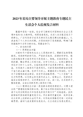 2023年某局主要领导开展主题教育专题民主生活会个人检视发言材料根据市委统一安排,结合学习新时代中国特色社会主义思想和党的XX大精神等,对照党章党纪,在深入走访基层党员干部群众,广泛听取班子成员及相关同志意见建议的基础上,认真查找了个人存在的问题,并深刻剖析了思想根源,明确了整改措施和今后努力的方向,现报告如下:一、存在的问题(一)思想政治方面对新时代中国特色社会主义思想的学习、理解还比较零散微观,对其鲜明的时代性、严密的系统性、深邃的科学性、强大的实践性等方面思考还不是很深入、细致,在深刻领会、系统把握、融会贯通上还有欠缺。在学习形式上,比较注重集体传达学习和个人自学,在组织政府班子成员集中研讨、相互交流、共同提升上做得还不是很到位,对新思想的理解有时局限于自己的点滴之悟。在学习内容上,根据政府工作实际,对习关于加强党的政治建设、扶贫开发战略思想、八个坚持生态文明思想,以及防止和克服形式主义、官僚主义、民营经济座谈会等精神学习、运用得相对多一些、深一些,在系统学习、整体把握、全面应用新思想上做得还不够。(二)精神状态方面一是创新本领还有待提升。对照A提出的要增强改革创新本领,善于结合实际创造性推动工作,善于运用互联网技术和信息化手段开展工作还有差距。虽然能够始终坚持高质量发展方向,但在推进质量变革、效率变革、动力变革上创新的办法还不多,对传统发展路径还有一定的依赖思想。面对飞速发展的信息技术,在主动适应信息化要求、强化互联网思维上还需提高,在运用、推广、普及互联网技术和信息化手段开展工作上行之有效的举措还不是很多。二是开放发展还有待提速。有时过于强调自力更生、自己的事情自己办,在借势借力、扩大开放上做得还不是很到位,开放的思维还不够解放,开放的视野还不够开阔,开放的举措还不够有力。近年来,在持续跟进、做实做优高新技术产业园上还没有取得实质性进展,良好的外部资源没有得到有效的利用。(三)工作作风方面虽然从严控制会议数量、规模、内容、时间,以便腾出更多精力下基层、抓落实,但为了及时传达学习贯彻上级重要讲话、会议和文件等精神,及时研究协调解决发展中的具体困难和问题,及时跟踪督办推进各项工作落实情况,从而根据需要在一定层面上组织召开了政府党组会、常务会、县长办公会、专题会、现场推进会等各类会议,一定程度上造成会议较多。有些会议内容安排较为集中,时间不得已有所延长,导致有些参会同志有意见。二、原因剖析一是理论修养有待进一步提高。有时认为作为政府的主要负责同志,要率先垂范、务实重行,引导和带领全县政府系统党员干部,把更多的心思、时间和精力放在抓落实、抓执行上、抓督办上,工与学的天平有时还不是很平衡,在学习理论武装思想、运用理论指导实践上做得还不够,学以增智、学以提能、学以致用的氛围还不是很浓。面对新时代一系列重大的理论成果、重大的政治论断、重大的决策部署、重要的讲话精神等,还要抽出更多时间和精力,反复研学、深入思考、消化吸收、推动工作;面对经济发展阶段的转变、发展方式的转型等方面出现的一些新情况、新矛盾、新问题,也需要用科学的理论来分析、研判,真正以理论修养的不断提升,推动各项工作的持续跨越。二是创新意识有待进一步增强。虽然能够坚决贯彻落实中央和省市县委各项决策部署,但在结合政府自身工作实际,创造性地开展工作方面做得还不够到位。有时过于注重政策、规定的刚性约束、硬性要求,维护政策的严肃性,因此,基本上是按照上级精神和要求,原原本本抓落实,不折不扣强执行,担心创新是钻政策的空子、打政策的擦边球,对上级政策、文件的原则性与灵活性、指导性与实践性有时把握还不是很精准,对创新与变通有时理解还不是很到位,创新的理念、创新的思维、创新的能力还没有完全适应新时代、新发展方式对政府工作的新要求。三是从严治党有待进一步深化。虽然经常教育引导政府系统党员干部要珍惜履职之资,恪守岗位之责,绷紧纪律之弦,言行符合规矩,举止不越法度,但在管理范围上,更多地是对自己、班子成员和政府系统一把手常敲警钟、常念紧箍咒,对其他一般党员干部要求还不够经常、不够严实,从严治党的压力传导还需进一步延伸;在执纪问责上,更多地是看到干部的责任与担当,对极少数情节轻微的违纪违规人员,多以批评教育为主,在问责处理上还不是很严厉。三、整改措施一是强化理论武装。认真学习贯彻新时代中国特色社会主义思想,以滴水穿石的韧劲、秉烛求真的激情,真学真信、深学深悟、笃学笃行,以学习、践行新思想的实际效果,进一步增强四个意识,坚定四个自信,坚决做到两个维护。坚持系统学,深刻理解八个明确的思想逻辑,准确把握十四个坚持的基本方略,全面掌握创新理论的基本观点、理论体系、深刻内涵;坚持跟进学,做到时间上跟进、思想上跟进、情感上跟进,切实推动新思想学习往深里走、往实里走、往