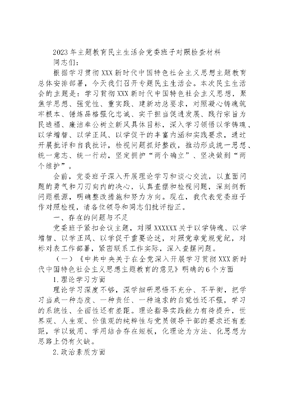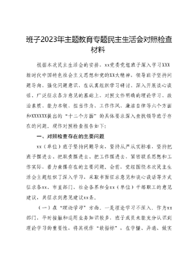 班子2023年主题教育专题民主生活会对照检查材料根据本次民主生活会的安排,xx党委党组班子深入学习XXX新时代中国特色社会主义思想和党的XX大精神,领导班子坚持问题导向,强化问题意识,在认真组织学习研讨、深入开展谈心谈话、广泛征求各方意见的基础上,对照文件明确的理论学习、政治素质、能力本领、担当作为、工作作风、廉洁自律等六个方面和XXXXXX提出的十二个方面的具体要求深入查找领导班子存在的问题。现作对照检查报告如下:一、对照检查存在的主要问题xx(单位)班子坚持问题导向,坚持从严从实标准,坚持把班子摆进去、把职责摆进去、把工作摆进去,紧密联系思想和工作实际,着力查摆存在的主要问题。会前,党组围绕本次民主生活会主题组织了深入学习,采取书面征求意见和谈心谈话等方式征求各xx、市直部门、社会各界和全xx(单位)干部职工的意见建议,共征求到意见建议xx条。(一)在理论学习方面。一是理论学习不深入。作为xx部门,平时接触和运用业务知识较多,班子成员未能充分认识到理论学习的重要性,将其视作软指标,在学懂、弄通、做实XXX新时代中国特色社会主义思想方面存在一定差距。例如,在学习《XXX著作选读》时,对其内容仅有简单了解,缺乏深入研究;对XXX新时代中国特色社会主义思想的时代背景、历史地位、哲学意蕴、理论贡献的认识不够深刻,仍停留在表面的了解阶段。二是学用结合不紧密。在学习过程中,未能充分结合单位的思想实际和工作实践,面对新的机遇和挑战,未能充分运用新思想指导实践、推动工作。(二)在政治素质方面。一是落实上级部署不彻底。在贯彻党中央和省、市委各项决策部署时,班子成员未能深入研究思考解决问题的方法和途径。例如,在xx工作中,过于强调自身困难,而忽视了全xx(单位)的利益,未能妥善引导相关部门扎实推进xx工作,导致xx投资出现负增长的被动局面。二是政治敏锐性不够。在xx建设中,未能全面考虑各方面因素,未能进行全面统筹规划、推进和落实,未能充分发挥班子成员在政治决策中的参谋助手作用,仅仅从统筹调度的角色出发,执行文件而执行文件,未能在xx建设体制机制上进行创新规划。(三)在能力本领方面。一是履职尽责存在差距。在部分xx工作中,存在过于重视申报而轻视管理的情况,认为只要xx工作申报成功,就算完成任务,对于xx工作的实施、管理和跟踪不够统筹调度,导致部分xx工作推进落实不到位。例如,目前xx工作仅完成了上一年度的建设任务,未能充分发挥xx的牵头作用导致该xx工作在2023年的进度较为缓慢。二是调研能力不强。在调查研究方面,未能深入开展调查研究工作,特别是在带着问题进行调研时,未能充分思考和思考。例如,在对单位乡村振兴办帮扶开展调研时,主要关注村级工作情况,班子成员较少参与到本单位挂帮的xx村的乡村振兴工作中,与群众接触和交流较少,未能充分倾听群众的意见和建议。(四)在担当作为方面。一是主动履行担当作为不够突出。班子成员在担任参谋助手和独立负责的角色时,未能充分发挥其作用,有时存在对工作落实不够主动的情况。例如,在推进xx工业化大比武工作时,负责牵头的班子成员在经济形势好转后,思想上出现放松,未能进一步加强对xx情况的调度和推进二是面对困难挑战的意志力不足。个别班子成员在面对困难和阻力时,缺乏攻坚克难、敢于解决难题的决心和毅力,未能展现积极进取的工作状态。例如,在解决长期未解决的2个信访问题上,涉及到xx工作和xx的问题仍未完全整改到位。(五)在工作作风方面。一是作风建设有待加强。部分同志在工作落实中存在布置重于落实的问题,有些工作在落实过程中跟进不紧、督促不严,导致部分xx(单位)党组会议确定的事项落实不够到位。二是党内政治生活制度执行不严格。党内政治生活开展不够深入,忙于业务工作时忽视按时召开三会一课、组织主题党日等活动,对党支部的建设和管理有所松懈,未能充分发挥党组织的战斗堡垒作用和党员的先锋模范作用。班子成员之间的沟通交流不够充分,谈心谈话中提出的问题不够深入。班子成员更多地关注彼此的优点和期望,而对工作问题和思想问题的批评不够突出。。(六)在廉洁自律方面。一是廉政教育需加强。在政治敏锐性方面,班子成员的主观认识还不够强烈,常常认为不会违反政治纪律,对于廉政教育的重视程度还不够。在纪律教育的广度、深度和力度上还有待加强,对纪严于法的要求尚未深入人心,对严格要求的放松程度较高。对清正廉洁的高度认识不够,廉政教育还未形成常态化机制,自觉执行制度和纪律的意识有所松懈。二是仍存在个别违纪违法情况。班子成员没有充分意识到政治纪律是带电的高压线,政治规矩是高悬的铁戒尺。特别是一些公职人员酒后驾车、违法驾驶等问题屡禁不止。今年以来,已有xx名同志因违纪违法问题受到相应处分。。三、问题产生的原因分析经过认真反思和深
