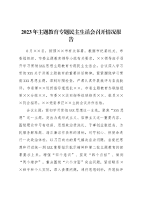 2023年主题教育专题民主生活会召开情况报告8月××日,按照××市有关部署,根据市纪委机关、市委组织部、市委主题教育领导小组有关要求,××领导班子召开学习贯彻XXX思想主题教育专题民主生活会。会议深入学习贯彻XXX关于开展主题教育的重要讲话精神,紧紧围绕学习贯彻XXX思想主题,深刻对照检查,严肃认真开展批评与自我批评。市委第××巡回指导组组长××,市委主题教育办联络组第××分组××,市委××巡回指导组联络员××、组员×××到会指导。××党委书记××主持会议并作总结。会议主题:紧扣学习贯彻XXX思想这一主线,聚焦XXX思想这一主题,突出力戒形式主义、官僚主义这一重要内容,围绕理论学习有收获、思想政治受洗礼、干事创业敢担当、为民服务解难题、清正廉洁作表率的目标,对守初心、担使命进行一次政治体检,以刀刃向内的勇气解决自身问题,自觉把思想和行动统一到XXX重要指示批示精神和第二批主题教育的部署要求上来,增强四个意识、坚定四个自信、做到两个维护。重点围绕六个方面突出问题,紧密联系××班子和个人实际,深入查摆问题,进行思想剖析,开展批评和自我批评。现将会议召开情况报告如下:××党委坚持把开好此次主题教育专题民主生活会作为重要的政治任务,在市委第××巡回指导组的指导下,领导班子集体研究制定工作方案,细化工作流程,按要求扎实做好各项准备工作。一、精心组织,做好会前准备工作(一)深入学习,打好思想基础。××党委理论学习中心组专门举行集中学习,深入学习了XXX关于党的建设的重要思想、关于严肃党内政治生活的重要讲话和重要指示批示精神以及党章、新形势下党内政治生活若干准则等内容,××打牢开好民主生活会的思想基础。(二)广泛征询,找准突出问题。为准确查找问题,第一时间以书面形式广泛征求党员、干部和群众意见建议。下属各党(总)支部经召开座谈会、个别访谈等方式广泛征求意见,先后征求××名党员、××名干部、××名群众的意见,共征求意见建议××条。××委对征求到的意见建议进行研究采纳,向班子成员进行反馈,班子成员主动认领,为查摆问题、撰写班子对照检查材料和个人发言提纲提供了重要参考。(三)谈心谈话,相互促进提高。××委班子成员××第一时间开展谈心谈话,在谈话中坚持聚焦民主生活会主题,结合工作实际,把自己摆进去、把职责摆进去、把工作摆进去,把问题谈深谈透。通过谈心谈话,充分沟通思想、交换意见,增进班子团结,营造开好专题民主生活会的良好氛围。(四)查摆剖析,认真撰写材料。按照班子对照检查材料和个人发言提纲的撰写要求,××委及班子成员坚持理论联系实际,坚持问题导向,强化问题意识,认真撰写领导班子对照检查材料和班子成员个人发言提纲。××同志亲自主持起草班子对照检查材料,先后多次召开会议集体讨论。班子成员个人发言提纲自己动手撰写,认真修改,直奔主题、直面问题,剖析存在的问题,挖掘问题根源,有针对性制定整改措施,由×××逐一审阅把关,并经督导组指导审核通过,切实做到落细落小落实,见人见事见思想。二、严肃开好专题民主生活会,达到预期目的(一)对照检查剖析深刻,触及灵魂。会议由××同志主持,会议共有五项议程。一是××党委副书记××同志通报了2022年度民主生活会整改措施落实情况;二是××同志代表领导班子作对照检查,对照《中共中央关于在全党深入开展学习贯彻XXX思想主题教育的意见》明确的理论学习、政治素质、能力本领、担当作为、工作作风、廉洁自律等6个方面突出问题,特别是对照XXX提出的以学铸魂、以学增智、以学正风、以学促干的12条具体要求,认真检视差距不足,深刻进行党性分析,深入剖析反面典型案例,有针对性地提出整改措施;三是党委班子成员逐一发言,××同志带头进行自我批评,领导班子其他成员依次进行对照检查,每名同志自我批评后,其他同志提出批评意见,每个人作认真表态,做到了开诚布公、坦诚相见,达到了统一思想、统一意志、统一行动目的;四是××督导组组长××同志进行点评;五是××代表班子进行表态发言。在××督导组的有力指导下,这次民主生活会开出高质量、好效果,达到预期目的。(二)××督导组点评指导全面客观,指导性强。××督导组组长××同志在会上做了全面点评,对会前准备工作比较扎实,民主生活会质量较高给予肯定,对做好会后有关工作提出三点建议,对扎实做好学习宣传贯彻XXX思想主题教育有关工作进行部署时强调,要把民主生活会成果转化为干事创业成果,在新时代××振兴上展现××更大担当和作为。(三)表态发言结合实际,诚恳坚决。××在总结讲话时表示,××党委将以这次专题民主生活会为新的起点,全面落实XXX重要讲话和重要指示批示精神,贯彻落实党中央决策部署,推动主题教育走深走实,为××作好示范、当好表率。三、下一步主要措施一是要坚定理想信念、铸牢政治忠诚,在以学铸魂上持续用劲。