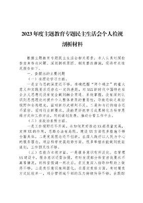 2023年度主题教育专题民主生活会个人检视剖析材料根据主题教育专题民主生活会相关要求,本人认真对照检查自身存在问题、深刻剖析原因、制定整改措施,现将有关情况报告如下。一、查摆出的主要问题(一)在理论学习方面。一是言与思的深度还不够。准确把握两个确立的重大意义和实践要求还存在一定的差距,对XXX新时代中国特色社会主义思想还没有完全做到融会贯通、系统掌握。没有深刻认识到思想理论对提升个人整体素质的重要性,导致还缺乏政治视野和全局眼光,面对新形式研判不足。二是知与行的结合还不紧密。面对行业新要求,没能更好把学习成果转化为科学思维方式和工作方法,用到谋划发展、推动分管工作中去。(二)在政治素质方面。一是工作视野还不开阔。在如何更好推动XX高质量发展,发挥XX的作用,思路办法有局限。建设XX方面很多措施不够全面具体。二是发展理念还不创新。在深入践行以人民为中心的服务理念,顺应科学发展趋势方面,很多举措未能做到提前谋划,工作预见性不够。(三)在能力本领方面。一是服务意识有所淡化。在管理XX建设中,服务意识还需加强,有时发现部分科室自我要求不高等情况,到科室强调一两次后,在反复深入指导和帮助上做得不够。二是责任意识有所弱化。在落实责任方面,有时履责方式比较单一,对分管领域干部的压力持续传导不够,在跟踪问效、末端落实上功夫下得还不深。三是落实制度有差距。在落实主动把党建工作与重要业务工作加强融合的要求上做得不到位时,及时指导不足,主动作为有局限。(四)在担当作为方面。一是密切联系群众还不到位。有时与中层干部沟通较多,和年轻普通职工交流较少,业务说得较多,深入交心谈心较少。二是担当作为还有不足之处。面对棘手问题,存有暂时搁置争议、回避矛盾的畏难想法,没有更主动深入帮助职工和科室分析问题,提出解决办法。(五)在工作作风方面。一是斗争精神还有待提升。面对一些工作任务,有时认为领导怎样安排就怎样做,在落实中发现新情况,调研后认为需要调整措施时,有时顾虑较多,瞻前思后,缺乏敢言说的勇气。二是攻坚克难锐劲还有待提升。有时遇到困难存有畏难情绪,结合实际,深入研究问题有效破解的举措不多,缺乏敢闯敢试的锐气。(六)在廉洁自律方面。一是管理约束还要提高。立足自身岗位和工作实际,严把审核工作关口的意识还要加强,主动接受监督的意识还要加强。二是自我要求还要加强。工作中看到一些问题,有时认为该领域不是我主要分管,缺乏持续深度的全面调研;有时方式方法比较直接简单,没深入考虑就直接生硬表态。二、产生问题的原因剖析(一)理论学习不深。客观上以工作忙、压力大为借口,把学习当成软指标,存在就事论事,碎片化学习等情况,没有处理好工学矛盾。对各级重要会议文件的学习有实用主义倾向,与分管工作联系紧密的内容学得相对多一些,对党史、法律、文化等方面的学习研究有滞后,导致还缺乏政治视野和全局眼光,立足实际学习运用政策的能力需要着力提升。(二)党性锤炼不强。对照党章党规和XXXXXX系列讲话精神,深感自己仍有较大差距,没有时刻以高标准严格要求自己,忽视了时刻要有自我约束、自我监督、自我提高的心态。面对繁重的工作任务,没有很好地处理好抓分管工作与加强自身党性锻炼的关系,存在忙于事务性工作而放松主观世界改造的现象。(三)担当精神不足。面对近年来高速发展中的新矛盾、新问题,工作标准越来越高,工作难度越来越大,有时有求稳怕乱的想法,有时有等候领导安排才好开展工作的依赖想法,勇于担当、开拓创新的冲劲有所减弱。三、改进措施(一)加强理论学习。通过学习坚定理想信念,增强党的意识、强化党性观念。认真系统学习XXXXXX系列重要讲话精神,学习党纪党规,学习法规政策,学习各项专业技能知识,看得清大势,辨得清方向。着力更新思想转变观念,把不合时宜的惯性思维、路径依赖、陈旧模式予以置换,用新理念思路指导工作。将上级部门各项决策部署与医院实际有机结合起来,完善落实工作机制,加强督促检查,做到令行禁止,确保政令畅通。(二)强化责任担当。树立功成不必在我、功成必定有我的境界,把初心和使命变成锐意进取、开拓创新、真抓实干的自觉行动。用心开展批评和自我批评,围绕XX高质量发展方向,看看确定的任务哪些还没做,哪些做的还不够。除了建立长效机制,还要常态化定期梳理,不断完善规章制度。杜绝等会议部署、等领导安排、等基层催问的被动应对状态,树立创新意识,突破传统模式,大胆开展工作。坚持持续深入一线掌握第一手情况,把群众的所思所想、所急所盼作为考虑问题的主要出发点。要学会既把握底线,又要虚心听取不同意见。提高抓重点的能力和统筹协调能力。要多与分管部门的同志交心谈心,帮助解决问题。既谈工作,也谈思想;既有工作布置,也有督促检查;既有批评,也有鼓励。(三)严守纪律规矩。始终保持为民务实清廉的政治本色,正确处理公私义利、是非得