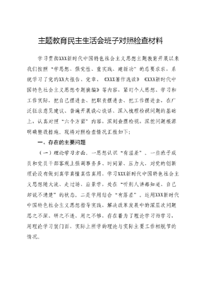 主题教育民主生活会班子对照检查材料学习贯彻XXX新时代中国特色社会主义思想主题教育开展以来我们按照学思想、强党性、重实践、建新功的总要求求,系统学习了党的XX大报告、党章、《XXX著作选读》《XXX新时代中国特色社会主义思想专题摘编》等内容,紧盯个人思想、学习和工作实际,把自己摆进去、把职责摆进去、把工作摆进去,在广泛征求意见建议、普遍开展谈心谈话、深入梳理检视问题的基础上,认真对照六个方面内容,深刻查摆检视,深挖问题根源明确整改措施。现将对照检查情况汇报如下:一、存在的主要问题(一)理论学习方面。一思想认识有温差。一些班子成员和党员干部客观上强调事务多、时间紧、压力大,对党的创新理论没有做到真学真懂真信真用,学习XXX新时代中国特色社会主义思想随大流、走过场、应景学,处在听别人讲都知道、自己却说不清楚的状态。二是学用结合有落差。运用XXX新时代中国特色社会主义思想指导实践,解决改革发展中的深层次问题思之不深、研之不透、用之不够,存在着为了理论学习而学习,用理论学习装门面,实际上所学的理论与实际主要工作相脱节的情况。(二)政治素质方面。一是政治敏锐性不强。部分班子成员缺乏从政治上认识和分析问题能力,对一些敏感问题的长期性、复杂性和艰巨性认识不足。处理问题只顾眼前、方法简单、教条主义,在协调解决遗留问题方面做的努力不够。二是意识形态工作方法单一。对新形势下加强意识形态领域工作的认识还不够高研究新形势、新情况、新问题用心不足,仍然沿用过去开大会、学文件、作报告、抄笔记等老经验、老办法,意识形态教育内容枯燥乏味,工作方式过于单一,对领导干部职工的教育作用收效还不明显。(三)能力本领方面。一是开拓创新意识不强。研究问题、推进工作还存在惯性思维、因循守旧的情况,习惯用老经验、老办法想问题、办事情,缺少具体问题具体分析,运用新思想、新方法研究解决新情况、新问题的水平不高。个别班子成员工作标准不高,习惯于按部就班,只求完成工作,不求提质提效,没有创造性开展工作的动力和干劲。二是抢抓机遇意识不强。一些班子成员对上级的方针政策,特别是一些新出台的政策,学的不深悟的不透,反应迟钝,在谋划工作和推进落实中不善于在政策中找依据、找方法、找答案,政策运用的不够好。(四)担当作为方面。一是责任担当意识不足。个别班子成员工作只停留在完成领导交办任务上,不注重发挥主观能动性推动工作取得新进展。有的同志对分管以外的工作发表意见比较少对全局工作的关心和参与还不够,存在事不关己高高挂起的思想。二是攻坚克难勇气不够。有的班子成员面对改革发展重任不敢啃硬骨头,缺乏攻坚克难的志气、敢闯敢试的锐气、大胆负责的胆气,对于困难问题绕道走,缺少大刀阔斧、奋力开拓的精神头,一些制约经济社会高质量发展的瓶颈问题还没有得到破解。(五)工作作风方面。一是解决群众诉求做得不好。随着阅历增长、环境变化,不自觉地在思想深处对为了谁、依靠谁、我是谁的认识出现模糊,对基层和群众反映的实际问题,往往交办到相关部门、乡镇和社区办理,主动回应、亲自协调解决问题不够,潜意识中在处理对上负责和对群众负责的关系上出现偏差,造成联系基层、服务群众不深入,为民解难事、办实事上还不够有力有效。二是督查调研不够深入。对各类督查调研活动安排不扎实,主动深入基层一线和乡村、农户相对较少,在督查调研工作中,往往以打电话、发文件、要材料等遥控指挥的方式代替实地督查调研,一些调研报告来源于冥思苦想、闭门造车既脱离实际,又质量不高,除了应付差事对推进工作没有多少实际意义。(六)廉洁自律方面。一是一岗双责落实不到位。在落实一岗双责上还没有真正把党风廉政建设作为自己的责任田和份内事,对分管领域的党员干部监管、制约、监督力度不够,多以开会、谈话的方式进行教育,方式单一、氛围不浓二是组织生活方法单一。在三会一课制度落实方面,满足于上级要求的规定动作,内容比较单一,缺乏创新性,泛泛谈得多、面上的情况多、理论说教多,结合现实问题开展讨论少,组织生活质量不高,对党员的教育作用收效还不明显。二、问题产生的原因分析1.理论武装不够深入。一定程度上放松了理想信念的坚守,不能一以贯之的坚持学习,没有把理论学习放在强化理想信念的高度去认识,对党的政治理论满足于一般性的学习,对XXX新时代中国特色社会主义思想学得不够系统、领会不够深刻,学习的针对性和系统性不强、覆盖面不广,导致思想缺课、精神缺钙。2.党性修养抓的不紧。政治意识和规矩意识的弦绷的还不够紧,不能经常地理清自己的思想,反思自己的行为,在知与行、用权与修身、做事与为民等党性修养方面,还存在一定的认识差距,与先进先辈相比,自我定位标准不高、个人修养不深,扎实工作、廉洁奉公的党性实践锤炼还不到位。3.宗旨意识树的不牢。为人民服务的宗旨意识