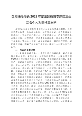 区司法局局长2023年度主题教育专题民主生活会个人对照检查材料按照2023年主题教育专题民主生活会的安排和部署,我在学习理论知识、参加政治轮训、接受警示教育、学习英模事迹的基础上,坚持把自己摆进去、把责任摆进去、把工作摆进去,在谈心谈话、梳理问题、征求意见的基础上,结合个人思想和工作实际,紧扣六个方面,盘点学习收获、剖析问题原因,制定改进措施,明确了今后的工作方向。现将个人对照检查汇报如下:一、存在的主要问题(一)理论学习方面。一是理论学习不够扎实。虽然能够通过集中学习、探讨交流、主题活动等形式,全面学习贯彻XXX新时代中国特色社会主义思想,但学习的标准不高,要求不严,学习缺乏自觉性、主动性和积极性。面对司法工作任务重、压力大的情况,工学矛盾处理的不到位,不善于从工作之余花精力、挤时间,学习态度敷衍,心态浮躁,满足于一知半解,停留在表层阶段,没有发扬钻和挤的精神,寻根问底、深钻细研,存在为应付考核检查而被动学习的形式主义倾向,导致学习停留在时紧时松、断断续续的轨道上,还需要在常态化和持久化学习上下功夫。二是学用结合不够紧密。能够自觉学习马克思主义基本原理和XXX新时代中国特色社会主义思想,但从思考、理解、总结和运用层面,学习的目标和任务不高,学习的劲头和动力不强,学习的质量和效果不好,没有真正做到学深悟透、融会贯通、举一反三,在运用XXX新时代中国特色社会主义思想指导司法工作,稳步推进人民调节、法律援助、社区矫正等工作,把握职能定位,强化司法功能,提高司法水平,缺乏深入的理解思考和分析研判,缺乏高度的融合贯通和实践运用,导致司法工作一般化,没有创新和亮点.(二)政治素质方面。在新形势下,加强思想政治教育的紧迫感和责任感不强,对锻造过硬队伍、深化干部作风的意识浅薄。对XXX法治思想的精髓和内涵理解不深不透,学习停留在表面,缺乏深度的思考和分析,致使学习教育存在前热后冷的现象。虽然能够积极参加三会一课和主题党日活动,积极参加警示教育、英模教育和党史教育,但学习教育在精益求精、务求实效方面存在短板和漏洞,学习的动力减弱、激情衰减,一定程度上存在存在被动应付和敷衍心理,在学深悟透、学以致用和学用结合方面功力用得不够,离标准还存在着一定的差距。(三)担当作为方面。一是为民服务的意识还需进一步增强。对以人民为中心的发展思想理解还不深,贯彻还不实,就如何立足司法岗位,履职担当作为,用心用情用力为据居民群众办实事、办好事方面还有一定的短板和差距。没有真正把发动群众、依靠群众、相信群众作为一切工作的力量源泉,做好人民调节、法律援助、社区矫正等工作,思考谋划、分析研判、措施实施没有完全从维护群众的利益出发,服务群众的方法和途径探索不足,有时服务群众的态度敷衍,思想冷漠,语言生硬,或多或少地有种高出不胜寒的傲慢姿态和骄傲情绪,做好群众的服务沟通和谈心交流有待于进一步加强,司法为民工作需进一步做实做细做强。二是破解为民服务难题的能力有待于进一步加强。在司法工作中群众观念不深厚,为民情怀厚植不够,主动性、积极性和创造性开展工作存在软肋和短板,对人民调解、社区矫正、刑满释放、安置帮教、矛盾排查、法律援助工作遇到的一些困难和问题,主动担当解决的意识不强,存在思想麻痹、疲于应付、精神懈怠的心理,有时遇到棘手问题,怕但风险、破惹麻烦、怕出乱子,一时间难以摆布和掌控,存在畏首畏尾,瞻前顾后的倾向,致使一些为民服务的难题拖延敷衍,甚至石沉大海,党员干部的先锋模范意识逐渐淡化,司法服务打了折扣,缩了水。敬业精神和业务能力有待于进一步加强,破瓶颈、解难题、抓突破的能力有待于进一步提升。(四)能力本领方面。一是政治敏锐感不强。针对司法工作面临的新挑战和新压力,防范化解矛盾纠纷和社会领域风险,底线思维筑得不牢,忧患意识和风险意识不强,没有真正把防范化解重大风险摆在全局工作的突出位置,及时发现、快速处置、精准管控、有效处理。对苗头性的问题防范排查、分析研判和矛盾化解,准备不够充分,处理不够及时,措施实施不力,离落实落细落强方面还有一定的差距,强化未雨绸缪、加强预警研判、驾驭工作风险的能力有待于进一步增强。二是斗争精神有所不足。能够始终牢记对党忠诚、服务人民、执法公正、纪律严明总要求,但面对司法工作的新挑战、新压力、新矛盾,顺应发展形势、抢抓发展机遇,破除发展瓶颈的力度还不大,打破常规思维,发挥破圈效应的能力需要进一步强化。比如:对司法行政、人民调解、社区矫正、刑满释放、安置帮教等工作,遇到烫手的山芋、难啃的硬骨头、不敢捅的马蜂窝,直面矛盾不足,较真碰硬不强,积极性、主动性和创造性都不够,缺乏科学、有效的决策力和执行力,勇于担当、敢于斗争、突破创新的能力有待于进一步提高。(五)工作作风方面。一是工作作风不扎实。对持之以恒抓作风的重要性认识还