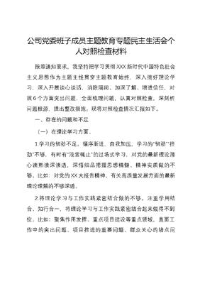 公司党委班子成员主题教育专题民主生活会个人对照检查材料按照通知要求,我坚持把学习贯彻XXX新时代中国特色社会主义思想作为主题主线贯穿主题教育始终,深入搞好理论学习,深入开展谈心谈话,消除隔阂、加深了解、增进信任,对照6个方面突出问题,全面梳理问题,认真对照检查,深刻析问题根源,提出整改措施。现将对照检查情况汇报如下。一、存在的问题和不足(一)在理论学习方面。1.学习的韧劲不足。循序渐进,自我加压,学习的韧劲挤劲不够,有时有浅尝辄止的过场式学习,对党的最新理论潜心读熟读深读透,深悟细品把握思想精髓、精神实质做的不够。比如:对党的XX大报告精神、有关高质量发展方面的最新理论理解的不够深透。2.将理论学习与工作实践紧密结合做的不够。注重学用结合、知行合一,将理论学习与工作实践紧密结合起来做得不到位。比如:聚焦作用发挥、重点项目建设等重点领域,直面工作中的突出问题、项目推进的重要问题、群众关心的堵点问题,将学习成果切实转化为提升竞争优势,推动高质量发展的举措和生动实践的成效还不显著。(二)在政治素质方面。1.政治敏锐性不够强。面对外部环境错综复杂,意识形态领域斗争尖锐情况下,善于把握政治主动,涵养政治敏锐性,增强政治判断力做的不到位。比如:针对网络不当言论,以明察秋毫的预见性、防患未然的主动性防范化解风险做的不到位,及时正面回应,澄清真相做的不够彻底。2.政治领悟力还不强。不断运用系统思维、历史思维将党的创新理论领会消化,从面指导实践、推动工作做的不够,坚持学思相长、学悟结合,知其然更知其所以然,吃透上情、了解下情,做的不到位。比如:积极应对激烈市场竞争的破题能力还不强,还有等靠现象。(三)在能力本领方面。1.抓统筹做的不到位。面对党的建设、项目推进等诸多重点工作,有时顾此失彼,不折不扣完成既定目标做的不好,把做了当成做好了。比如:对分管支部党员干部领学宣学做的不到位,在进行宣讲时,紧密联系工作实际开展宣讲做的不好,还有机械照搬现象,满足于讲了,理论宣讲走深走实做的不够。2.抓协调做的不够。与其他领导分管业务协调配合不够,不能集中力量抓工作推进。比如:在党委会研究决策中,对自己分管业务内容关注多,对别的事项参与度不高,工作中有时调研不足、计划不充分,有滞后问题。(四)在担当作为方面。1.深入基层做的不够。知责于心、担责于身、履责于行,敢于应对挑战、触及矛盾、解决问题,敢作敢为、善作善成做的不到位。比如:坚持沉下身立足工程建设一线,坚持问题导向,带着问题摸清群众反响最大、呼声最强的操心事揪心事烦心事的整体脉络做得不够,接受群众诉求还显单一,服务群众解民忧做的不到位。2.斗争精神还不足。大力弘扬斗争精神,时刻保持冲劲、干劲、韧劲,身先士卒,力求精益求精,以钉钉子精神干出实效、做出实绩做的不够。比如:在加强*管理方面,加强*运营、设施维护、日常管理等各项措施管理还不做的不够,切实强化服务,为市民营造安全、舒适、向上的*体验方面,整体谋划还不到位,还未更好激发全民热情,提高市民的获得感、幸福感,并对外更好推介*,打响品牌。(五)在工作作风方面。1.工作有时有急躁情绪。面对基层工作繁杂情况有时有急躁情绪,在与分管基层干部指导交流中,有急于求成心态。比如:在首次承办国家级*时,针对票务协调、人员点位安排、环节安排等方面,没做到忙而有序,对细节打磨不够,有重复部署影响效率问题。2.开拓创新还不够。开创性做到精心谋划,以新理念加快新发展做的不够。比如:在转化*优势谋划中,创造性地把上级部署细化成工作阶段性目标做的不够,具体可操作性的措施有时还沿用老办法、老路径。(六)在廉洁自律方面。1.从严管理做的不到位。有时存在当老好人思想,与人为善,怕影响团结和谐,没真正做到从严从实管理。比如:有时对部分工作人员懒散等问题,没有特别重视,没有及时提醒,批评有时也没直奔主题,直指要害,有时浮于表面,蜻蜓点水,对分管工作人员八小时之外管理思考不多。2.防微杜渐的自觉性不强。强化对广大党员干部的日常监督没有做到全方位、全覆盖,没有持之以恒正风肃纪,还对一些小事小节的危害性认识不足,总觉得腐败离我们很远,没有做到警钟长鸣。比如:对所分管的项目中有关*管理,没有做到动态跟踪,部分党员干部对相关资料管理要求不够严。二、产生问题的原因一是理论学习不深不透。把学习当成软任务,缺乏主动学习XXX新时代中国特色社会主义思想的自觉性,没有时时、处处抓好党的最新理论学习,学习的挤劲钻劲不够,下真功夫、苦功夫、细功夫,全面系统学、及时跟进学、深入思考学、联系实际学做的不够到位,导致党的科学理论没真正入脑又入心,学习成果转化也不够好。二是自我净化意识有所减弱。自己在抓分管工作时,工作标准有时不高,还有松劲现象,特别是对自己没有分管的需要参与协调的事情