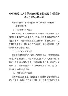 公司纪委书记主题教育暨教育整顿民主生活会个人对照检查材料根据会议安排,本人围绕以下5个方面进行对照检查:一、问题查摆情况(一)深化理论武装方面缺乏系统性。虽然能够认识到政治理论学习的重要性,也能够按照党委理论中心组安排进行学习,但不善于联系实际思考内在的逻辑,不善于把理论应用在具体的纪检监察工作中,缺乏辩证思维能力,理论学习存在片面化、碎片化的问题,没有有效发挥理论的指导作用。(二)筑牢对党忠诚方面我坚定不移的拥护两个确立的决定性意义,始终在思想上政治上行动上同以XXX同志为核心的党中央保持高度一致。但是在过程中存在老好人思想。在检查指导工作中,对存在的问题和不足,总是避重就轻,对不良现象也是睁只眼、闭只眼,甘当老好人的思想在作怪。(三)锤炼过硬作风方面主体责任落实有差距。对纪检监察干部教育监督管理存在信任大于监督、体谅大于严管的问题,往往用工作交流代替思想交流,对个别同志不敢监督、不愿监督等苗头性问题缺乏严肃有力的批评教育,对纪检监察干部队伍作风问题抓的不紧,没有做到防微杜渐、未雨绸缪。在督促班子成员履行一岗双责方面不经常,作为履行监督推动落实全面从严治党主体责任的人,自己示范作用不明显,在一定程度上这也是灯下黑。特别是对*的监督管理方面,过于迁就,关键是时候没有把公司管理规章制度挺在前面,对项目班子监督教育少,侧面说教多,问责少,造成班子管理疲软、推诿扯皮、致使工期滞后连续被业主约谈。(四)勇于担当作为方面担当意识还不够强。对改革发展大势上有些政策吃不准、摸不透,致使出现本领恐慌、能力不足等问题,对分管工作抓的不够积极主动,没有举一反三抓好全面落实。执纪监督的能力不够强硬。履职能力不能很好地适应当前新形势新任务的要求,公司监察队伍的整体水平需要提升,与所应担当任务的要求存在差距,执行规定过程中存在畏难情绪,执行纪律的尺度把握不准确。对分管领域没有很好的做到履职尽责,很少主动到项目一线深入检查发现问题,致使出现了**在公司不知情的情况下违规*。(五)强化严管责任方面在党风廉政建设工作中,我始终坚持抓不好党风廉政建设就是不称职,党风廉政建设出了问题就是渎职的原则,深化党风廉政建设责任制的落实。但还是存在一些不足之处。一是落实党风廉政建设一岗双责还不够到位对分管工作强调抓好落实的多,对党风廉政建设强调少、要求少、过问少。二是落实党风廉政建设主体责任还存在不够主动的问题,把落实主体责任等同于召开会议、签订责任书,直接过问、具体研究和推动党风廉政建设工作少,具体指导和检查落实不够。二、整改措施(一)深化理论武装方面强化学思践悟,夯实思想基础。把教育整顿与主题教育紧密结合,始终坚持以XXX新时代中国特色社会主义思想凝心铸魂,不断强化理论武装,潜心研读理论读本,逐字逐句读、入脑入心学、由浅入深悟,坚持学思用贯通、知信行统一,以扎实的理论基础促进思想的开拓解放。深入学习纪检监察业务知识,用好调查研究的工作法宝,做到业务精通、克服本领恐慌。把思想政治工作贯穿监督执纪各环节,坚持以学铸魂、以学增智、以学正风、以学促干,使自己不断提升能力,解放思想,实事求是,做一名学习型干部。(二)筑牢对党忠诚方面忠诚履行职责,加强队伍建设。组织三公司纪检监察干部认真学习、深刻领会XXXXXX在二十届中央纪委一次全会上的重要讲话精神,持之以恒不松劲,重整行装再出发。(三)锤炼过硬作风方面改进工作作风,坚决落实主体责任。进一步发挥领导班子的模范带头作用,加强纪律建设,把守纪律,讲规矩挺在前面。督促班子成员履行好一岗双责,带头遵守中国共产党廉洁自律准则和纪律处分条例,把准则的各项要求印在心中,落实在实际行动上,始终做到严于律己,廉洁从政,身体力行,做好表率,坚持理想信念宗旨,永葆共产党人清正廉洁的政治本色。要强化责任担当,大力整治庸懒散等问题,切实把落实作为履职尽责的本分、把重实干作为成就事业的基础、把办实事作为造福于公司的追求、把求求实效作为一切工作的目标,把公司领导班子和中层队伍打造成精神更振奋、作风更清新、工作更务实的战斗队伍。(四)勇于担当作为方面强化担当作为,认真履职尽责。主动扛起全面从严治党主体责任,积极担当作为,努力做好分管领域的各项工作,做到知责于心、担责于身、履责于行。要坚持在实践中锻炼自己,发扬求真务实的工作作风,对纪检监察工作进行系统安排,整体推进。面对千头万绪的工作,学会运用科学思维和科学方法,分清主要矛盾和次要矛盾,善于统筹兼顾,学会弹钢琴。(五)强化严管责任方面强化两个责任落实,细化夯实党支部的主体责任、党支部书记的第一责任和党委班子成员的一岗双责责任,确保从严治党各项任务落到实处。严密关注四风新动向、新表现,持续重拳整治各类隐形变异的四风问题,特别是形式主义、官僚主义问题。多到基层一