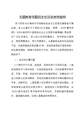 主题教育专题民主生活会发言提纲 学习贯彻XXX新时代中国特色社会主义思想主题教育开展以来,本人认真学习了党的XX大报告、党章、《XXX著作选读》《XXX新时代中国特色社会主义思想专题摘编》等内容,在广泛征求意见,深入谈心谈话的基础上,坚持把自己摆进去、把职责摆进去,把工作摆进去,认真查找自身存在的差距不足,共梳理查找各类问题12条,并逐条逐项进行检视剖析,制定整改措施,明确今后的努力方向。现将个人检视剖析情况报告如下:一、存在的主要问题(一)理论学习方面。经检视,还存在两个方面的问题:一是政治理论学习有所放松,对党的理论体系、方针政策等学得不深、不透、不细,适应和引领经济发展新常态、化解经济下行压力的能力还有待提高,创造性地解决深层次矛盾问题的办法不多、措施不实。二是思想上存在把学习当成任务的想法,没有抱着学以致用的态度去学习,直到具体工作遇到困惑,从《XXX著作选读》等书卷中寻求方向时,才感到越学越有航向、越读越有滋味,实质上是被动的学用结合。(二)政治素质方面。经检视,还存在两个方面的问题:一是政治敏锐性和鉴别力还不够强,有时对社会上一些消极现象产生的负面影响认识不足、抵制不力,没有善于从政治上分析情况、思考问题、做出判断。二是对讲政治、守规矩讲得多、深思精研少,大处考虑多,细处着眼少,把行动上不出格等同于政治上合格,用行动一致代替思想一致。(三)能力本领方面。经检视,还存在两个方面的问题:一是工作方法还不够灵活,改革创新的锐气不足,在解放思想、更新观念、创新方法方面有所欠缺,习惯凭经验考虑问题和办事,工作原则性有余,创新性不够,缺乏敢为人先、勇于争先的劲头和激情,破解难题的动力还有待进一步加强。二是缺乏钉钉子精神和滴水穿石的韧劲。对干部勇于作为、敢于担当提的多、督查落实的少,还没有提出管根本、管长远的解决办法。对分管领域的疑难问题了解不深,有的决策考虑客观条件不够周全,安排布置任务要求过高,没有体谅基层难处。(四)担当作为方面。经检视,还存在两个方面的问题:一是在提出工作目标、制定工作计划、确定工作措施、检验工作成效等方面缺乏问题导向、风险意识和有的放矢的理念,接地气不够,实效性不强。对基层和群众反映的问题有时解决不够有力、不够彻底。二是习惯按部就班等文件等批示,主动服务意识有所弱化。对基层干部群众所思所想了解掌握不全不够,在顺应他们的发展愿望、服务需求、成效期盼等方面,没有服务好、服务到位。(五)工作作风方面。经检视,还存在两个方面的问题:一是在推进工作、解决问题过程中,召集会议、听取汇报得多,深入部门和一线调查研究少。在开展调研工作时,对基层的困难问题交办、转办得多,真正坐下来充分交流研究问题时间不多、沟通深度不足,缺乏解剖麻雀的精神。二是推动工作、落实任务手段不多,习惯于通过开会发文分解任务、部署工作,还是没有从文山会海中解脱出来,分管领域文件、会议数量有反弹迹象。(六)廉洁自律方面。经检视,还存在两个方面的问题:一是督促主体责任和监督责任落实的方式方法还过于传统,主要依靠集中检查、听取汇报等方式督促落实,通过集体约谈、个别打招呼泛泛要求、传导压力,针对性不强,问题导向不鲜明,在如何推动两个责任落实上的措施还不多、不硬。二是对自己要求还不够严、标准还不高,工作中有时还存在思想麻痹大意、请示汇报不及时的情况。在加强对党员干部队伍的教育管理监督上还存在宽与软的问题,发现错误苗头谈话提醒不够及时,批评教育不够严厉,被动解决问题较多、主动超前化解的较少,引导在先、教育在先、警示在先做的还不够到位。二、问题产生的原因分析一是思想境界还不够高。对政治理论学习不够,用党的最新理论成果武装头脑还有差距,特别是对党的创新理论研究得不够深、把握得不够准,学习的深入性、系统性上有差距,知识储备不足,联系实际思考还有欠缺,政治修养和理论素养还需要不断提升。二是创新意识有待增强。尽管平时工作中自己比较注重鼓励创新,但用老经验、老办法开展协调服务工作的惯性思维依然存在,特别是随着年龄的增长,在落实较大难度的具体工作时,创新突破的锐气和魄力有所弱化,创新的动力不足、视野不宽,效果不够理想。三是服务群众还有差距。觉得自己工作时间长,对基层情况了解得多,导致密切联系服务群众的意识有所淡化,特别是分管的都是机关上的工作,到村组一线与群众面对面的直接接触较少,思想深处没有把熟悉了解群众与联系服务群众有机统一起来,与群众的感情有所疏远。四是自我要求不够严格。总认为只要守住底线,不越红线,方向原则上不出错就行了,久而久之,思想上自觉不自觉地放松了对自己的要求,党性锻炼的主动性、自觉性慢慢放松了,用事务工作代替党性煅炼,没有真正把党性锻炼当成一辈子的事,长期修、经常修的意识坚持得不够一贯。三、整改措施及努力方向一是树牢四
