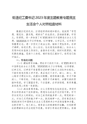 街道纪工委书记2023年度主题教育专题民主生活会个人对照检查材料根据区纪委机关、区委组织部的通知要求,我按照学思想、强党性、重实践、建新功的总要求,坚持读原著,学原文,悟原理,进一步加深了对XXX新时代中国特色社会主义思想、XXXXXX关于以学铸魂、以学增智、以学正风、以学促干等重要论述,进一步坚定了政治立场,锤炼了党性修养,在学习调研,检视反思,谈心谈话,征求意见的基础上,结合本人思想和纪检监察工作实际,查摆存在问题,剖析问题原因,制定整改措施。现将个人检视、剖析情况汇报如下,请同志们批评指正。一、存在的问题(一)理论学习方面。理论学习抓而不实。对XXX新时代中国特色社会主义思想、XXXXXX关于以学铸魂、以学增智、以学正风、以学促干等重要论述的学习缺乏主动性和自觉性,不能有效地克服工学矛盾,真正地沉下身子,耐心、细心、真心地学习理论知识,把握知识精髓、感悟精神力量,学习不够深入、不够系统、不够全面,局限于寻章摘句、点圈勾画的层面和维度,学习囫囵吞枣,不求甚解,在学深悟透、真学真懂、真信真用上还有一定差距;(二)政治素质方面。自认为理想信念比较坚定,但受外界各种因素的干扰和影响,理想信念的总开关拧得不紧,学习存在实用主义的倾向,对自己有用的就多学一点,研究的深一点,对自己无用的就少学一点,肤浅地学一点,没有真正地从XXX新时代中国特色社会主义思想的养分中汲取智慧和力量,在新形势下,克己奉公,艰苦奋斗的精神有所松懈,对创新理论的理解和应用出现脱节现象,科学引导身边党员群众,提高政治站位,坚定理想信念,提升素质修养,不断增强四个意识,坚定四个自信,做到两个维护方面,缺乏有效的方法和措施。(三)能力本领方面。在纪检监察工作中,对自己的标准和要求逐渐降低,科学应对风险挑战和困难压力方面分析研判、防微杜渐不足,缺乏大局意识、忧患意识和破冰意识。坚持刀刃向内,自我革新,自我提高的精神不强,对自身存在的一些不足和缺点,不能及时纠正弥补,缺少刮骨疗毒的勇气,敢于亮剑出鞘、敢于动真碰硬的勇气和魄力不足,一定程度上存在等靠要的思想,对社会上的一切错误言行,政治敏锐性不够,没有做到理直气壮、真刀真枪地坚决反对,攻城拔寨、闯关夺隘的精神和勇气有待加强。(四)担当作为方面。作为区纪委书记,从思想上对履行纪检监察工作比较上心,对执行纪律、监督干部的工作重视有余,对涉及群众切身利益的工作关注不足。比如,在保障改善民生、惠民政策落实,查处侵害群众利益问题上,忽略了纪检监察工作与群众工作的关系,以人民为中心的发展思想树得不够好,单纯考虑本职工作,缺乏统筹谋划、调查研究和全面协调。在具体工作落实上执行力不强,安于现状,仅仅满足己有成绩。面对突出问题和棘手问题时,存在畏难情绪,缺乏敢死拼命、苦干实干、争先进位的拼搏精神,开拓创新、知难而上的意识有待于进一步加强。(五)工作作风方面。开展调查研究的作风不够扎实,深入基层和农村实际,了解群众所急,所盼,所想少,未能很好地把情况吃准摸透,做群众的贴心人还不到位。在查处侵害群众利益问题时,坚持零容忍、无禁区、全覆盖原则不强,畅通渠道,深挖线索、严查快办、加强指导、强化督办等方面,力度和强度不大。(六)廉洁自律方面。对加强全区党风廉政建设和反腐败工作力度还不够大,扶贫等重点领域行业整治还不够彻底,不够到位,抓常抓长抓细抓实的运行机制还不够健全完善,对部分窗口单位干部存在在串岗溜岗、聊天闲谝、作风散漫、精神涣散、办事拖拉等问题,查摆力度不大不强不细,更好讲求政治效果,激励干部担当作为上还有不足。二、存在问题的原因 (一)党性锤炼不到位。在加强党性修养上下的功夫还不够深,经常性对照党章党规党纪,自我净化,自我完善,自我革新,自我提高的主动性还不够,在模范带头树立党员意识、榜样意识、党章意识方面淡化衰减,对社会上的一些不良风气,缺乏斗争精神,艰苦奋斗,勤俭节约的意识有所减弱。 (二)为民服务不到位。在联系群众的频次和群众感情交流上做得不够,习惯于在办公室遥控指挥、听取汇报、处理事情,解决问题缺乏深入群众、甘干奉献、吃苦耐劳的精神,以人民为中心,服务群众的意识和公仆意识逐渐淡化,和群众交心谈心少了,没有切实做到为群众所想,为群众所急,紧密结合纪检监察工作实际,持续增强人民群众的获得感幸福感安全感。 (三)自律意识不到位。虽然能够严格按照为民、务实、勤廉、高效的准则,约束自己、规范言行,依法依规办事,在廉洁自律方面做到坚持原则,在大是大非面前能够坚定立场,但在工作中批评和自我批评的勇气不足,未能经常绷紧纪律之弦,未能时时处处以党员领导干部,纪检监察干部的行为规范,严格要求自己,作表率,没能经常过滤清理自己的思想,反思自己行为,缺乏接受监督的主动性,不违反原则,就心安理得,对加强作风建设的经常性还未做到持