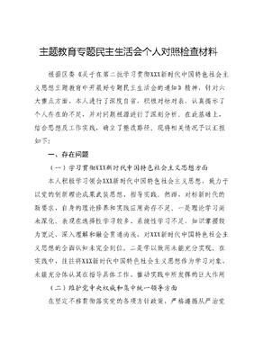 主题教育专题民主生活会个人对照检查材料根据区委《关于在第二批学习贯彻XXX新时代中国特色社会主义思想主题教育中开展好专题民主生活会的通知》精神,针对六大重点方面,本人进行了深度自省,积极对标对表,认真揭示了个人存在的不足,并对问题根源进行了深刻分析。在此基础上,结合思想及工作实践,确立了整改路径。现将相关情况予以汇报如下:一、存在问题(一)学习贯彻XXX新时代中国特色社会主义思想方面本人积极学习领会XXX新时代中国特色社会主义思想,致力于以党的创新理论成果武装思想、指导实践。然而,对标新时代的新要求,自身的理论修养和实践应用尚存不足。一是理论学习尚未深化。表现在选择性学习较多、系统性学习不足,知识掌握较为宽泛、深入理解和融会贯通尚浅,对XXX新时代中国特色社会主义思想的全面认知未完全到位。二是学以致用未能充分实现。在实践中,往往将XXX新时代中国特色社会主义思想作为学习对象,未能充分体认其在指导具体工作、推动实践中所发挥的巨大作用(二)维护党中央权威和集中统一领导方面在坚定不移贯彻落实党的各项方针政策,严格遵循从严治党的指导原则,恪尽职守地执行一岗双责,并且严格实施民主集中制的过程中,尚存在一些工作短板。具体体现在对党委重大决策执行时,缺乏创造性的工作方法,未能充分展现前瞻性策略及应对之道,面对复杂问题时手段和解决办法有限,未能彻底平衡好局部与整体的利益关系,体现出一定程度的本位主义倾向。在注重分管单位利益和强调自身困难方面多有考虑,而对全局的认识和把控不足。在日常工作中,虽然按部就班地开展了规定动作,但对自选动作的创造性实践不够积极,从而影响了政策执行的效果,使得成效不够明显,整体落实工作有待加强。(三)对照践行宗旨、服务人民方面本人恪守以民为本的理念,全面落实新发展观。然而,深入基层进行调研工作的频率尚未达到预期,贴近实际程度有限出于对基层负担的考量,实地走访指导的次数较少,对业务的具体指导尚显不足,完善与基层沟通的通道仍需努力,针对民众实际问题探索解决方案的方法还需进一步创新。(四)求真务实、狠抓落实方面本人坚决执行上级的政策指示,在维护政治原则的关键时刻与党中央保持高度一致,本着务实的态度扎实工作,敢于负责,勇于担当。然而,对照党员干部在新形势下所需具备的斗争能力新标准,仍有不足之处。一是在攻坚克难的动力上有所欠缺,对于主动担当、积极作为的态度尚需加强;工作的落实和细化不足面临复杂问题时有观望和求稳的心态。在工作中创造性不足,未能经常与先进对标,自我驱动力和自我要求稍显放松。例如,在今年的居民医疗保险征缴工作中,对疫情和政策调整可能引起民众心理波动的预判不足,宣传和引导工作力度不够,导致缴费进度滞后。二是底线思维意识不够坚固。在日常业务工作中,对提升政治素质、保持警觉性的紧迫感有所松懈,对意识形态领域斗争的尖锐性和复杂性理解不够深刻,斗争意志尚显不足坚定,尚未做到在斗争中勇敢坚决、善于应对。对于风险防范的忧患意识还需要进一步增强,尤其是在关注分管部门重点风险人员方面,未能时刻保持高度关注。(五)以身作则、廉洁自律方面一是自律意识尚显薄弱。本人虽严格遵守中央八项规定的各项要求,但在深化廉洁自律方面,尚未形成足够的防患意识,有时误以为非原则性错误、未触及法律红线的行为不必过分关注,缺乏严格自我约束的机制。二是压力梯次传递不够明确。在廉政风险防控方面未能持之以恒,存在时紧时松的现象,未能时刻保持高度警觉,日常监管中存在宽容心态,对直属部门出现的预警性、趋势性问题掌握不够及时,对于落实纪检监察的第一种形态未能全面到位。(六)履行全面从严治党政治责任方面本人恪尽职守,积极履行岗位责任及廉政建设双重职责,不断深化对党纪国法的学习,坚守廉洁自律的底线,努力提升防范腐败和风险的能力。然而,在实践全面从严治党的要求上还有所欠缺,纪律执行的严格性尚待加强。未能始终将政治纪律和规矩置于首位,对党的纪律要求缺乏持续学习和深刻反思。在落实主体责任上尚未做到位,对所管辖部门党员干部的教育与管理尚缺乏精准深入,严格监管与真抓实干还需增强。二、问题产生的原因(一)理想信念之基不牢固。关于学习态度,自我驱动力、前瞻规划与自发性均显不足。对于提升个人素养的重要性缺乏深刻认识,未能将学习视为增长才干、提高素质的重要渠道,未曾将之置于工作优先之列。日常学习活动,倾向于浅尝辄止,缺乏深度思考,学习成效未显系统化与全面性。(二)政治站位尚不高远。政治站位对识别、分析及解决问题的能力与水平影响深远,问题之所在,源自政治觉悟未达标准工作中过于局限于任务完成与落实本职工作,未能从大局出发综合考虑与应对问题。面对复杂形势,未能始终以政治站位思考与行动,强化政治意识,提高政治能力在实际行动中尚未得到充分体现。(三)担当意识未充分展现。新发展阶段面前,未