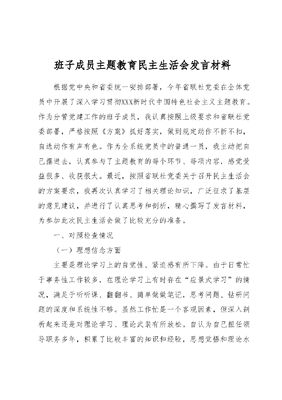 班子成员主题教育民主生活会发言材料根据党中央和省委统一安排部署,今年省联社党委在全体党员中开展了深入学习贯彻XXX新时代中国特色社会主义主题教育。作为分管党建工作的班子成员,我认真按照上级要求和省联社党委部署,严格按照《方案》抓好落实,做到规定动作不折不扣,自选动作有声有色。作为全系统党员中的普通一员,我主动把自己摆进去,认真参与了主题教育的每个环节、每项内容,感觉受益很多、收获很大。最近,按照省联社党委关于召开民主生活会的方案要求,我再次认真学习了相关理论知识,广泛征求了基层的意见建议,并进行了认真思考和剖析,精心撰写了发言材料,为参加此次民主生活会做了比较充分的准备。一、对照检查情况(一)理想信念方面主要是理论学习上的自觉性、紧迫感有所下降。由于日常忙于事务性工作较多,在理论学习上有时存在应景式学习的情况,满足于听听课、翻翻书、简单做做笔记,思考问题、钻研问题的深度和系统性不够。虽然工作忙是一个客观因素,但深入剖析起来还是对理论学习、理论武装有所放松。自认为自己担任领导职务多年,积累了比较丰富的知识和经验,思想觉悟和理论水平比普通干部群众要高一些,学习不学习坐到台前都能讲出个一二三来,从而导致学习的自觉性下降了、紧迫感不强了。(二)政治纪律和政治规矩方面严格对照检查,这方面的问题我感觉主要是:现在媒体非常发达,一些网络、短信、微信平台上经常会有一些不切实际、搬弄是非的小道消息、负面新闻,偶尔会在一定程度上对自己的观点和分析问题的方法产生干扰。这实质上还是立场不够坚定的体现,认真想来,作为党员领导干部,更是要坚决抵制这方面的言论和信息,自觉坚定政治信念、筑牢思想防线。(三)作风建设方面主要是与基层同志联系沟通还不够。平时还是坐机关多、下基层少,有时即使下去了,也是时间短、行程紧,走马观花、蜻蜓点水,没有真正住下来、沉下去,和基层同志交心沟通也就少了一些;有时开展工作、处理事情出发点是好的,但由于缺少深入有效的沟通,有时感觉同基层同志还是有一定的距离,听不到真实的情况和客观的建议,对自己指导、服务基层的质量和效果产生了影响。(四)担当作为方面主要是对待自己分管工作有成绩多、不足少的现象。不论是在汇报工作,还是在班子内部开会时,有时存在报喜不报忧的现象,讲成绩长篇大论、力求精彩,讲问题特别是讲主观问题时一带而过,对一些存在的问题不能够正确对待和深刻剖析(五)组织生活方面在这方面存在的问题主要是:党支部组织生活会的质量还有待进一步提高,这是我参加支部组织生活时的一个感受,现在的组织生活多以学习教育为主,对大政方针传达学习得多,结合工作实际解读得少;在学习交流时,党员思想上还放不开,参与上还不够积极,发言还不够主动。今年各支部都组织开展了民主评议党员活动,活动中批评和自我批评开展得还不够严肃、不够深刻,存在你好我好大家好的问题。这个问题,还需要今后持续改进和提高。(六)落实全面从严治党责任方面这方面存在的主要问题是对党建工作责任落实的督促指导还需要进一步加大力度。我们每年年初都要下发《党建工作指导意见》,系统各级之间都要层层签订《党建工作目标责任书》,已经基本上形成了一级抓一级、层层抓落实的工作格局。但各级责任具体落实得怎么样,是不是做到了真管真严、长管长严,各项党建工作措施是不是真正落实下去了,是不是中间还有做选择、搞变通、打折扣的现象,这些工作都还需要进一步加大督促指导检查考核的力度。二、产生问题的原因分析(一)党员意识有所淡化。虽然政治觉悟、政治意识在不断增强,但党员干部、特别是领导干部的意识也在增强,普通党员的意识逐渐淡化,在潜意识里以领导干部自居和摆位,有时不再把自己作为一名普通党员来看待和要求。(二)精神斗志有所消退。这几年年龄大了几岁,有时候存在等靠拖沓、因循守旧的念头,工作的激情逐渐消退,创先争优较真碰硬、拼搏进取的斗志,自身纵向来比大不如前,因此就会出现学习提高紧迫感不强、工作得过且过标准不高、深入基层研究解决问题不够等现象。(三)从严自律有所放松。随着年龄和职务的增长,更多的是给别人提要求、讲纪律,对自己的言行约束有时放松了要求,更多地注重一些政治性、是非性、原则性的纪律规范和规章制度却在日常一些具体工作的落实上放松了要求。三、今后的努力方向和改进措施(一)加强学习修养,进一步坚定理想信念进一步坚定入党时的理想信念,严守党的政治纪律和政治规矩,做到政治信仰不变、政治立场不移、政治方向不偏。同时,还要不断加强品行修养,筑牢三观,经常清扫思想和内心的浮尘,做到正确看待功名地位、正确对待利益得失、正确处理公与私的关系,始终保持一名共产党人的政治本色。(二)加强制度落实,进一步规范党建工作今后,我将首先带头落实好各项纪律规矩和规章制度,为广大干部职工做出表率;同时,要严格按照各项规章制度推进系